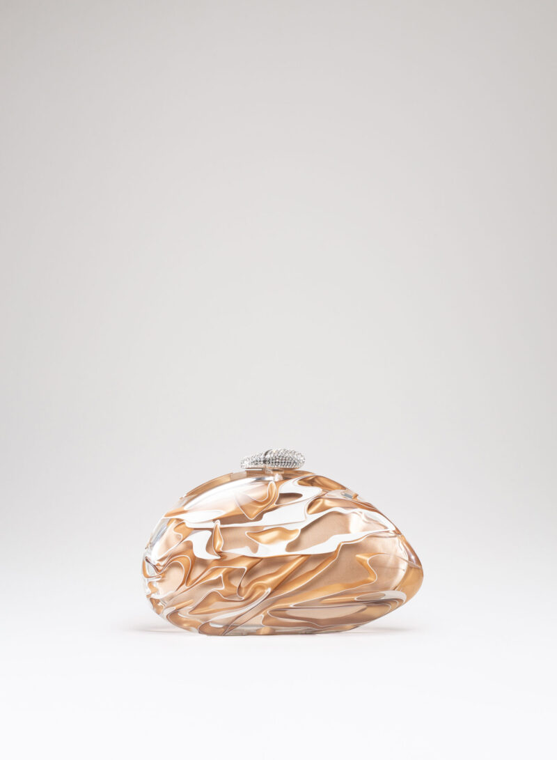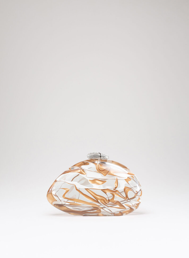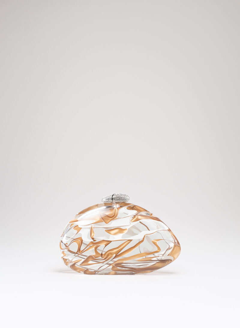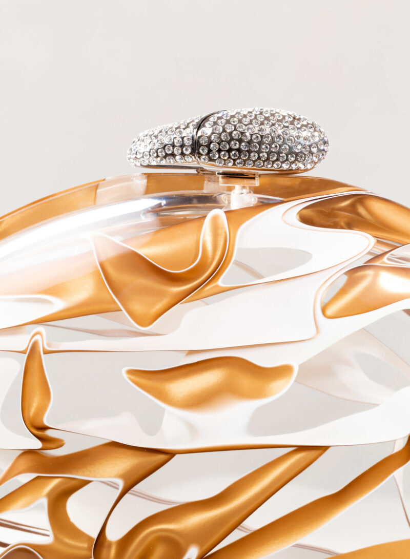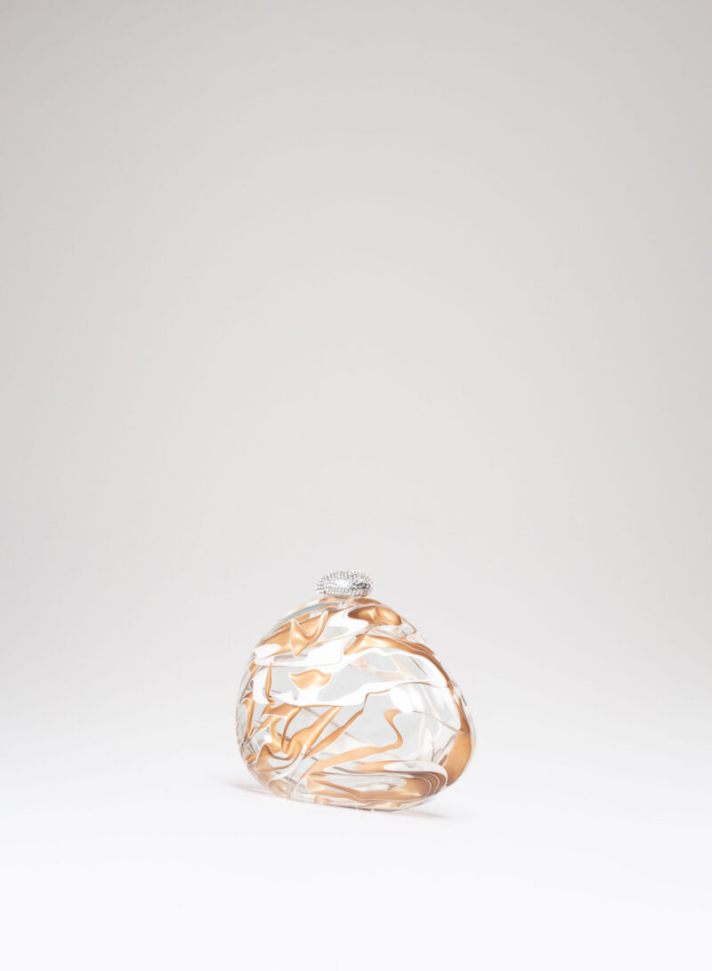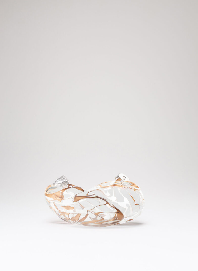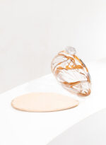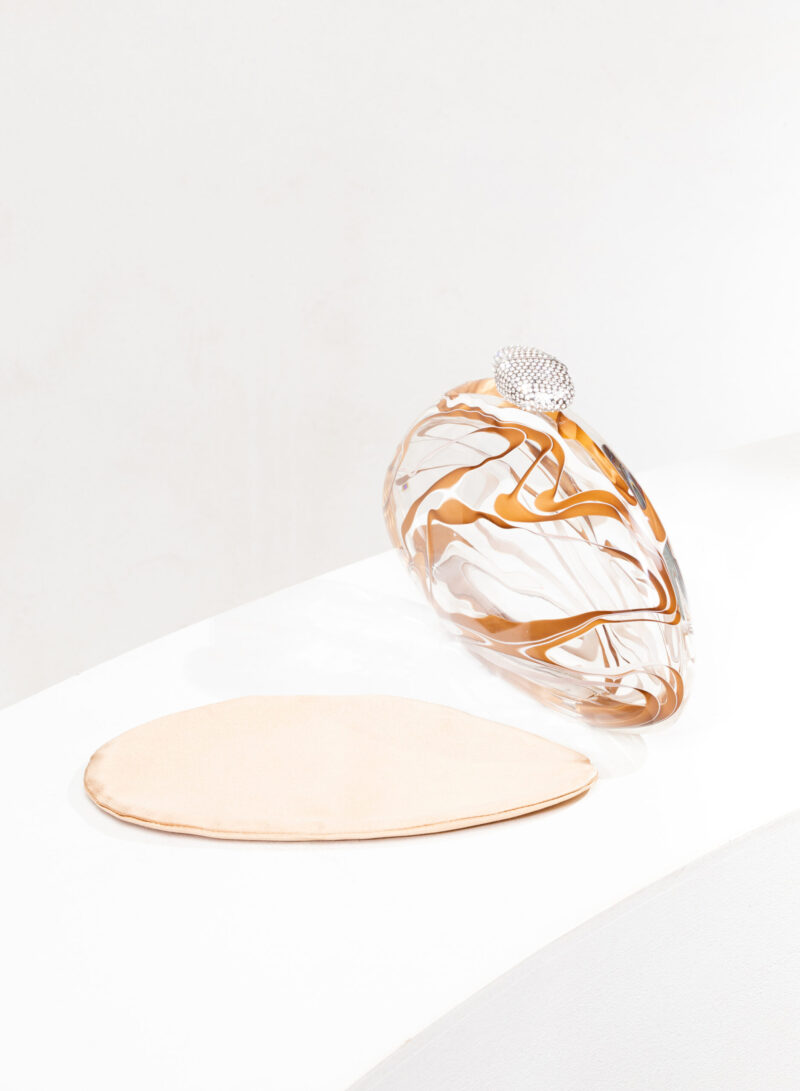 Una bolla d’aria e di colore che è il risultato della scultura e della levigatura di pannelli di metacrilato colorato, incollati e stratificati l’uno sull’altro a formare un solo blocco. La maestria di Nando (uno dei primi artigiani a lavorare il metacrilato per farne oggetti d’arte) le fa assumere quella forma aerea, organica. E solo una delicata e accorta lucidatura finale ne rivela le sorprendenti sfumature, donandole alla luce che le attiva e ne rende visibili le trasparenze.