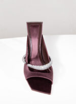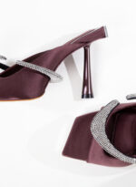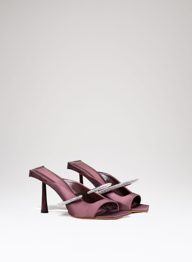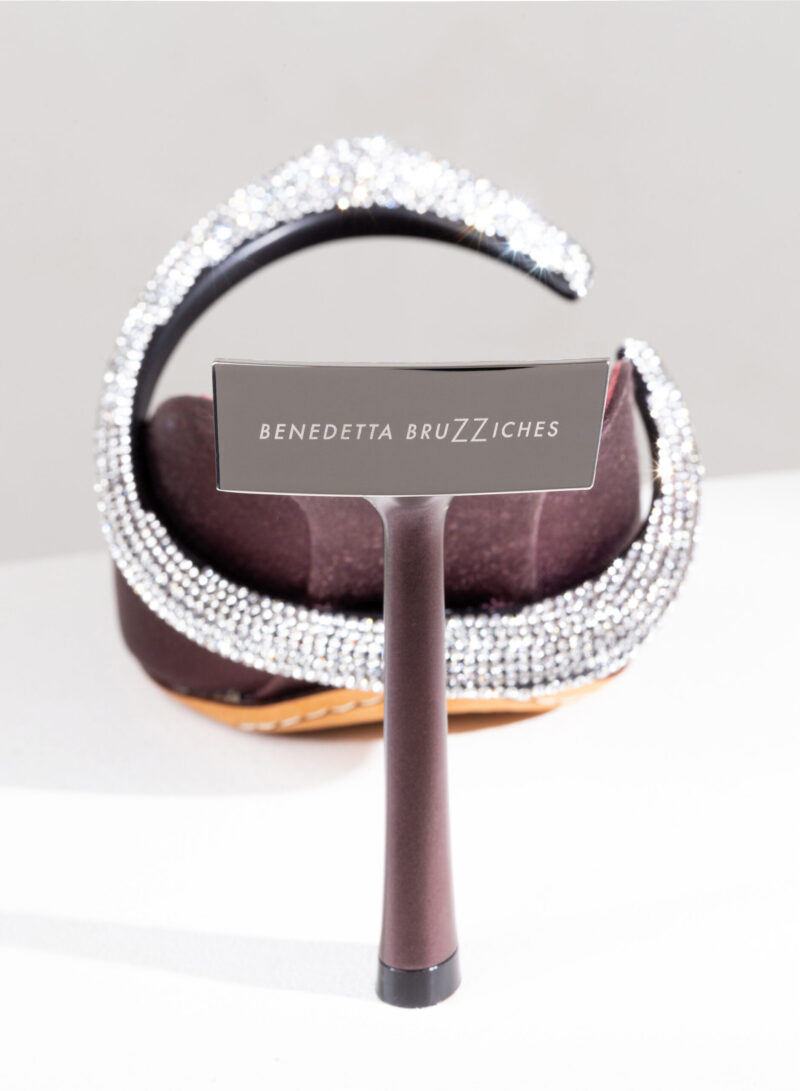 Bruna è realizzata in pura duchesse di seta, mentre l’elemento ad anello impreziosito da cristalli e che avvolge il piede è realizzato con una tecnica mutuata dall’oreficeria.