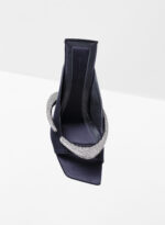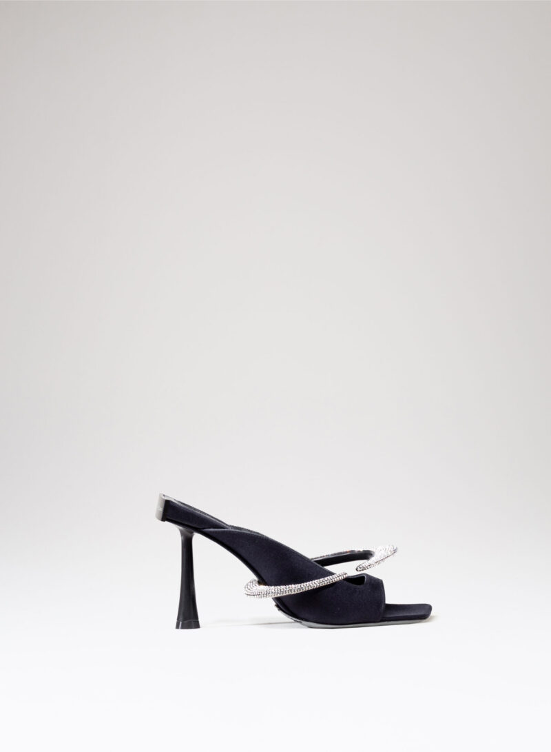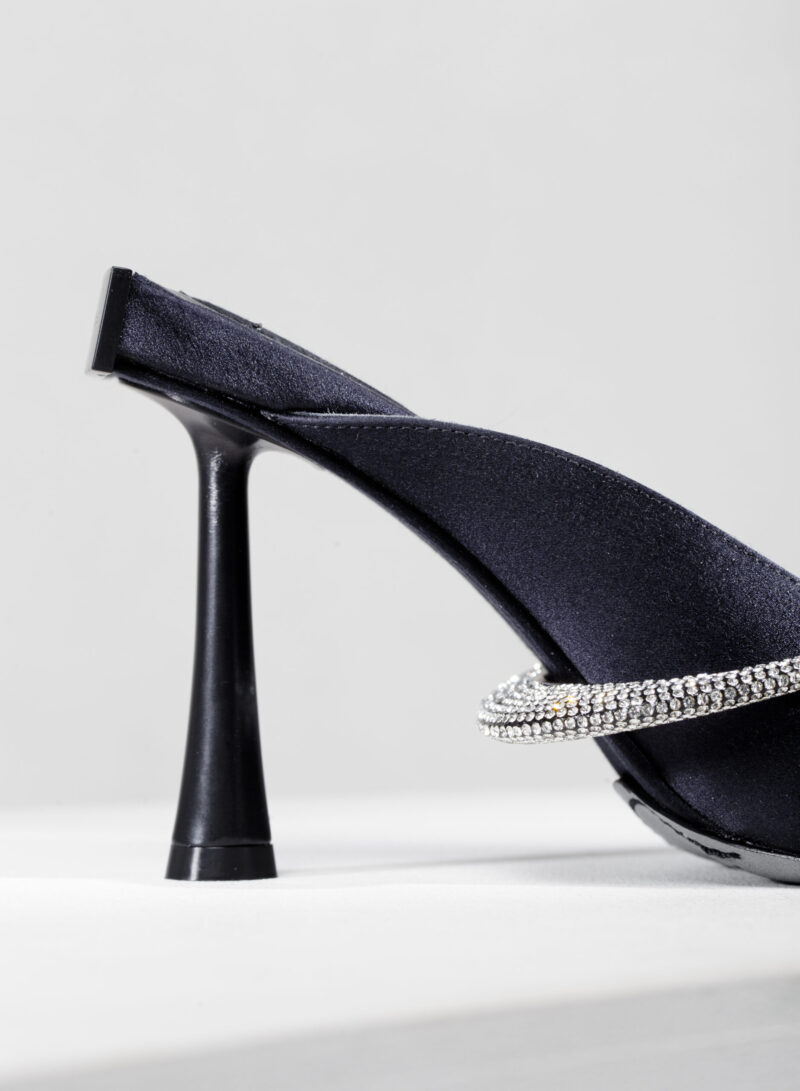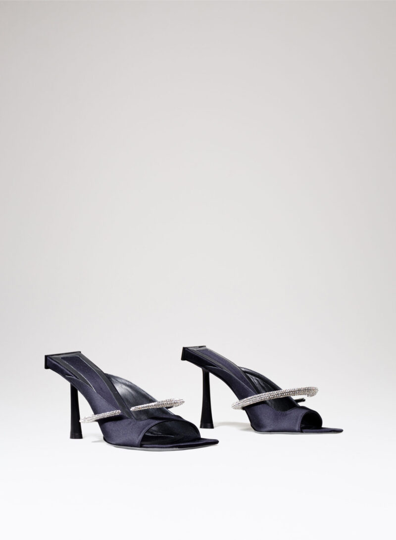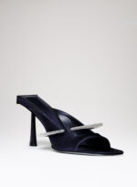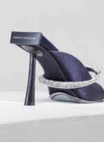 Bruna è realizzata in pura duchesse di seta, mentre l’elemento ad anello impreziosito da cristalli e che avvolge il piede è realizzato con una tecnica mutuata dall’oreficeria.