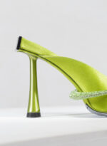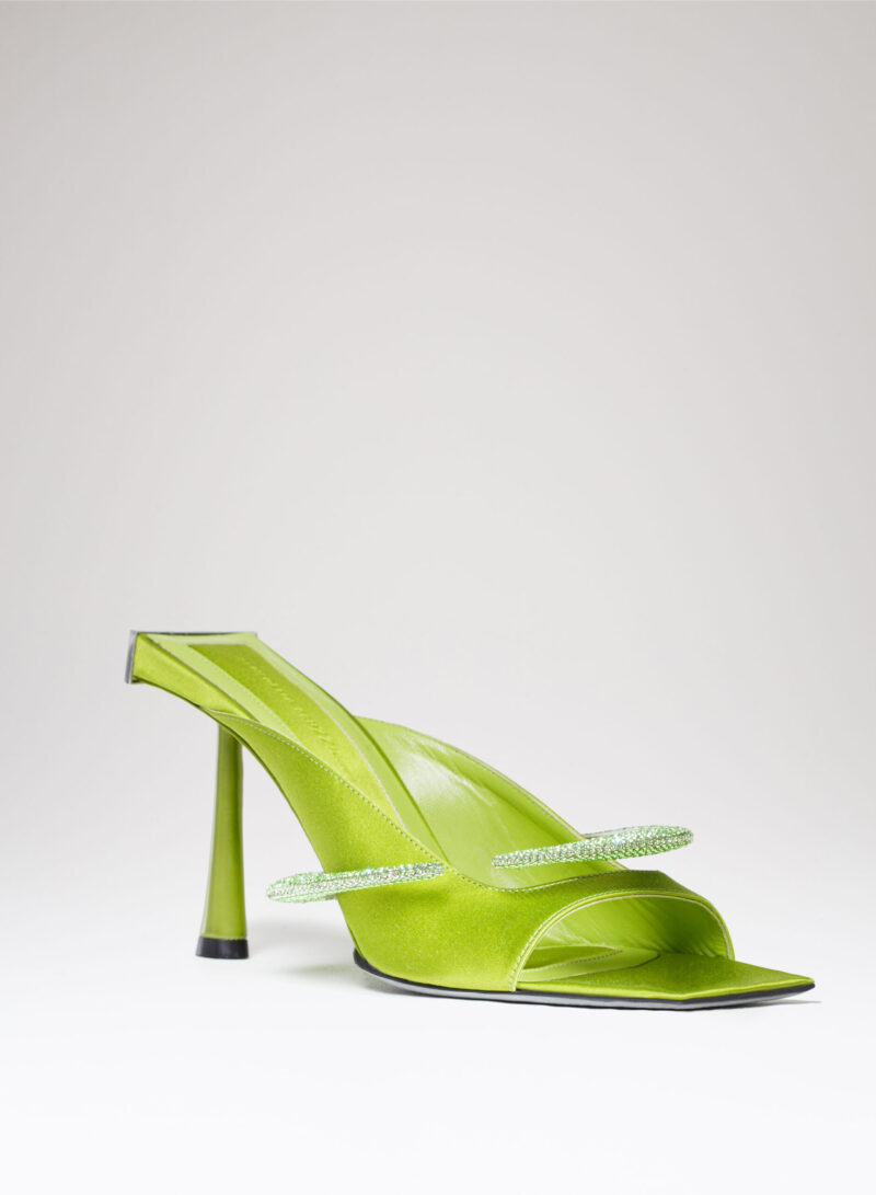 Bruna è realizzata in pura duchesse di seta, mentre l’elemento ad anello impreziosito da cristalli e che avvolge il piede è realizzato con una tecnica mutuata dall’oreficeria.
