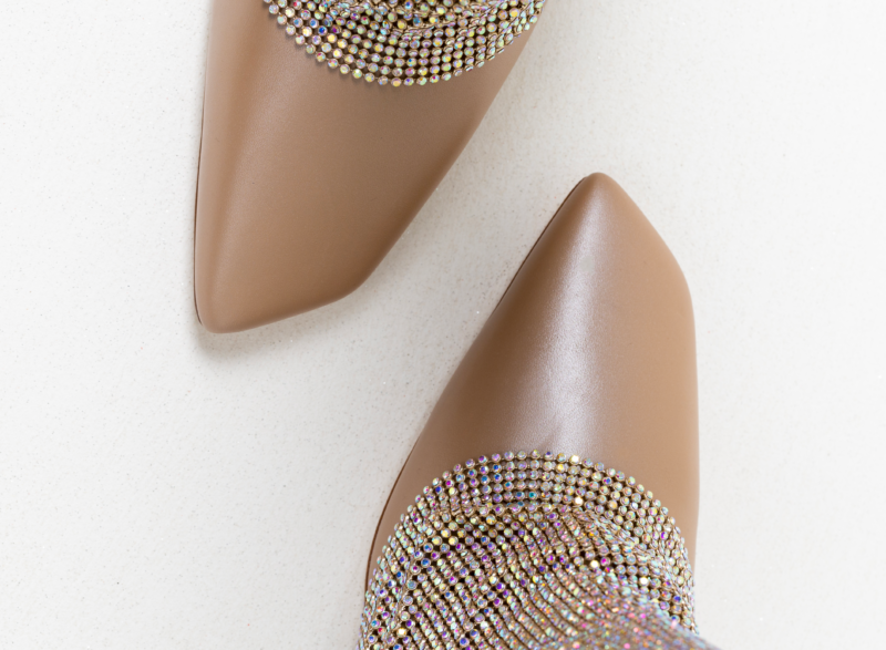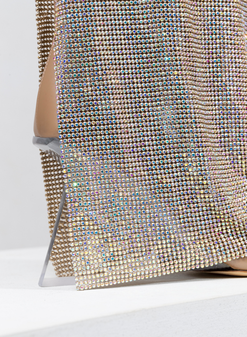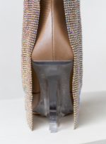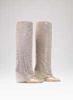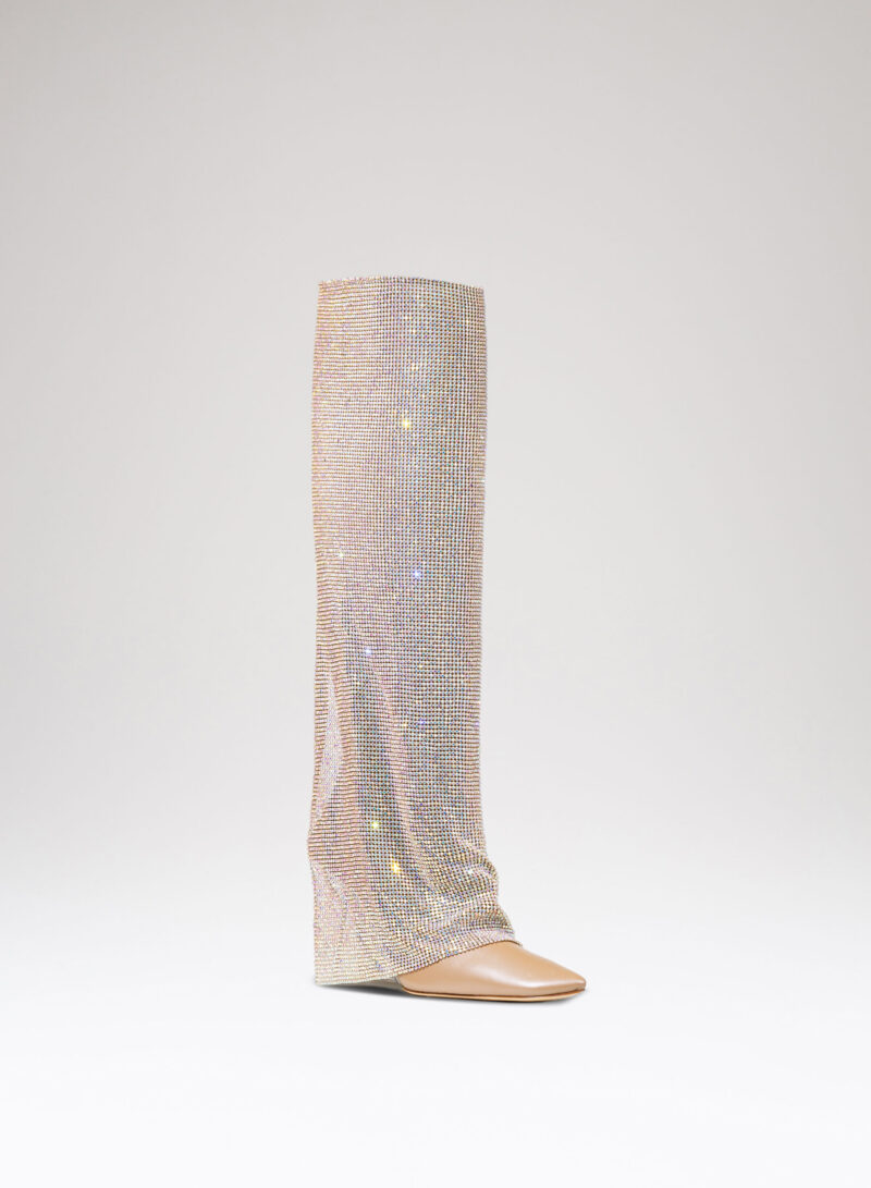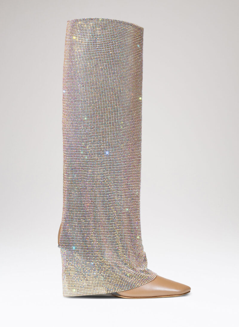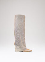 Lo stivale Christine in pelle di vitello stupisce con la sua zeppa in plexiglass ed il drappo in crystal mesh.