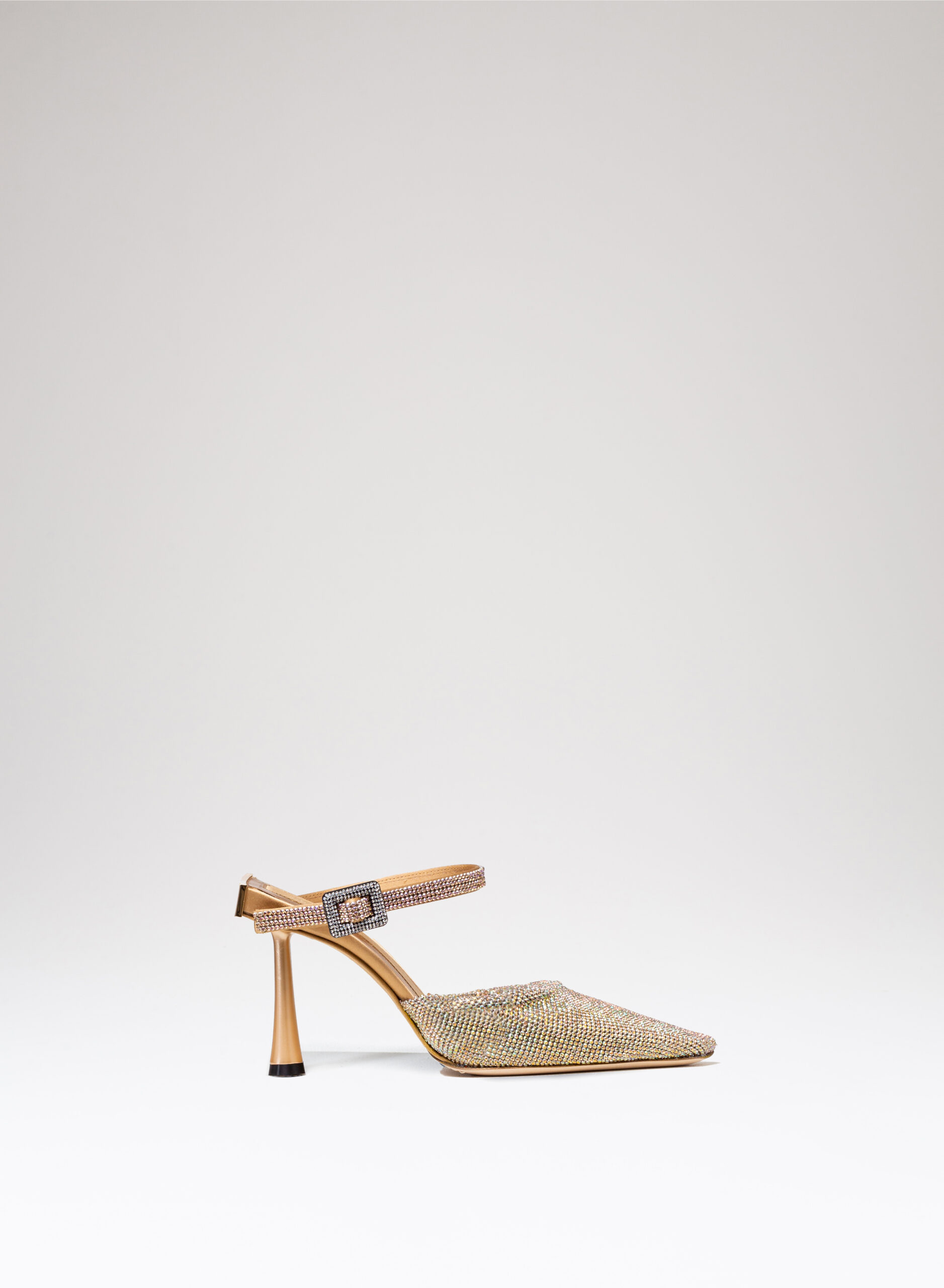 I miei amici più cari hanno rischiato di ignorare l’esistenza di Elena Ferrante, una delle scrittrici italiane più misteriose e con un talento inarrivabile. Elena ricorda la creatività e la genialità di un’artista che ha sempre nascosto la sua identità con uno pseudonimo, ma che continua ad affascinarmi con la sua allure misteriosa. Elena è una creazione con una struttura rivestita in raso ed una tomaia in maglia metallica con cristalli. Il tacco di questo object d’heart richiama la forma della mia iconica Ariel. Completa la scarpa un elegante cinturino con fibbia ricoperta di cristalli.