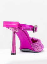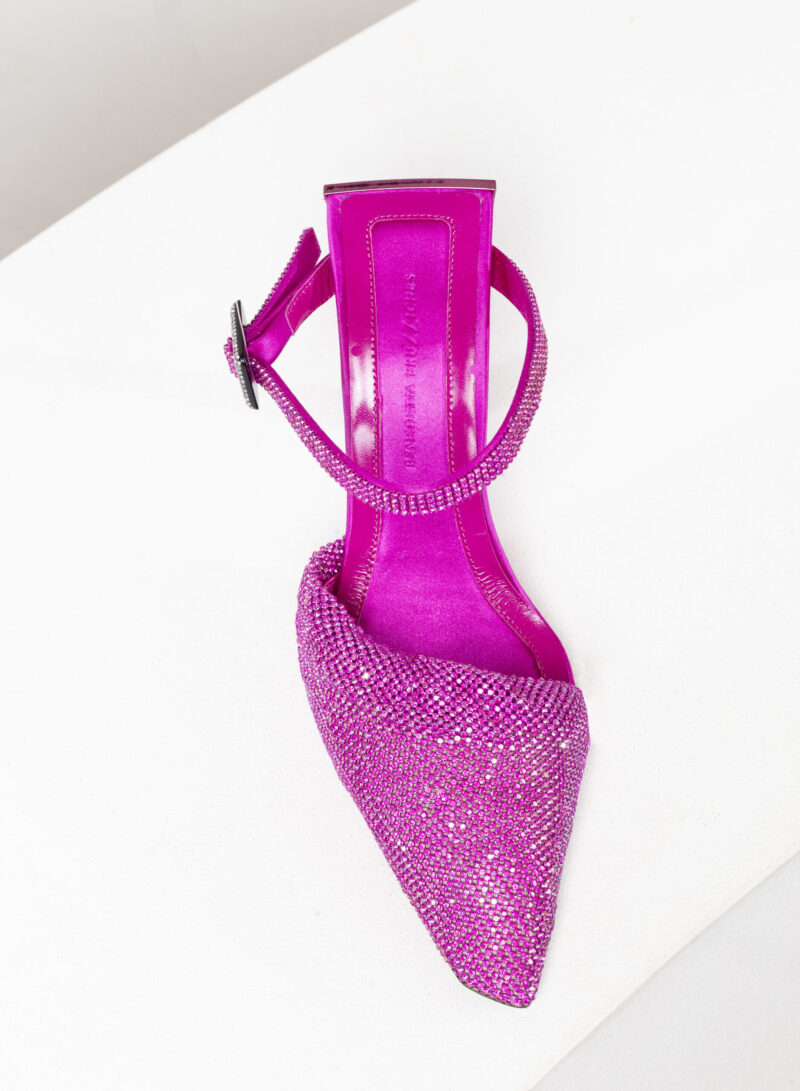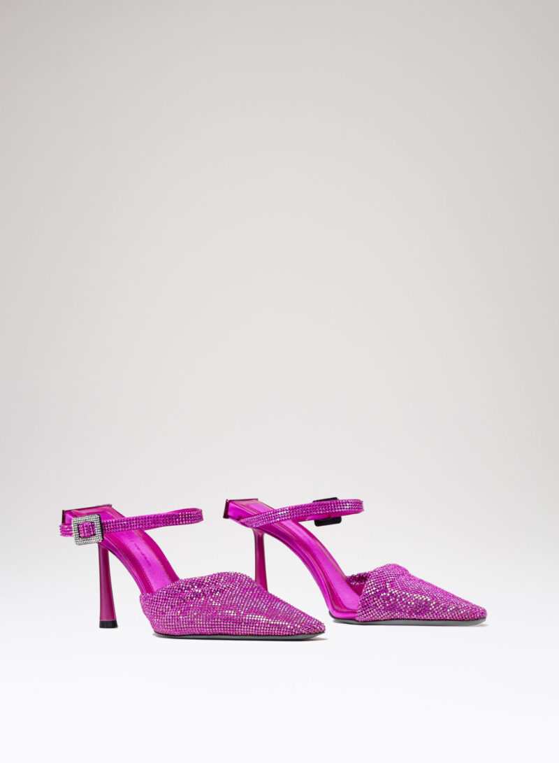 Elena è una creazione con una struttura rivestita in raso ed una tomaia in maglia metallica con cristalli. Il tacco di questo object d’heart richiama la forma della mia iconica Ariel. Completa la scarpa un elegante cinturino con fibbia ricoperta di cristalli.
