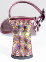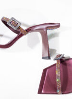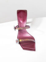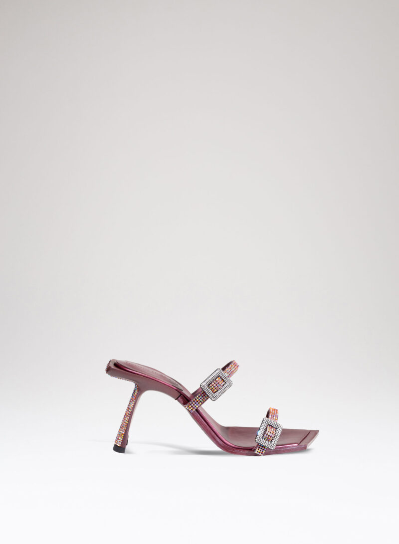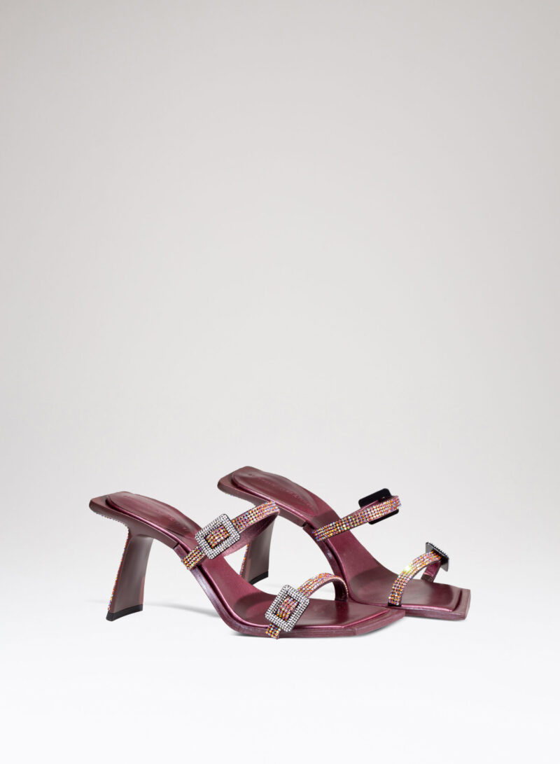 Due fasce di raso ricoperte di crystal mesh abbracciano elegantemente il piede, mentre il tacco inclinato diventa un palcoscenico inesplorato per la sperimentazione della luce.
