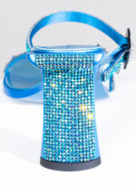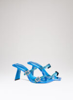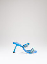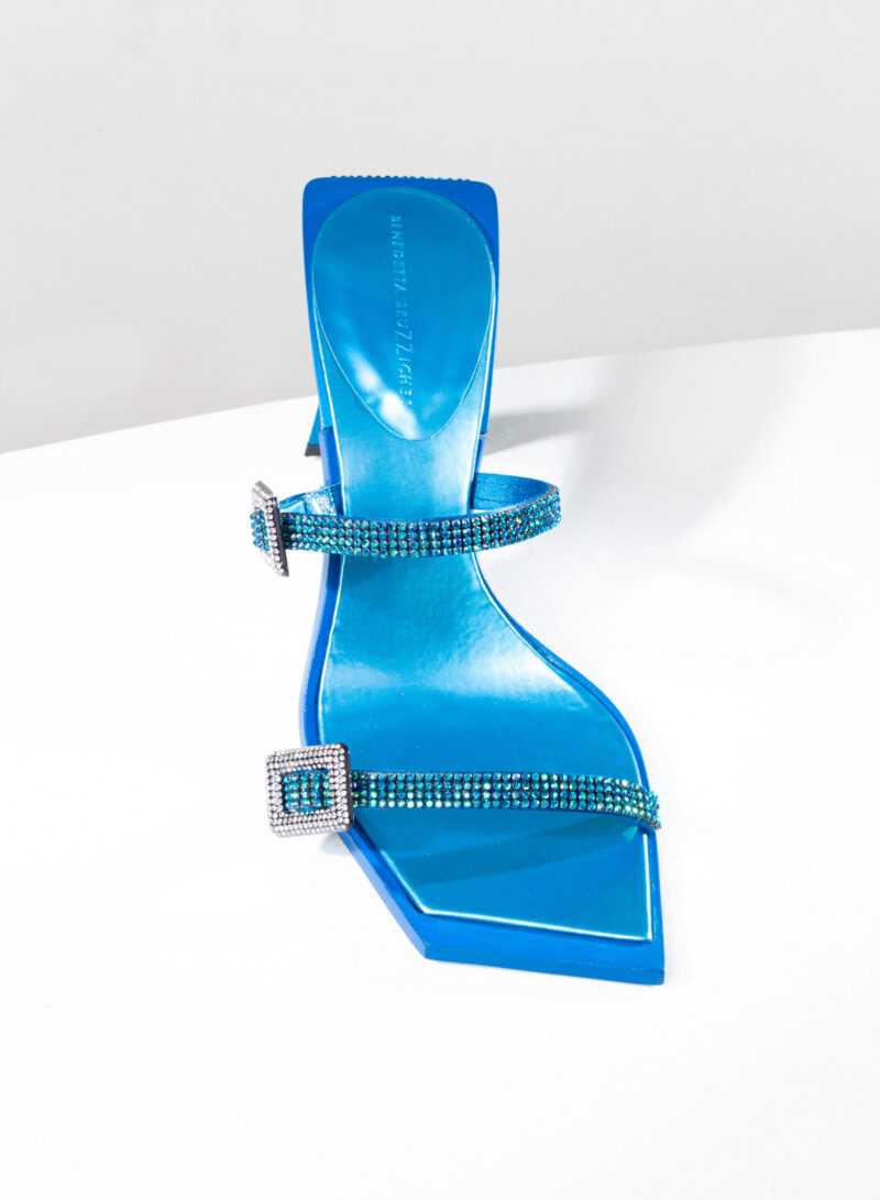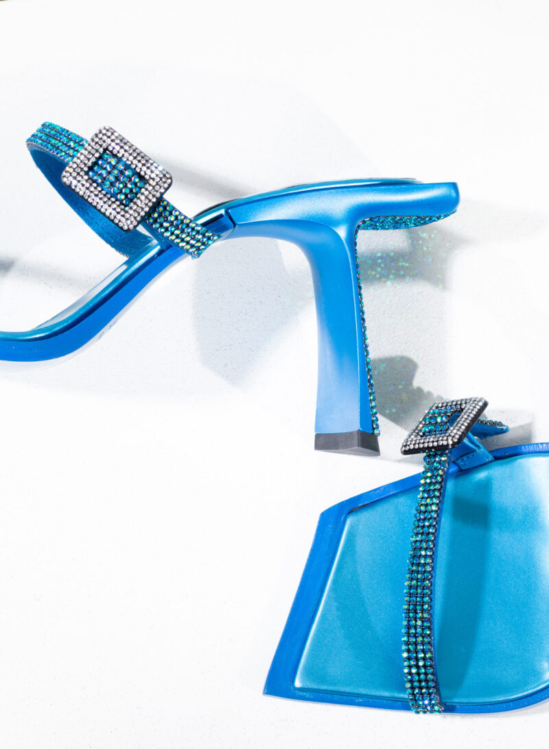 Due fasce di raso ricoperte di crystal mesh abbracciano elegantemente il piede, mentre il tacco inclinato diventa un palcoscenico inesplorato per la sperimentazione della luce.