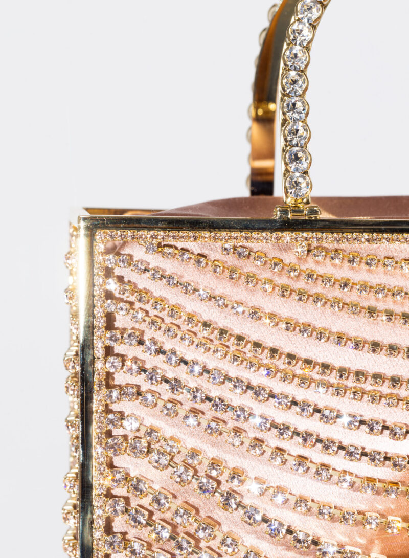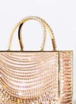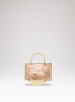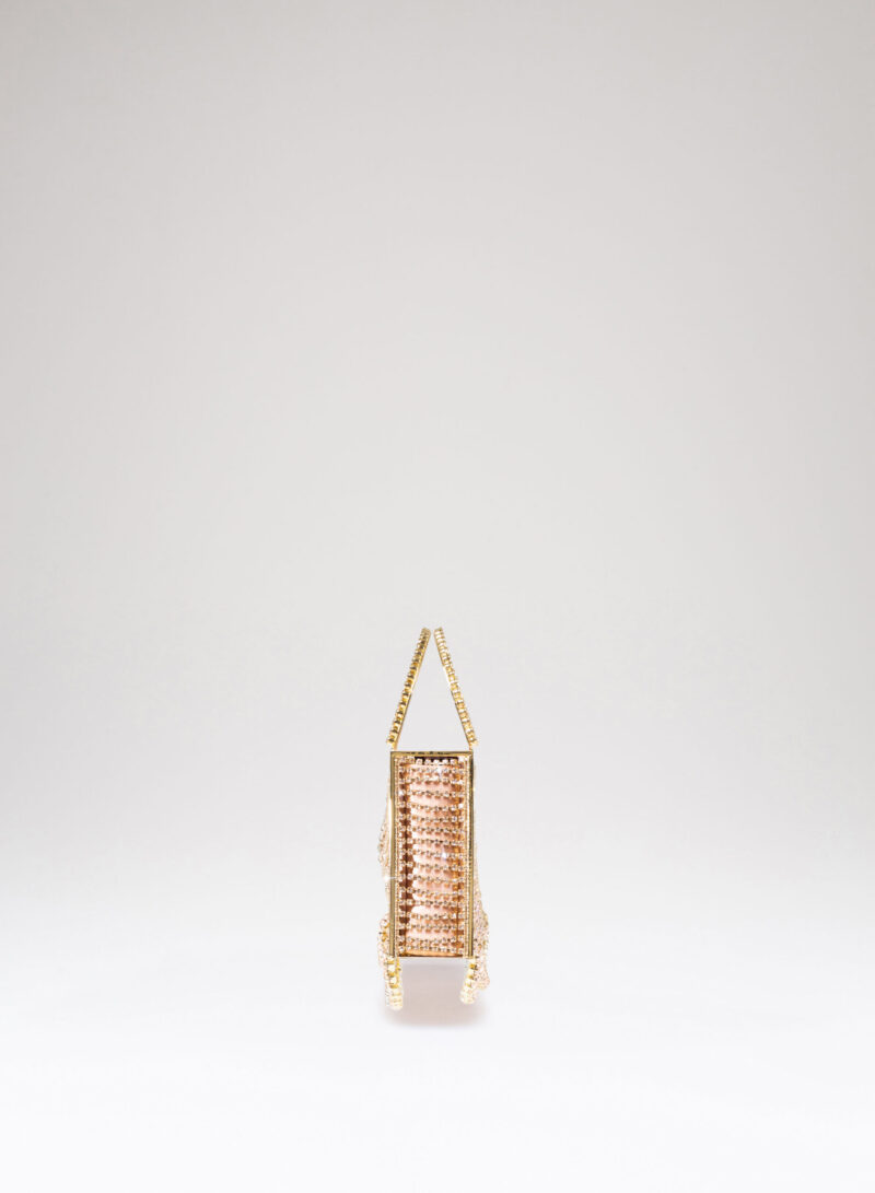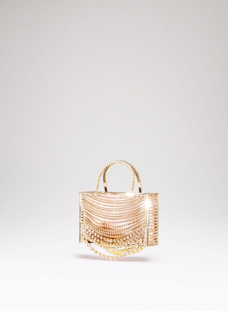 La micro tote Giulietta degli Spiriti è completamente realizzata a mano dai nostri artigiani orafi di Arezzo, adornata con un elegante degradé di catene di cristalli di varie dimensioni. All’interno ospita un sacchetto di morbida organza per contenere gli effetti personali.