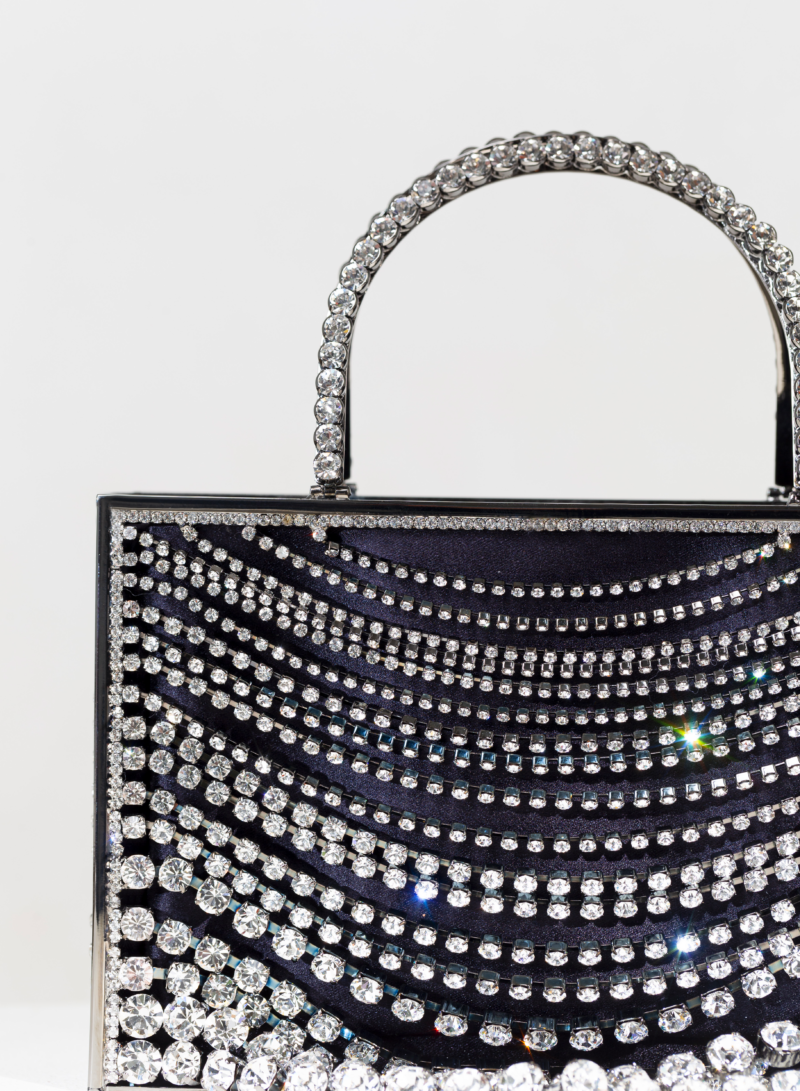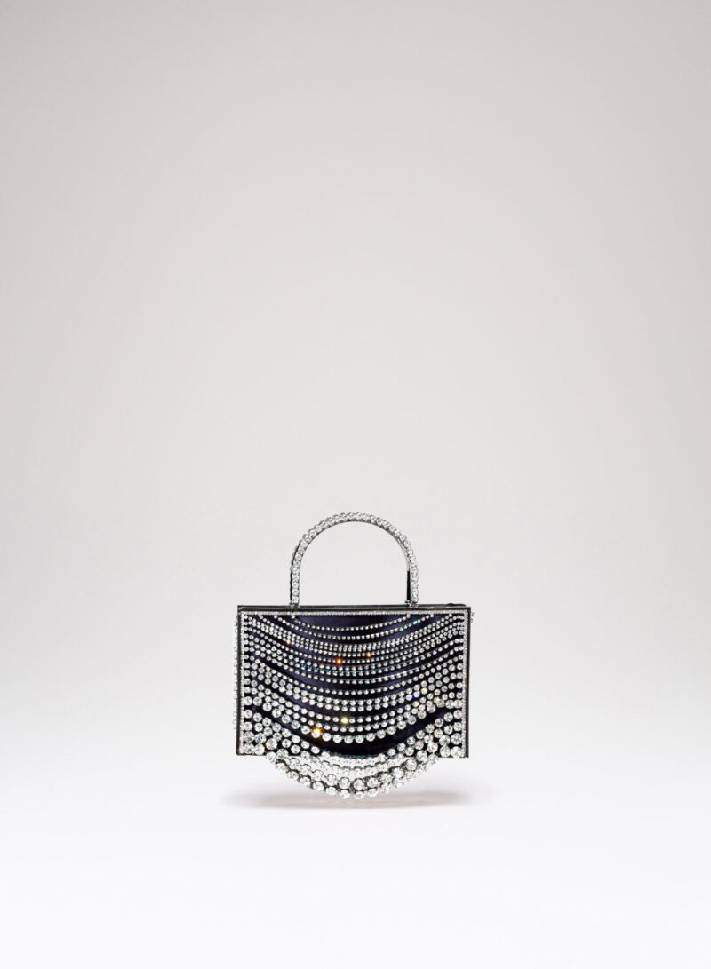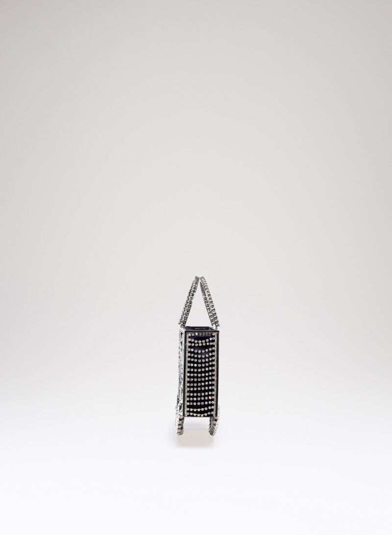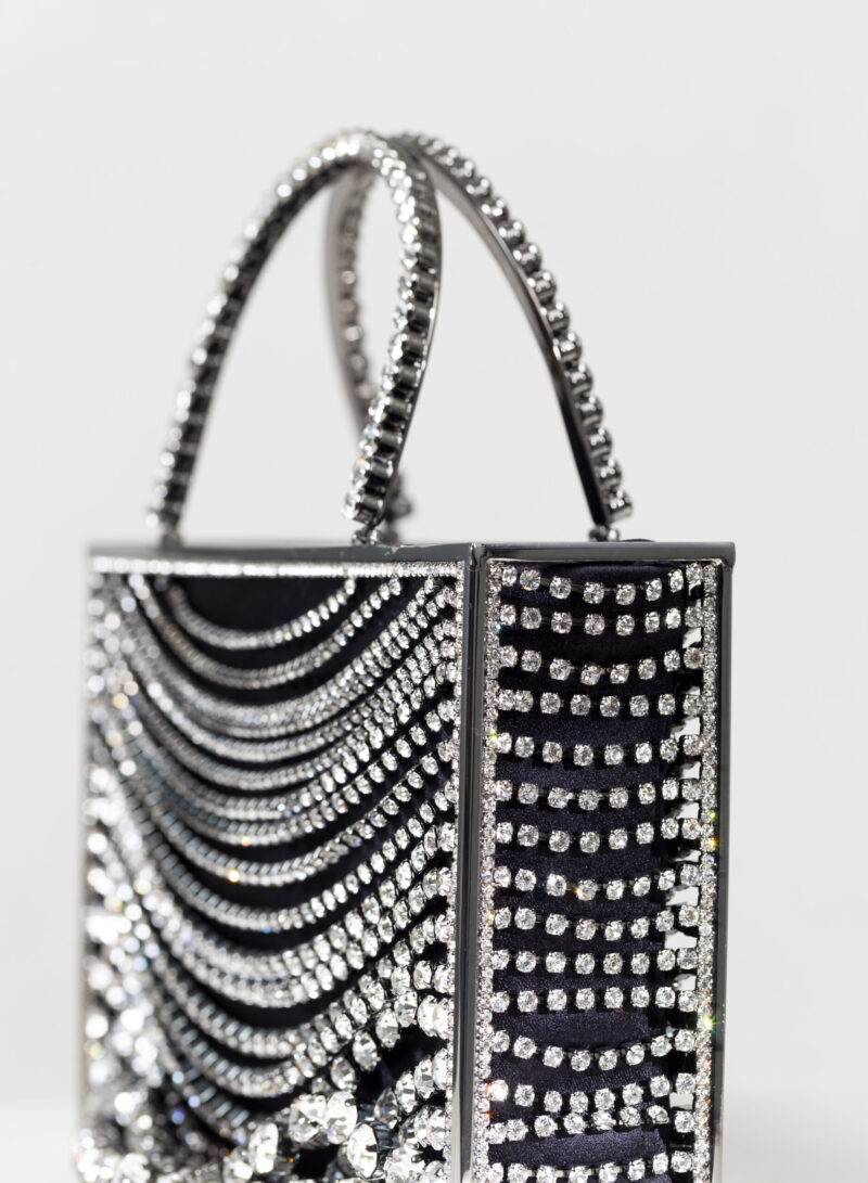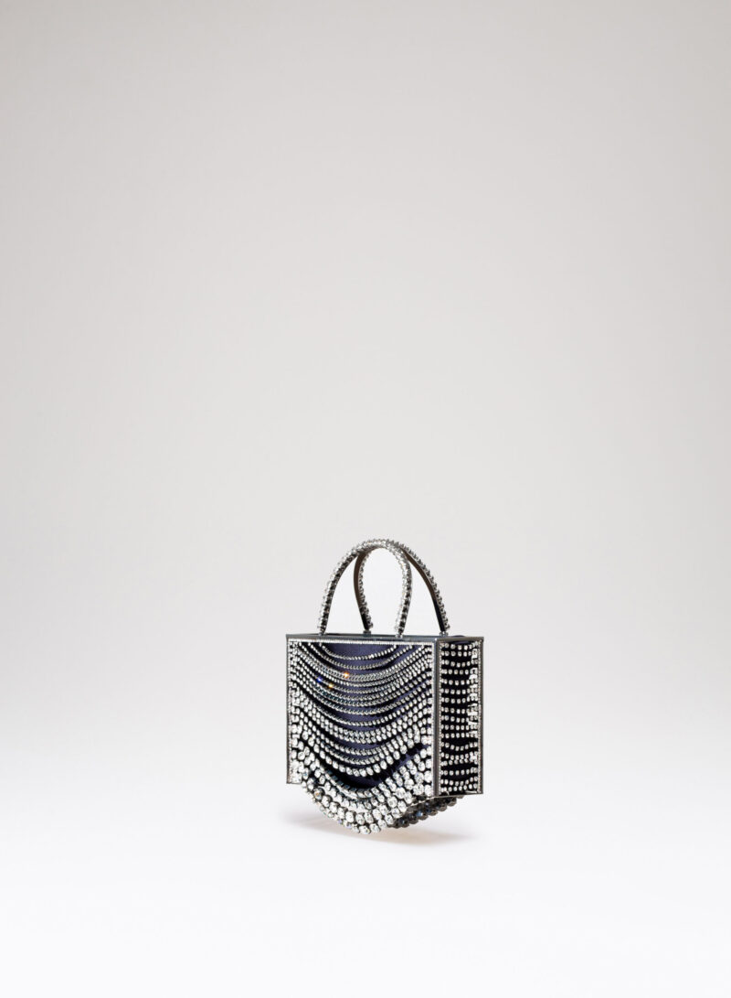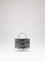 La micro tote Giulietta degli Spiriti è completamente realizzata a mano dai nostri artigiani orafi di Arezzo, adornata con un elegante degradé di catene di cristalli di varie dimensioni. All’interno ospita un sacchetto di morbida organza per contenere gli effetti personali.