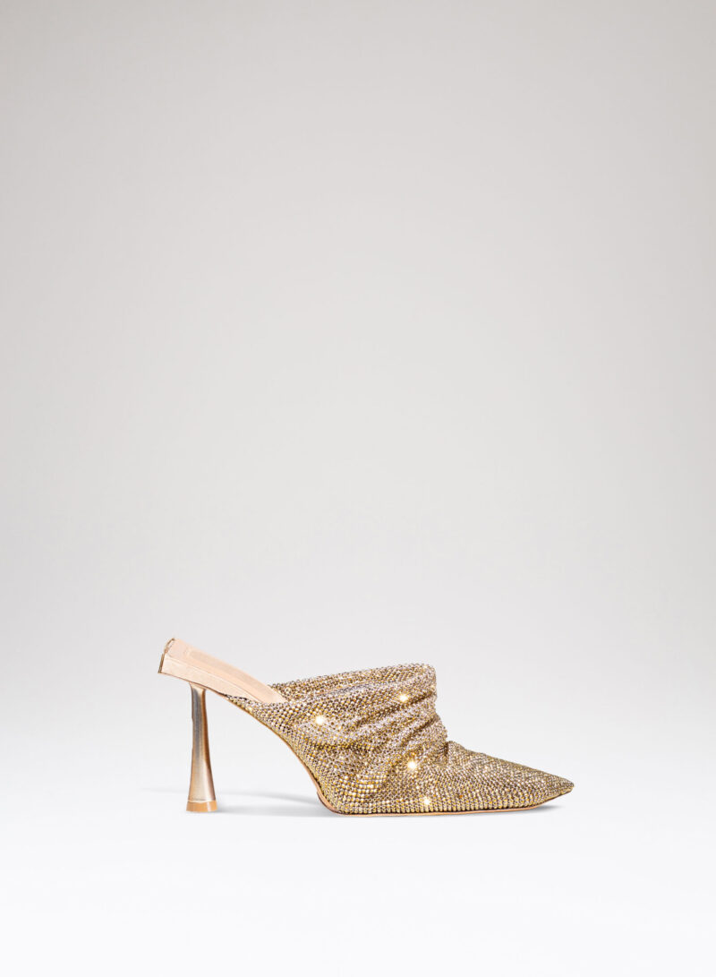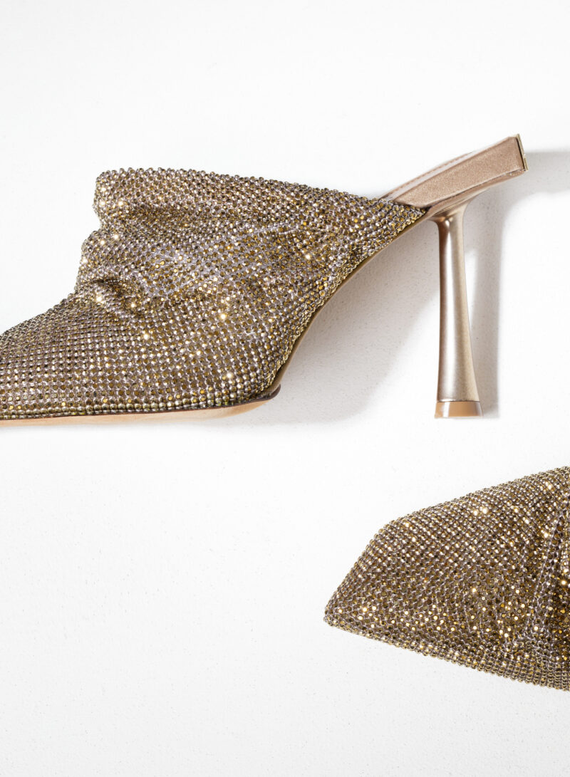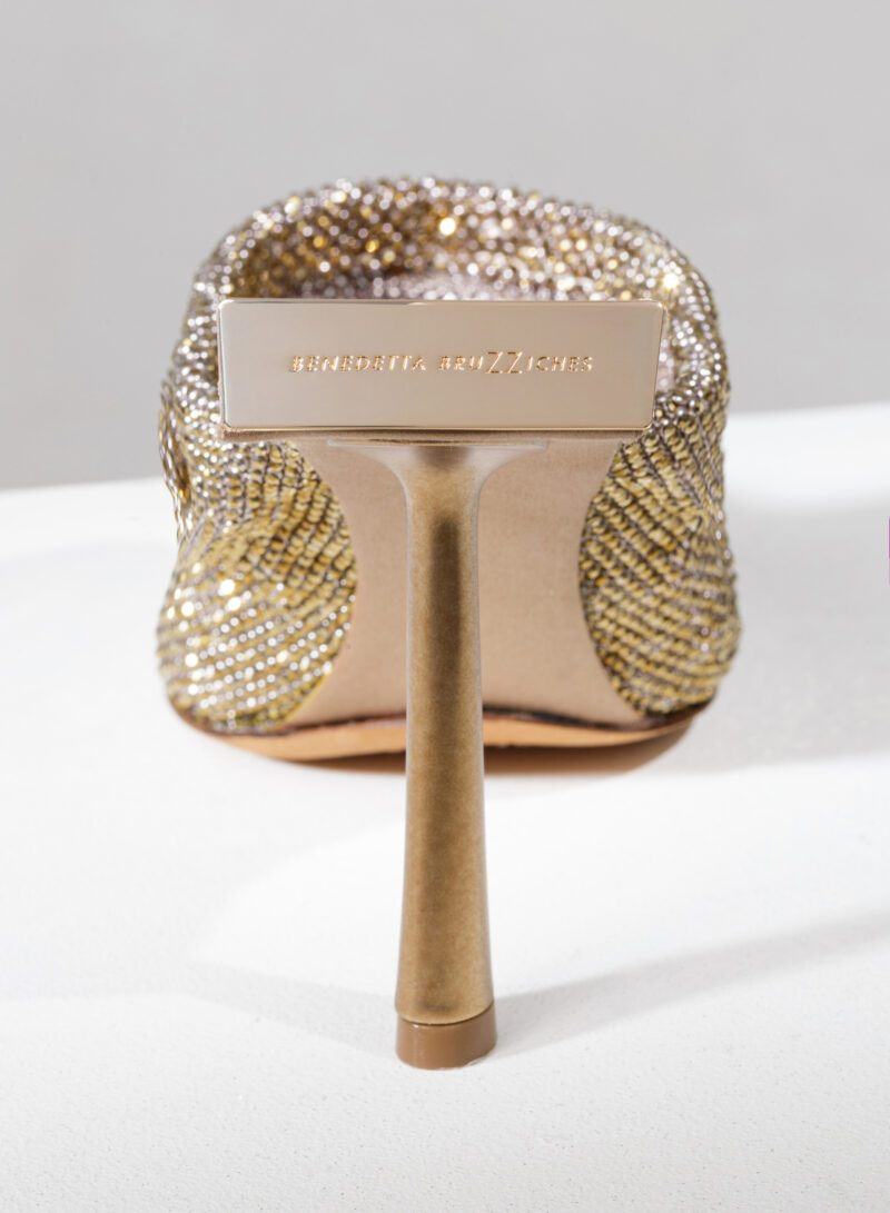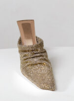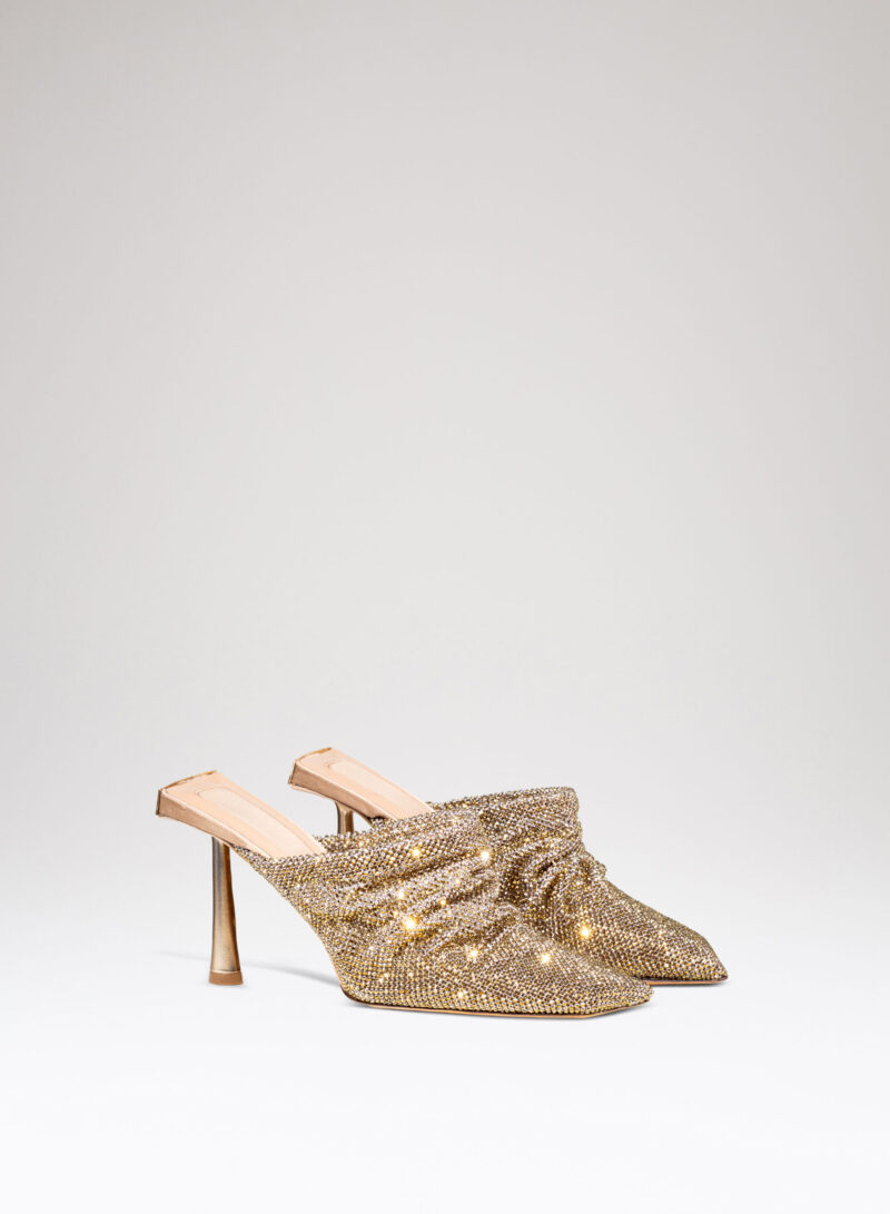 Goliarda è una creazione con una struttura rivestita in raso e una tomaia in maglia metallica con cristalli. Il tacco di questo object d’heart ha una sezione che riprende la forma e le simmetrie della mia iconica Ariel. L’accessorio in metallo sul retro evidenzia il volume scultoreo della soletta.