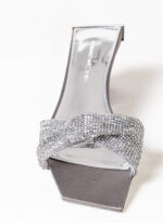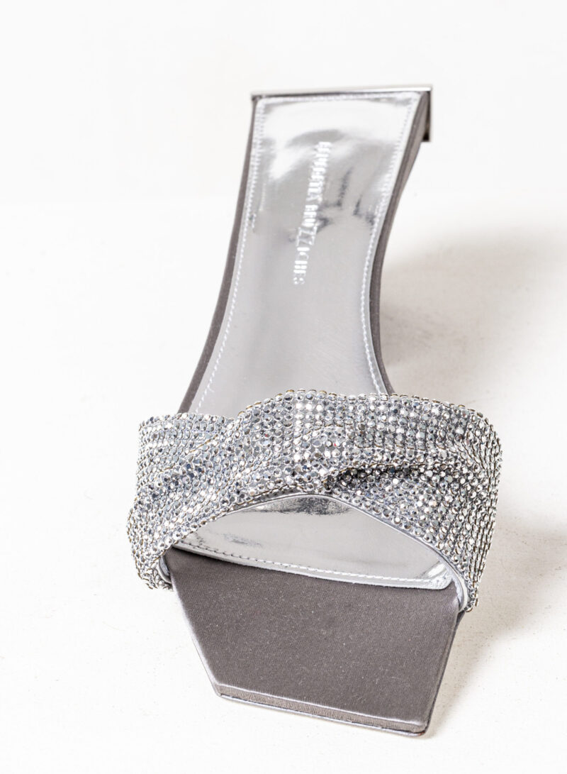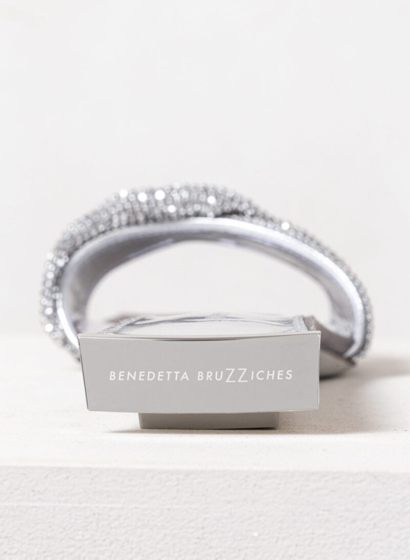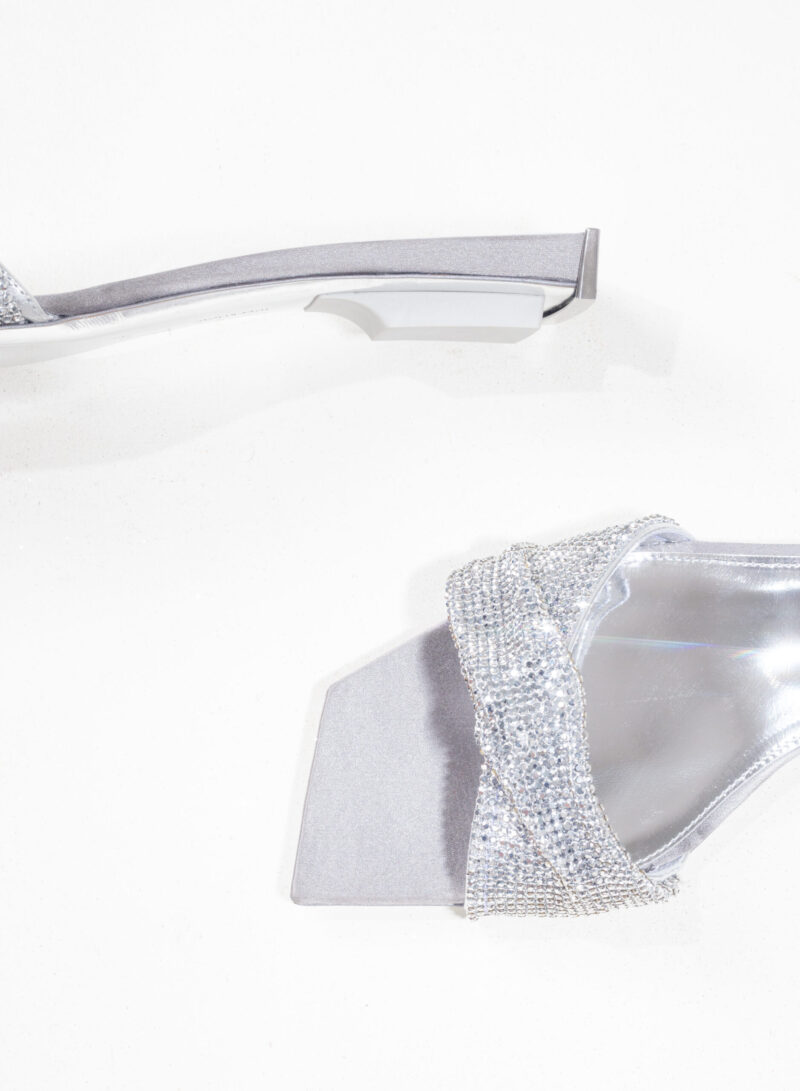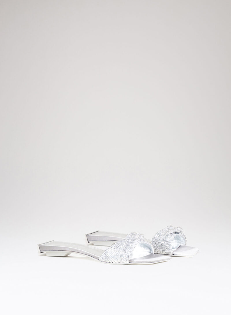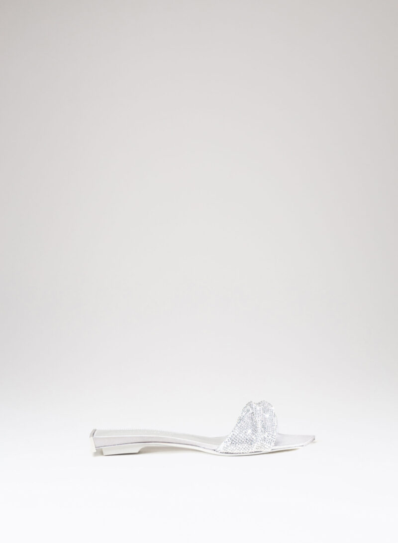 Nella nuova collezione Missione Rosetta, Goliarda diventa un sandalo flat impreziosito da una fascia in cristal mesh e con una suola rivestita in raso di seta.