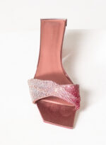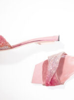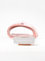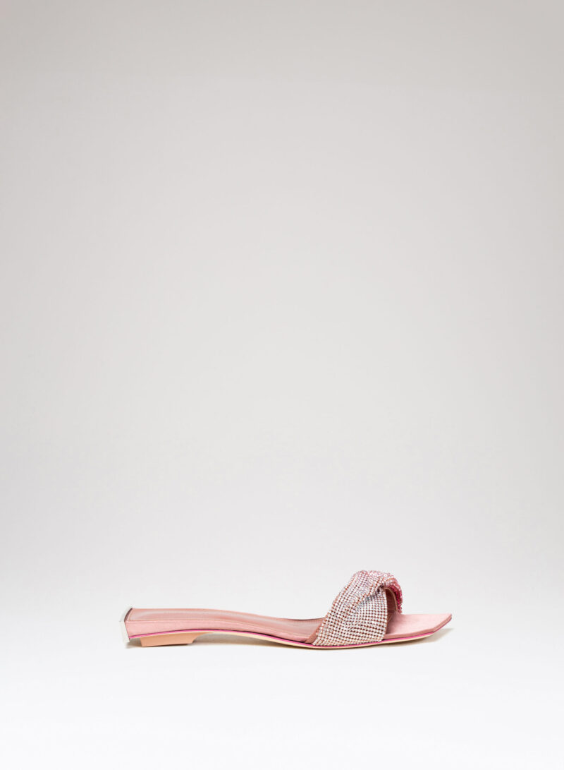 Nella nuova collezione Missione Rosetta, Goliarda diventa un sandalo flat impreziosito da una fascia in cristal mesh e con una suola rivestita in raso di seta.
