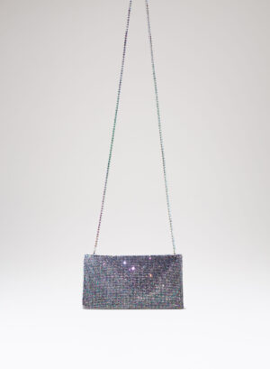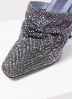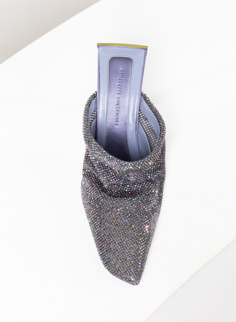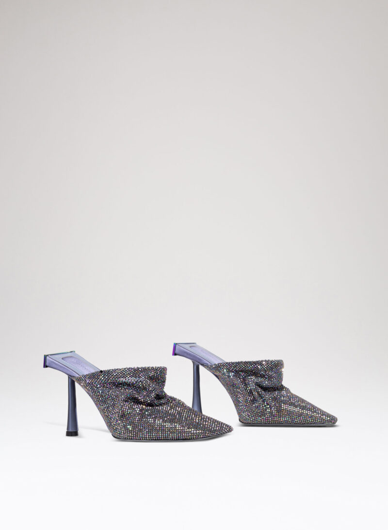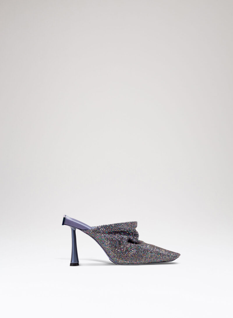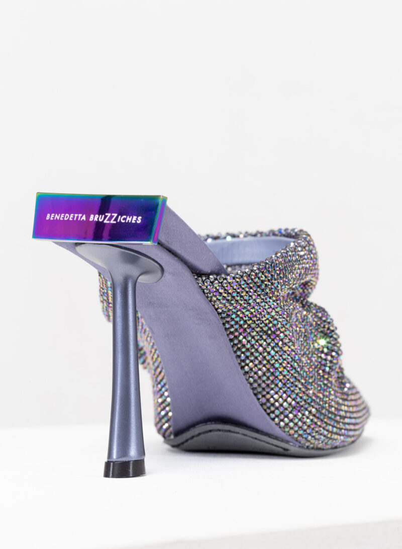 Goliarda è una creazione con una struttura rivestita in raso e una tomaia in maglia metallica con cristalli. Il tacco di questo object d’heart ha una sezione che riprende la forma e le simmetrie della mia iconica Ariel. L’accessorio in metallo sul retro evidenzia il volume scultoreo della soletta.