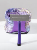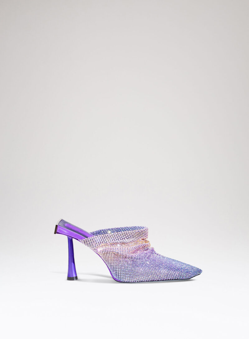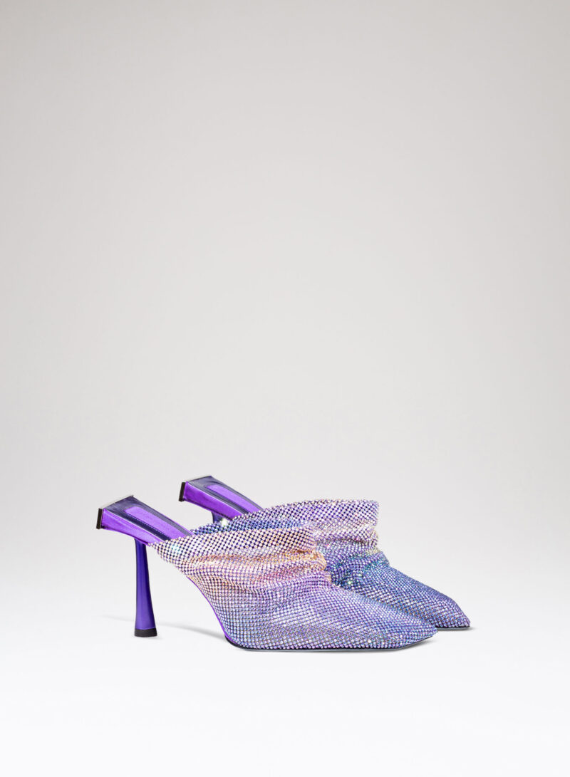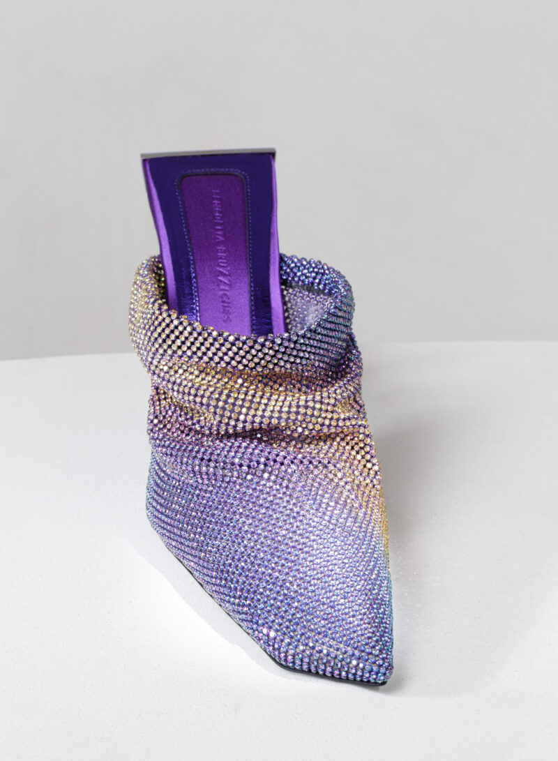 Goliarda è una creazione con una struttura rivestita in raso e una tomaia in maglia metallica con cristalli. Il tacco di questo object d’heart ha una sezione che riprende la forma e le simmetrie della mia iconica Ariel. L’accessorio in metallo sul retro evidenzia il volume scultoreo della soletta.