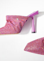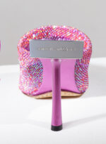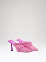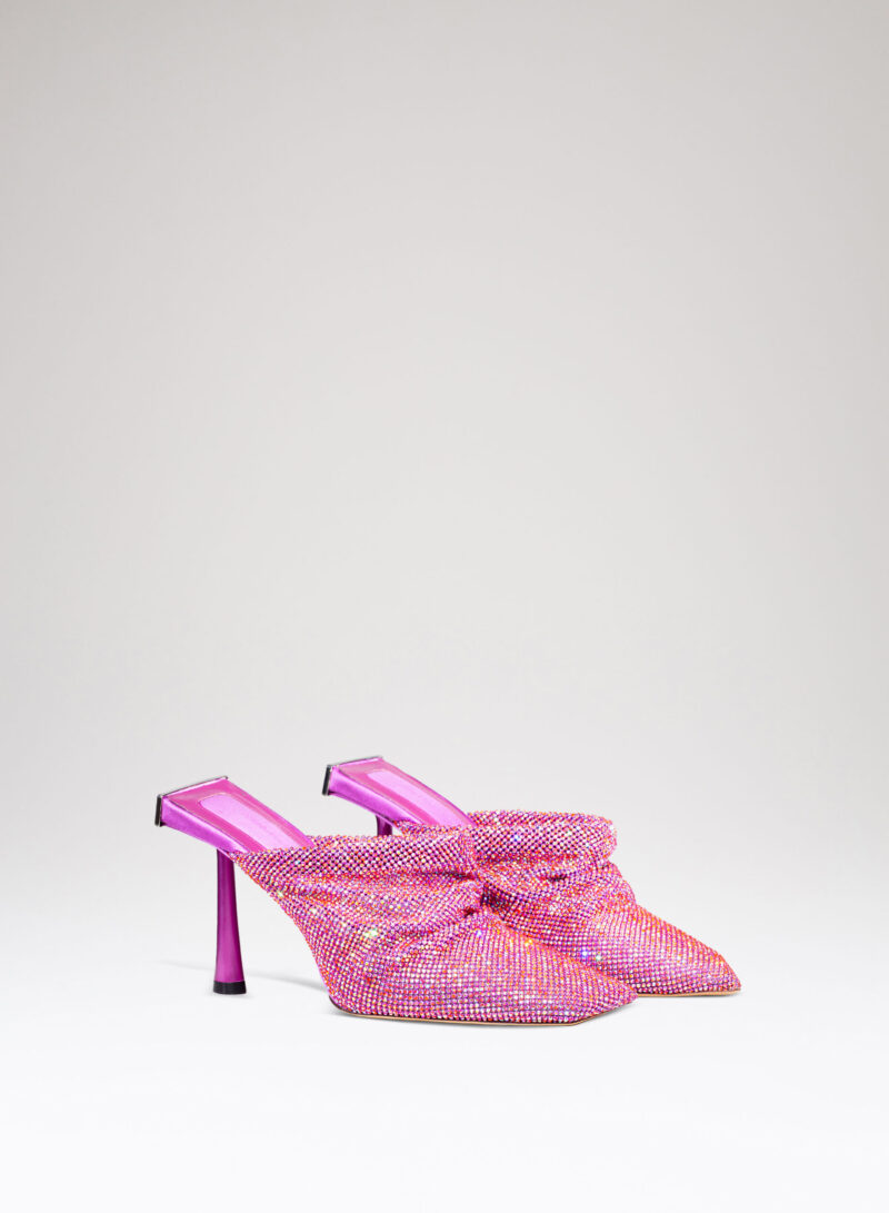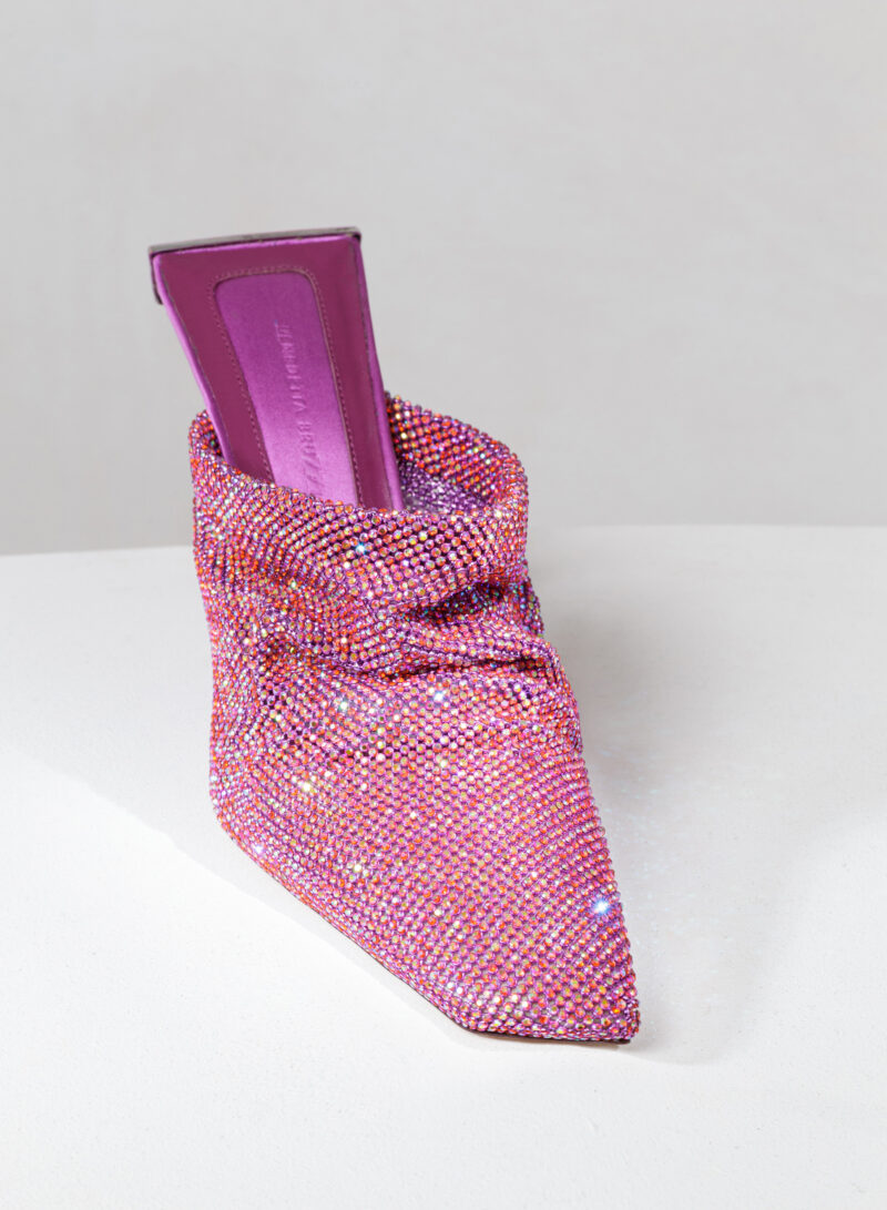 Goliarda è una creazione con una struttura rivestita in raso e una tomaia in maglia metallica con cristalli. Il tacco di questo object d’heart ha una sezione che riprende la forma e le simmetrie della mia iconica Ariel. L’accessorio in metallo sul retro evidenzia il volume scultoreo della soletta.