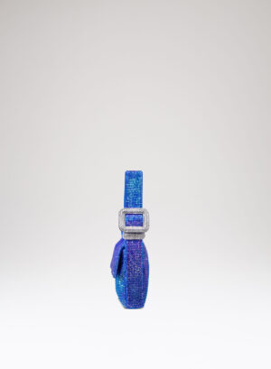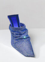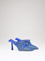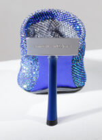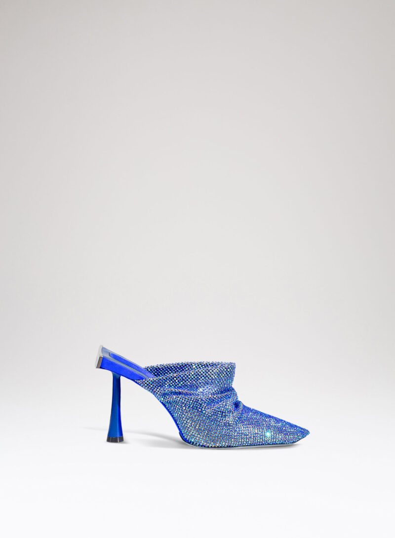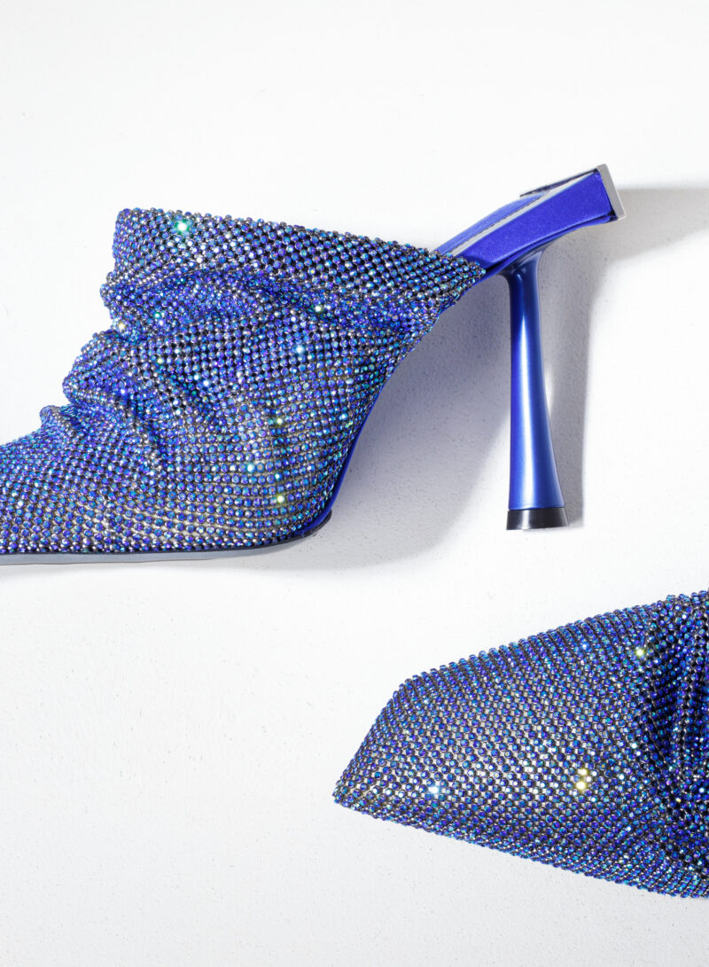 Goliarda è una creazione con una struttura rivestita in raso e una tomaia in maglia metallica con cristalli. Il tacco di questo object d’heart ha una sezione che riprende la forma e le simmetrie della mia iconica Ariel. L’accessorio in metallo sul retro evidenzia il volume scultoreo della soletta.