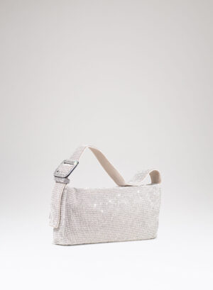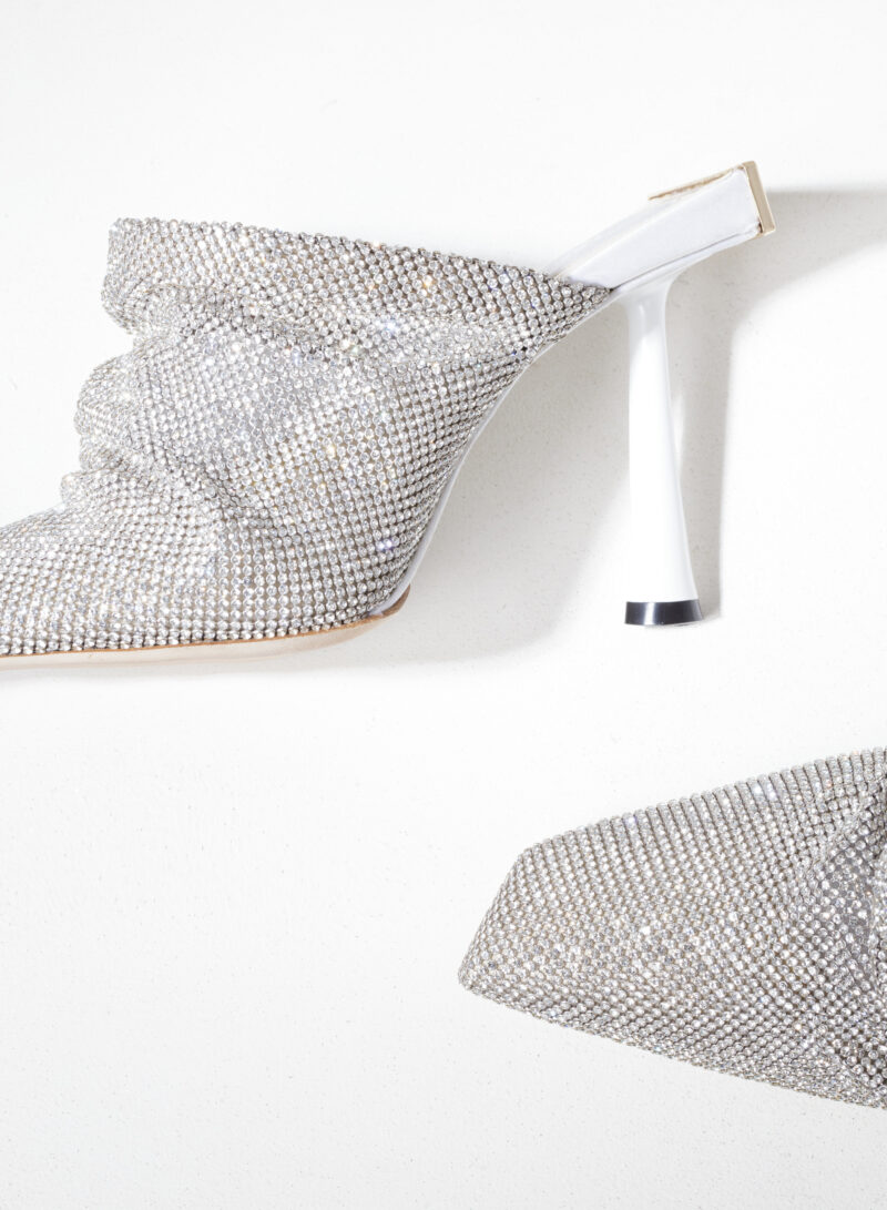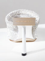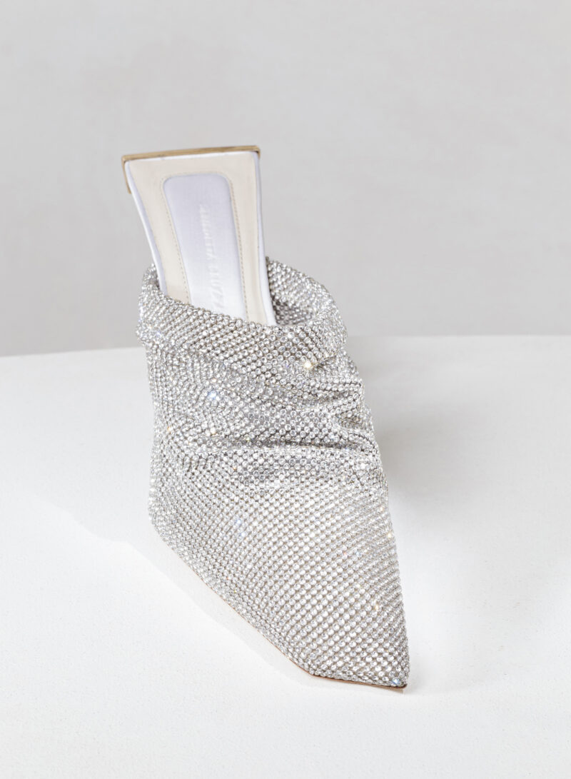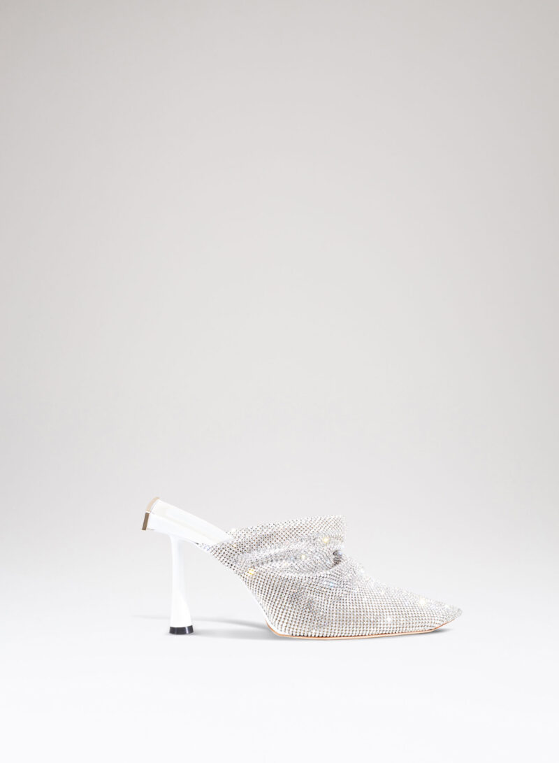 Goliarda è una creazione con una struttura rivestita in raso e una tomaia in maglia metallica con cristalli. Il tacco di questo object d’heart ha una sezione che riprende la forma e le simmetrie della mia iconica Ariel. L’accessorio in metallo sul retro evidenzia il volume scultoreo della soletta.