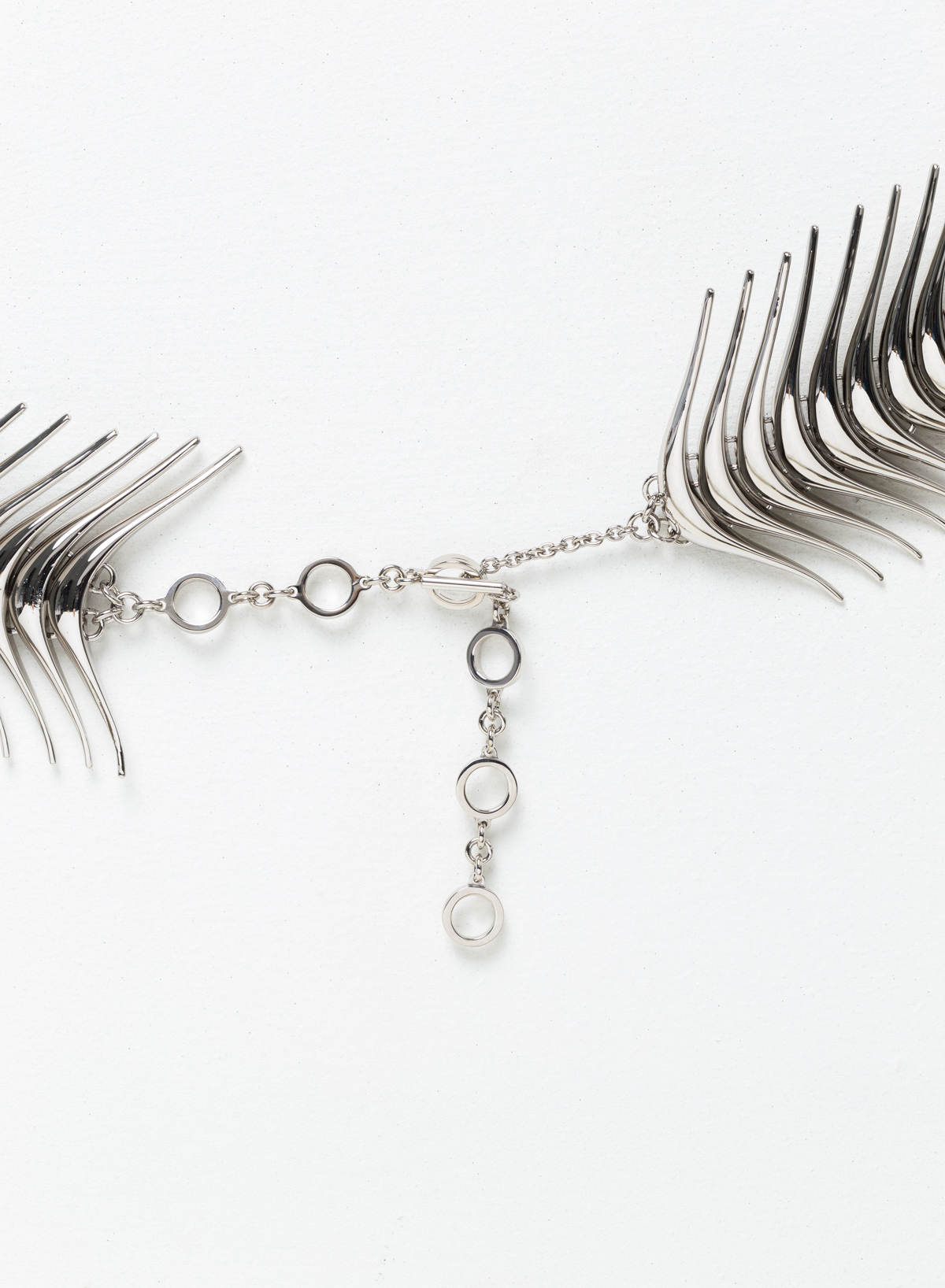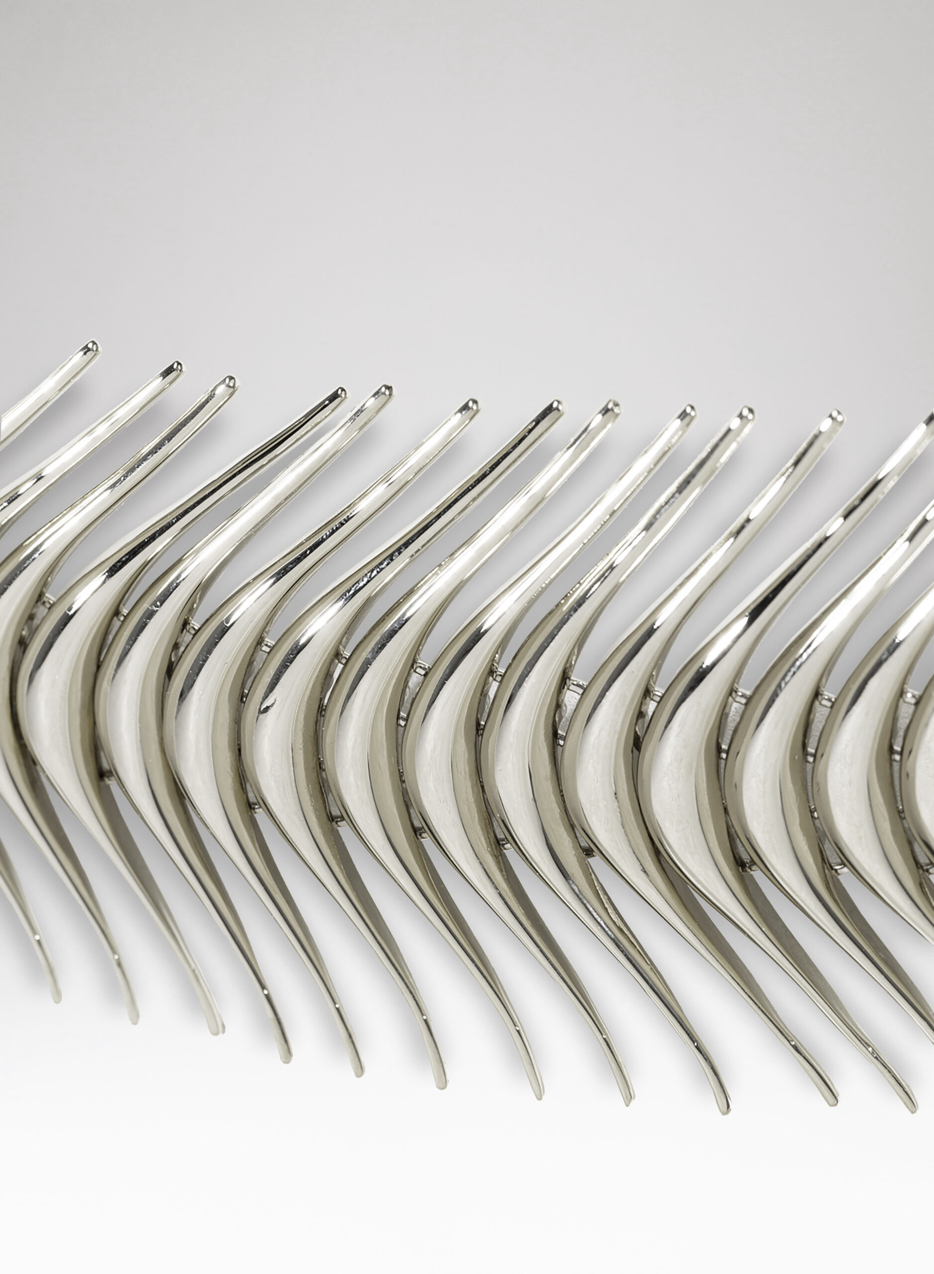 Hilda è un gioiello che eleva il concetto di multidisciplinarietà ad un livello superiore. La cinta è costruita con elementi a modulo che richiamano, nella loro forma, il manico della nostra borsa Lira e sono assemblati in modo da riprodurre una spina dorsale. Con la sua struttura snodabile, Hilda segue le curve del corpo incorniciando elegantemente i fianchi.