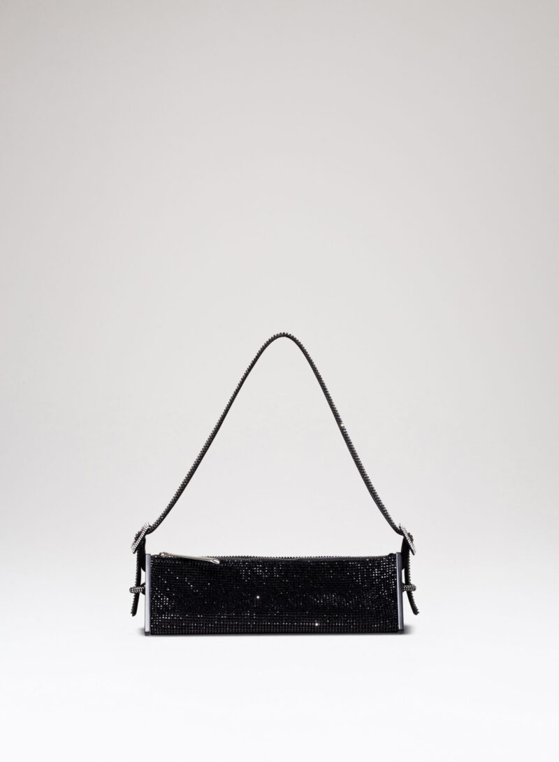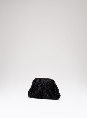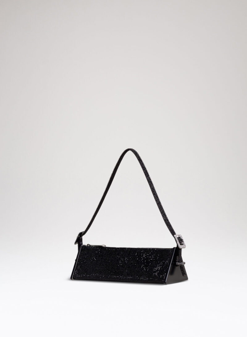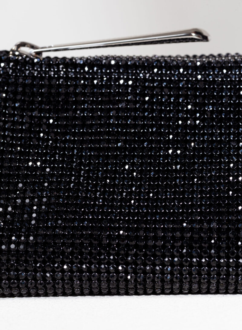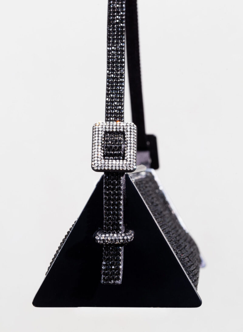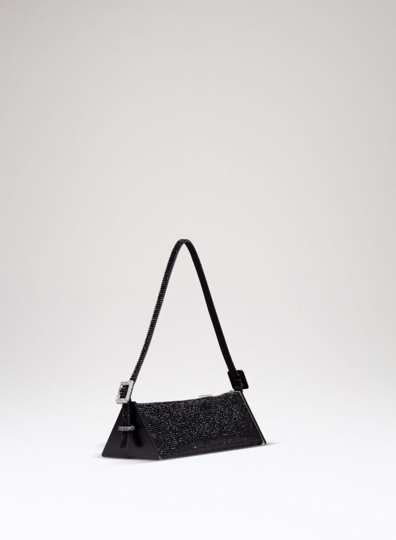 Joy è una borsa giocosa realizzata in puro raso di seta, ricoperta in crystal mesh e con due piastre triangolari in ottone che le danno la caratteristica forma ad astuccio.