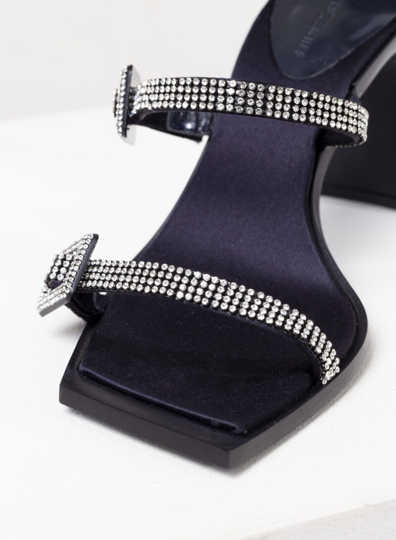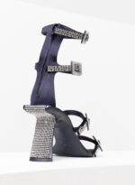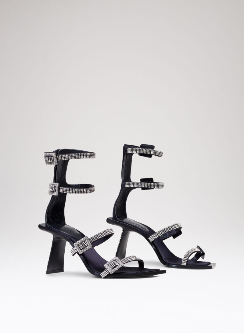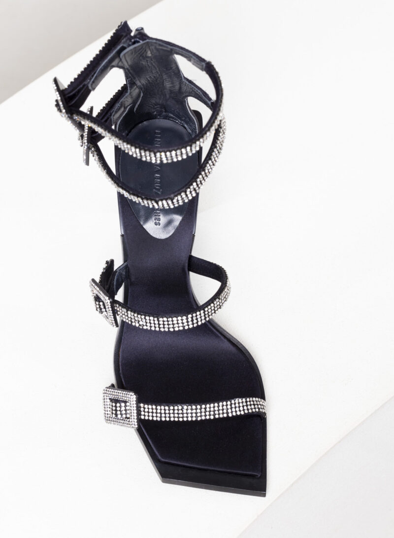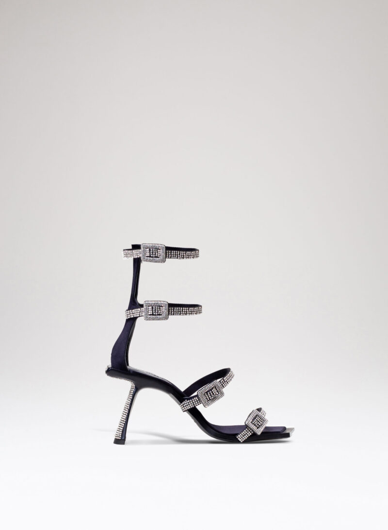 Il suo retro in raso di seta apribile con una zip e arricchito dagli iconici cinturini in crystal mesh, insieme al tacco scultura, dimostra quanto l’esagerazione sia un punto di forza.