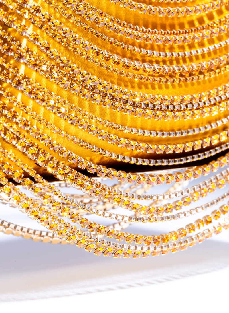 La luminosa trama di morbide catene di cristalli si lega delicatamente a una sottilissima cornice d’ottone, intenta a catturare e restituire la magia della luce delle cattedrali cistercensi al solstizio, quando ogni cosa è un incessante divenire di luce che reinventa il mondo.