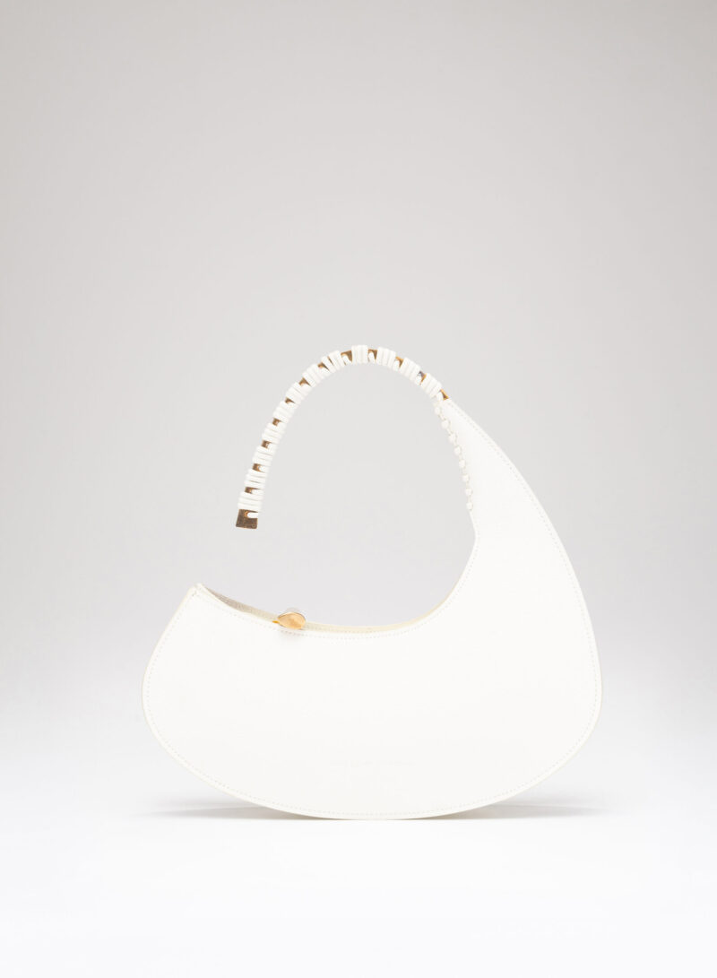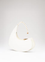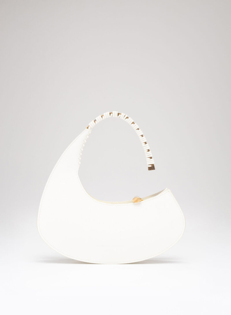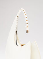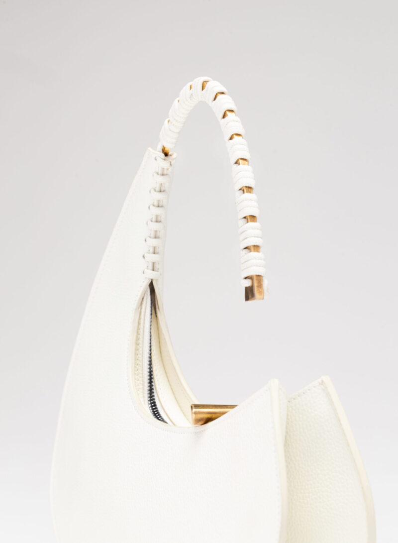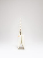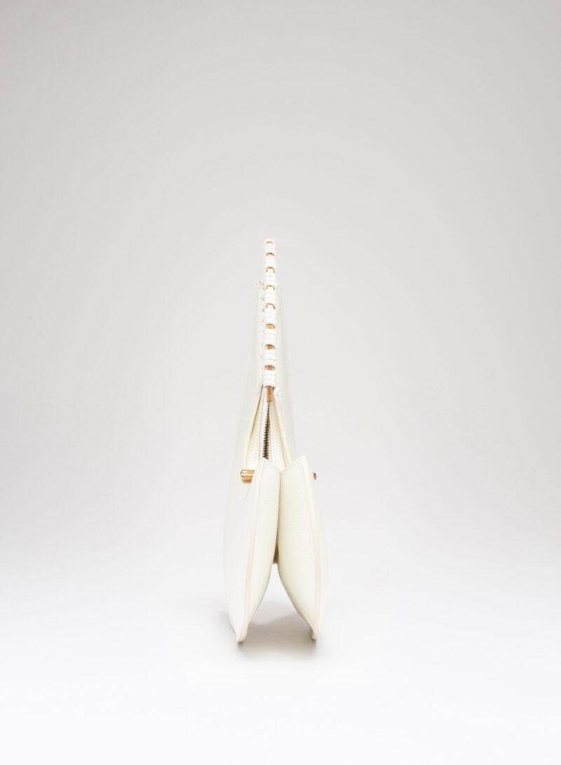 Organica e tecnologica. Organica come sepali di un’orchidea e insieme tecnologica come gli scafi di un catamarano, Raffaella ha un corpo che è un guscio in pelle, panciuto e affilato, sorretto da un un manico metallico aperto a “C”, dal profilo irregolare, ricavato intagliando al laser una lamina metallica di 4 mm. Un piccolo tubolare, in pelle o in metallo, unisce corpo e manico come un’imbastitura, o se vogliamo come un viticcio su un tralcio di vite.
