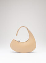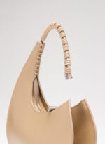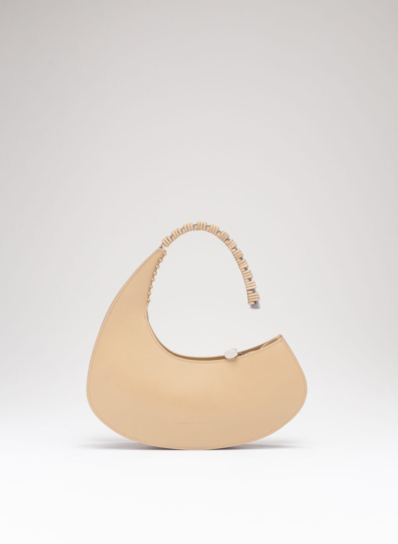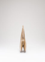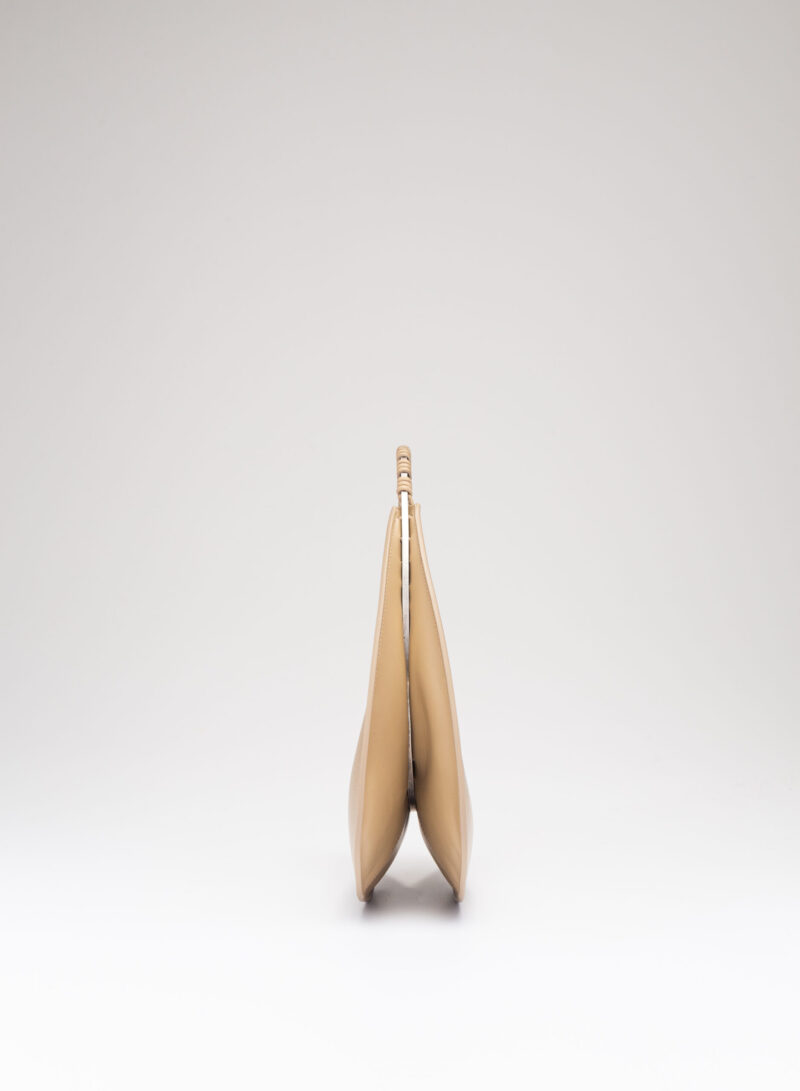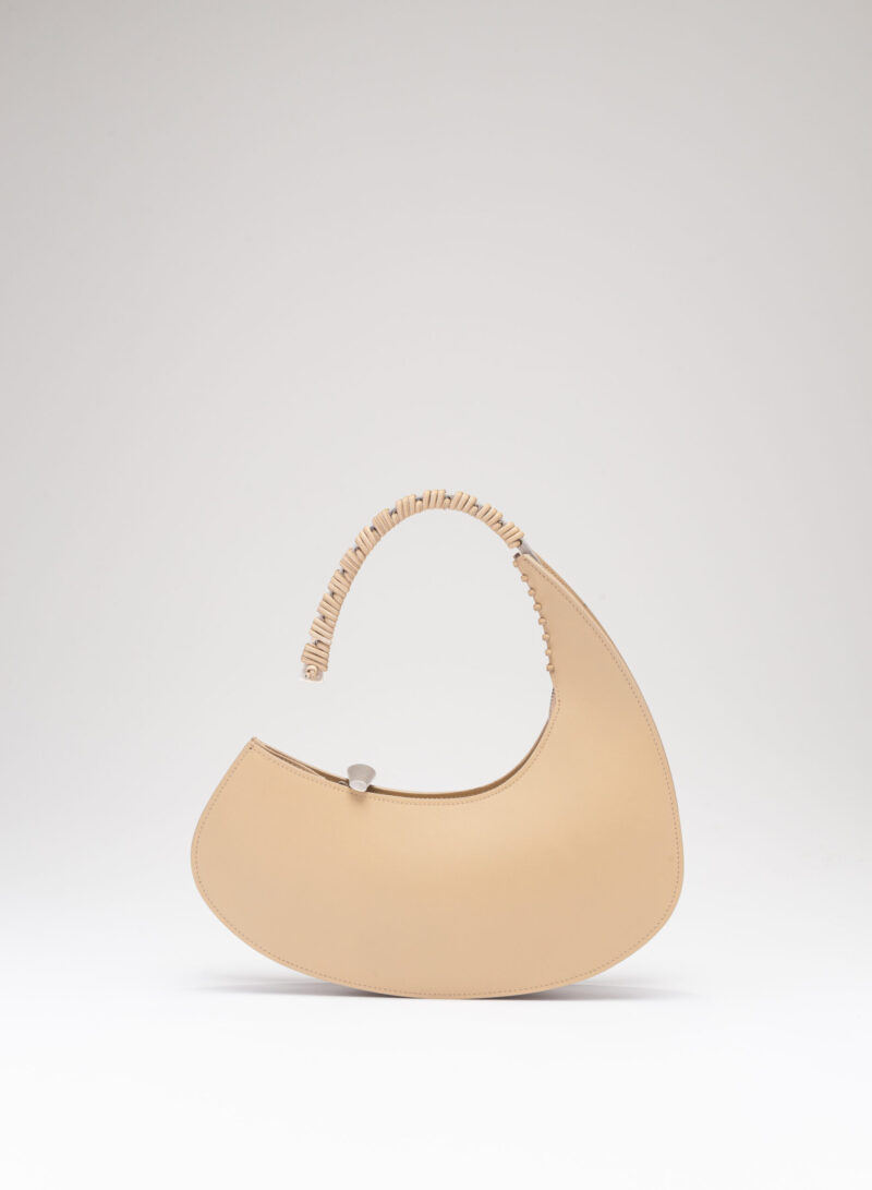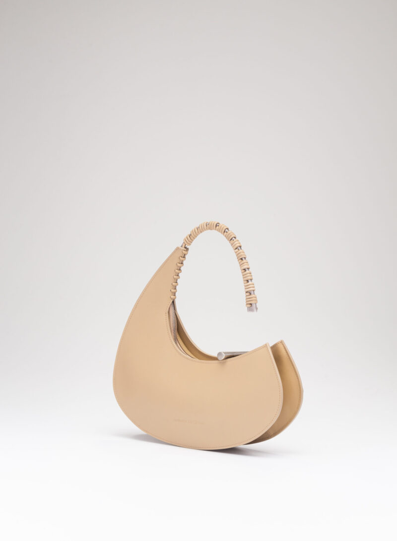 Organica e tecnologica. Organica come sepali di un’orchidea e insieme tecnologica come gli scafi di un catamarano, Raffaella ha un corpo che è un guscio in pelle, panciuto e affilato, sorretto da un un manico metallico aperto a “C”, dal profilo irregolare, ricavato intagliando al laser una lamina metallica di 4 mm. Un piccolo tubolare, in pelle o in metallo, unisce corpo e manico come un’imbastitura, o se vogliamo come un viticcio su un tralcio di vite.