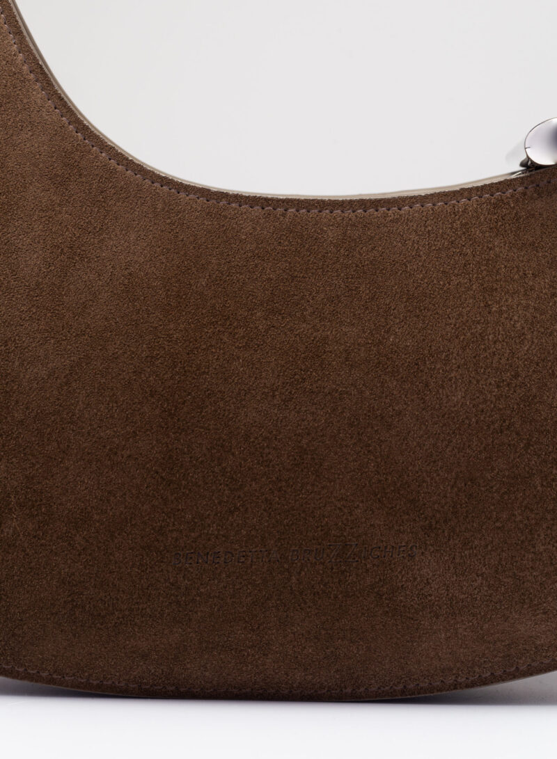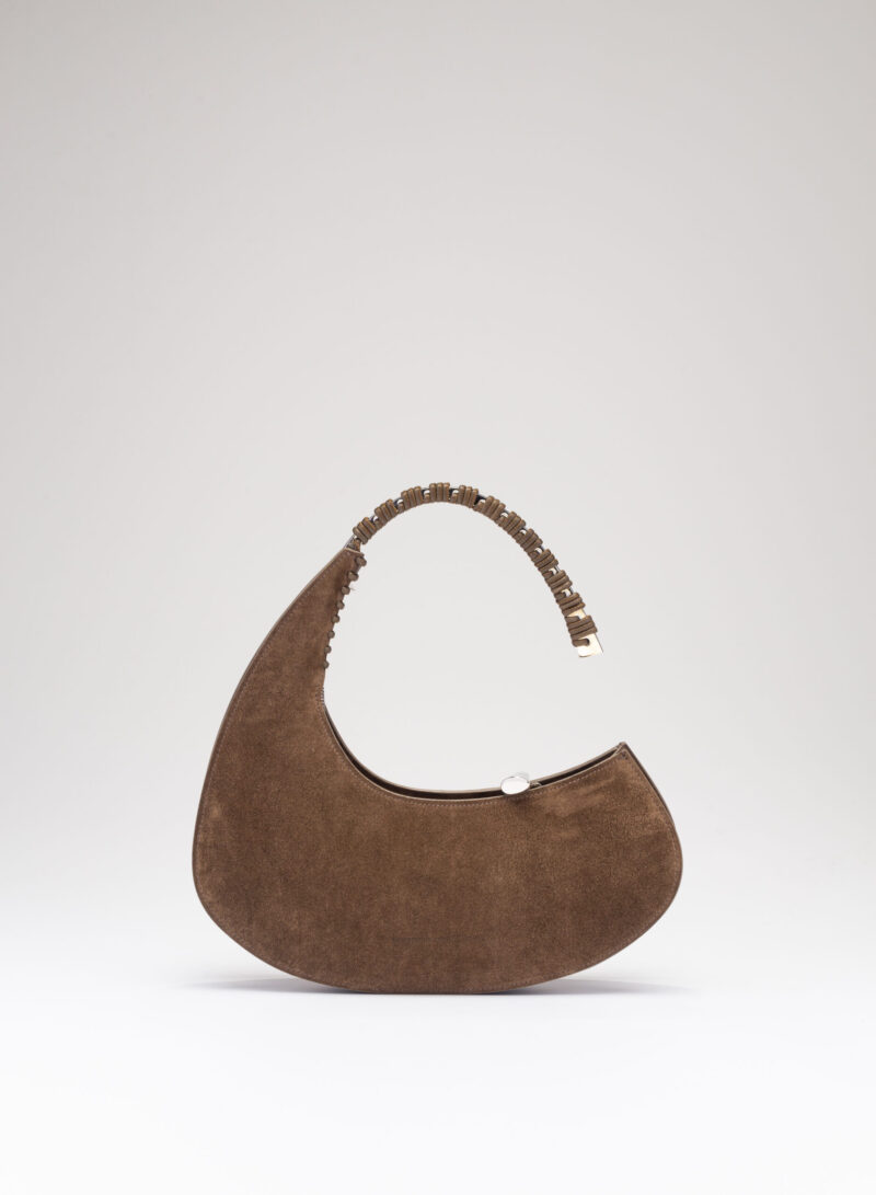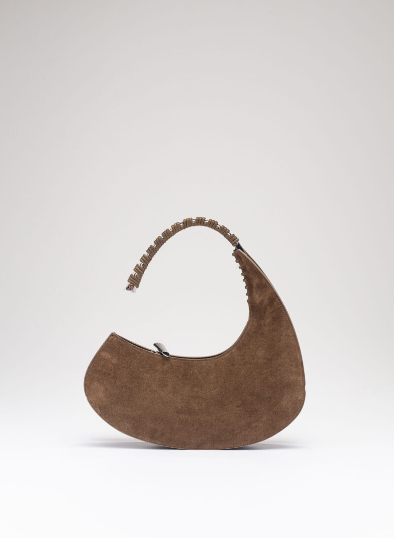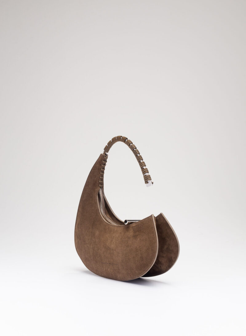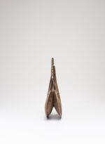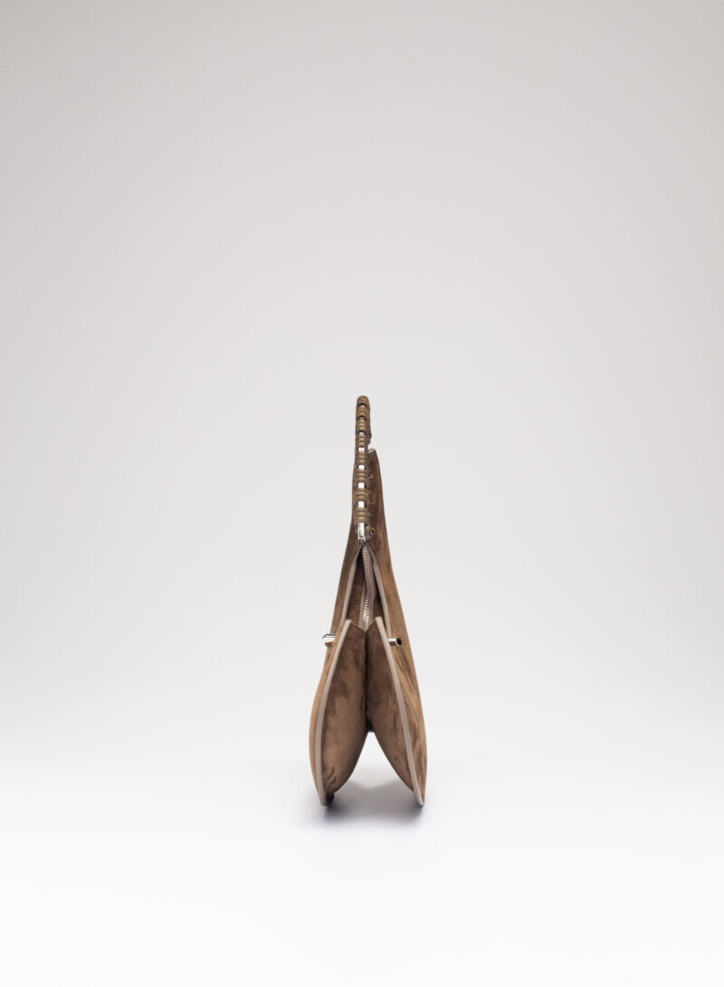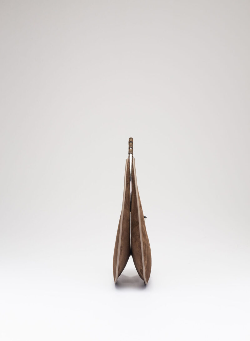 Organica e tecnologica. Organica come sepali di un’orchidea e insieme tecnologica come gli scafi di un catamarano, Raffaella ha un corpo che è un guscio in pelle, panciuto e affilato, sorretto da un un manico metallico aperto a “C”, dal profilo irregolare, ricavato intagliando al laser una lamina metallica di 4 mm. Un piccolo tubolare, in pelle o in metallo, unisce corpo e manico come un’imbastitura, o se vogliamo come un viticcio su un tralcio di vite.