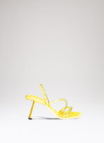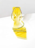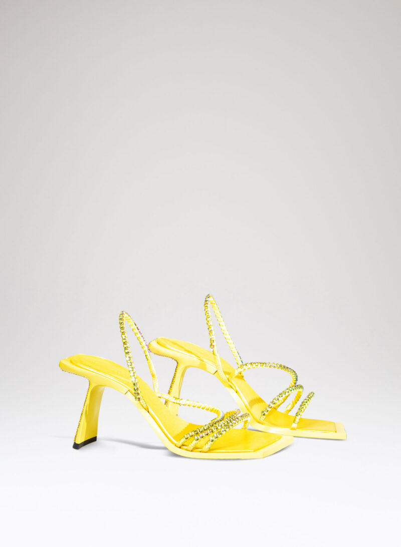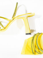 La tomaia è realizzata con sottili cinturini avvolti da un cordoncino di seta che monta una catena di cristalli.