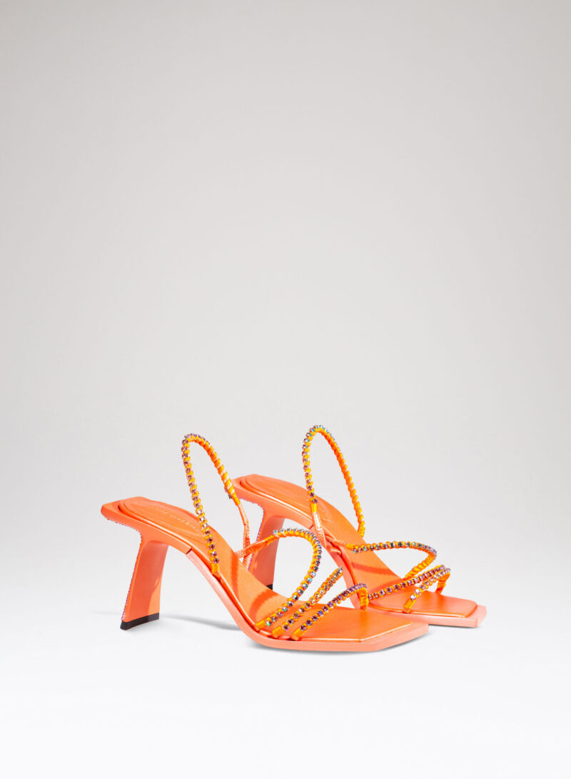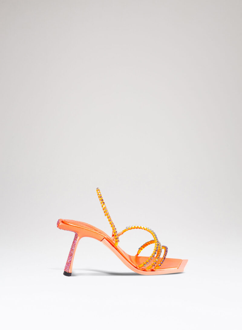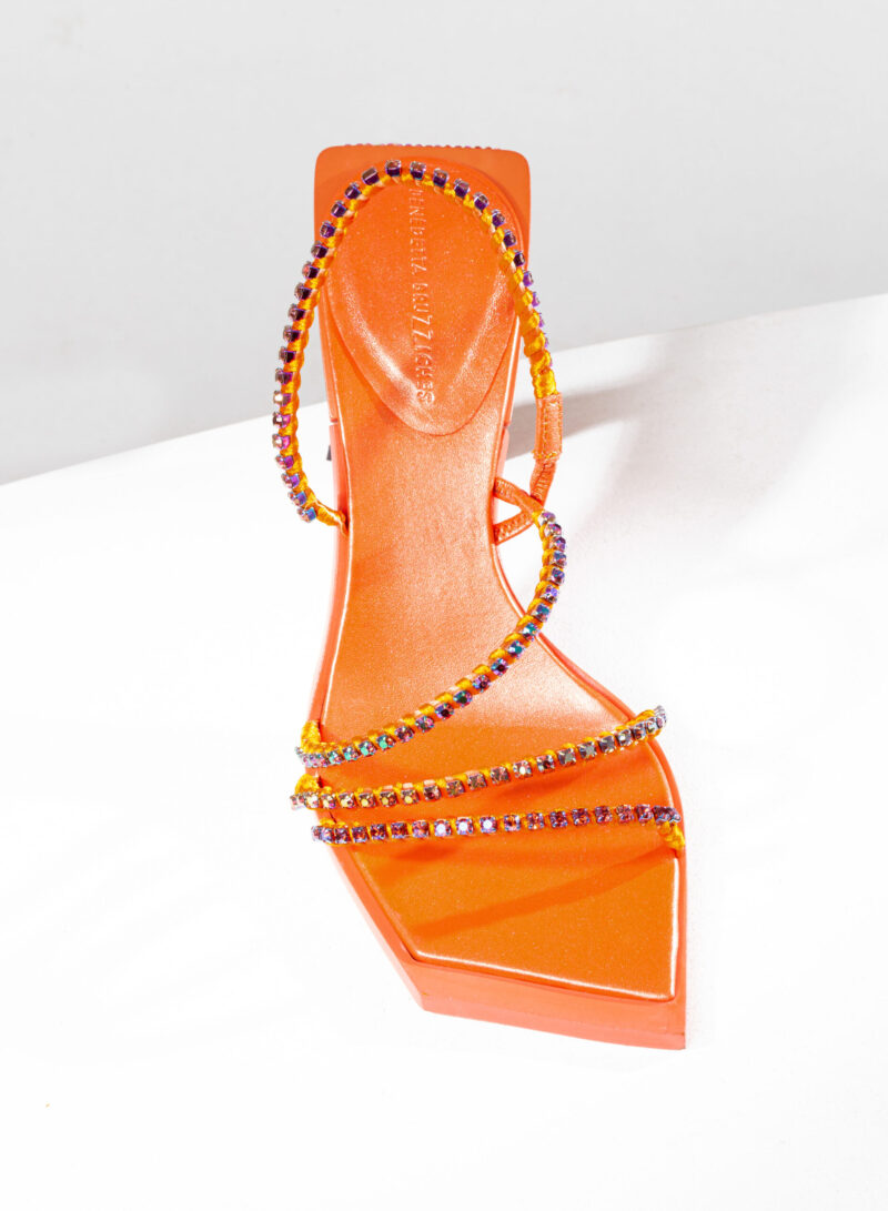 La tomaia è realizzata con sottili cinturini avvolti da un cordoncino di seta che monta una catena di cristalli.