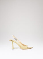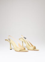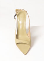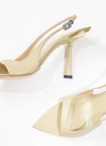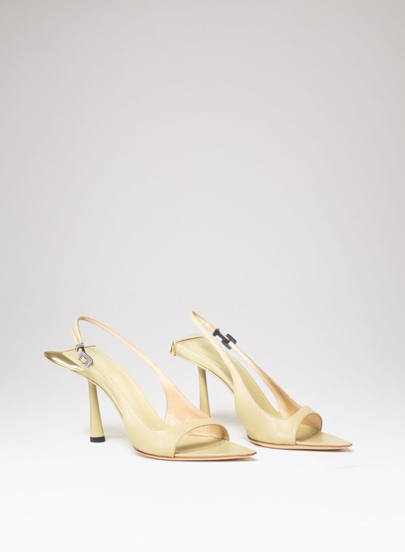 Una sling back open-toe in morbida pelle di vitello dal carattere graffiante e con un cinturino impreziosito dalla fibbia gioiello ricoperta in cristalli, un chiaro riferimento al signature element della borsa Vitty.