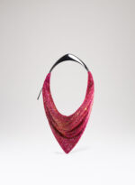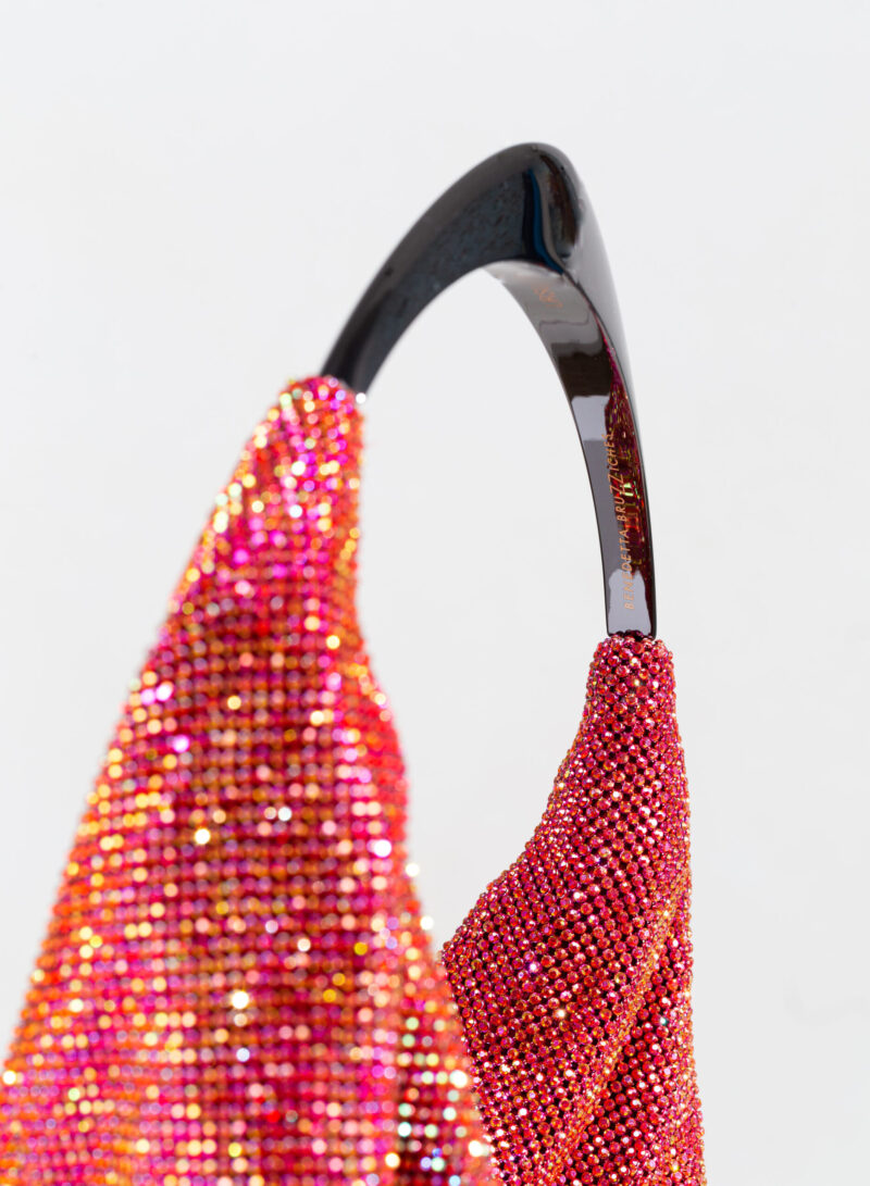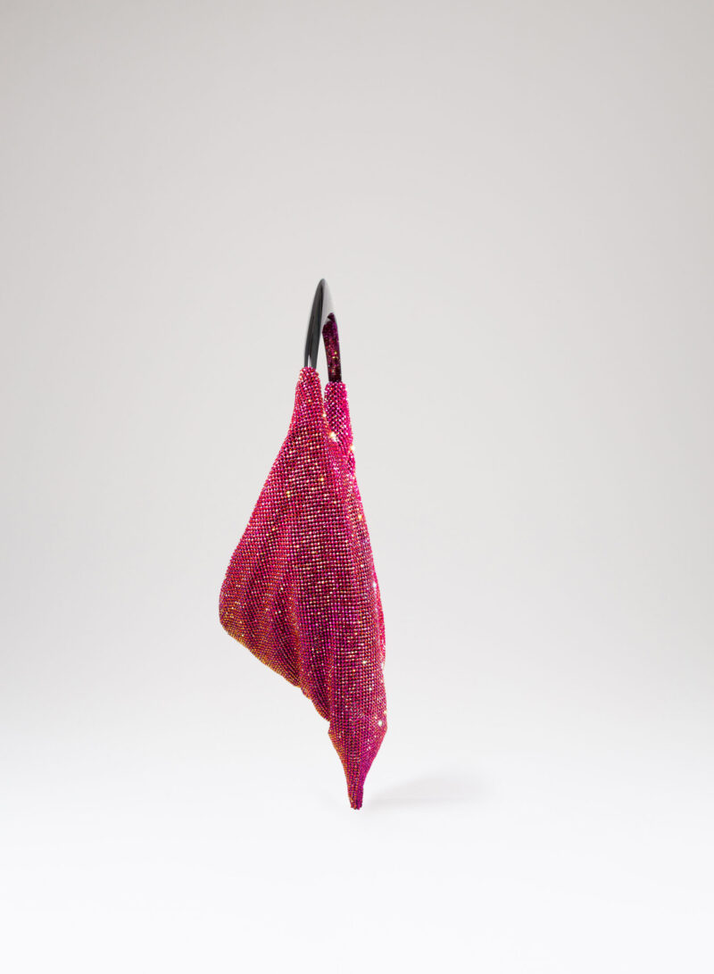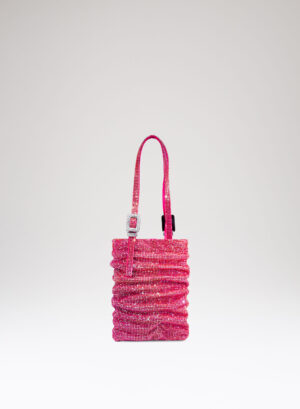 Una borsa in maglia metallica, da drappeggiare intorno al corpo come un foulard, con una custodia in raso ed una zip accessibile su di un lato. Ursolina è una tasca sospesa dotata di un’esile tracolla in metallo.