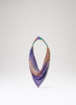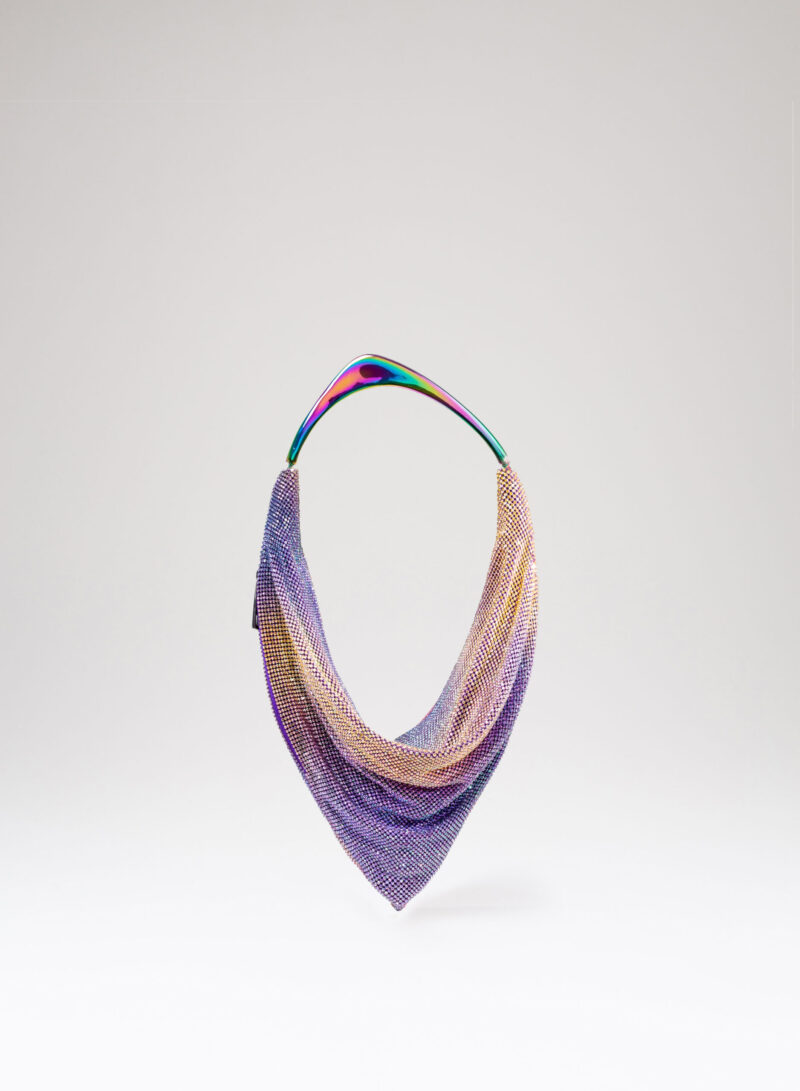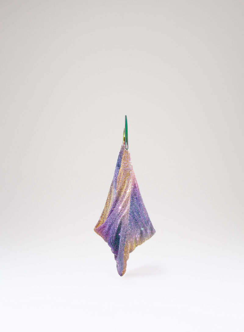 Una borsa in maglia metallica, da drappeggiare intorno al corpo come un foulard, con una custodia in raso ed una zip accessibile su di un lato. Ursolina è una tasca sospesa dotata di un’esile tracolla in metallo.