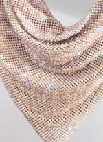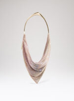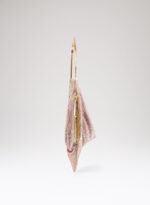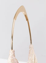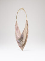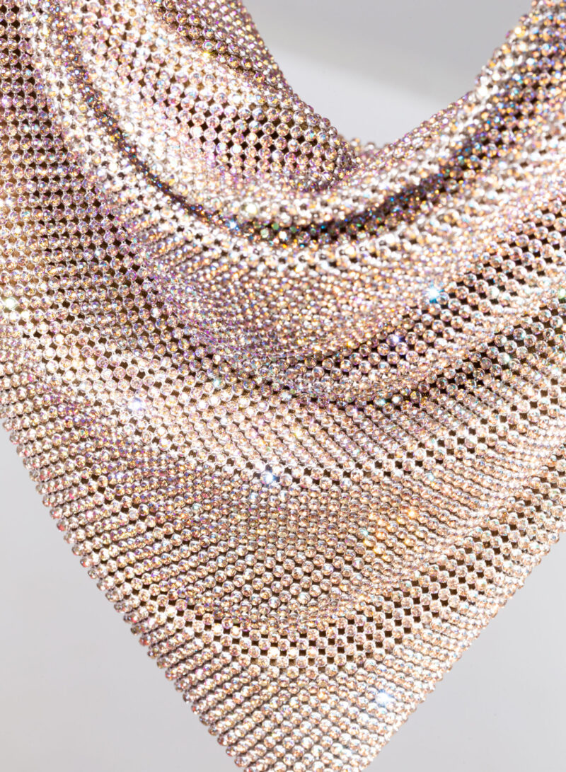 Un foulard di maglia metallica che calza perfettamente attorno a una custodia in denim la cui zip è accessibile su di un lato. Una tasca sospesa dotata di un’esile tracolla in metallo.