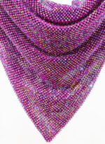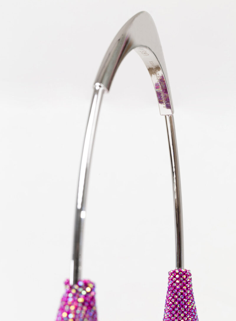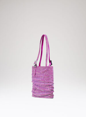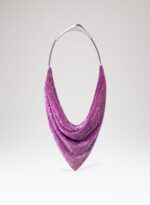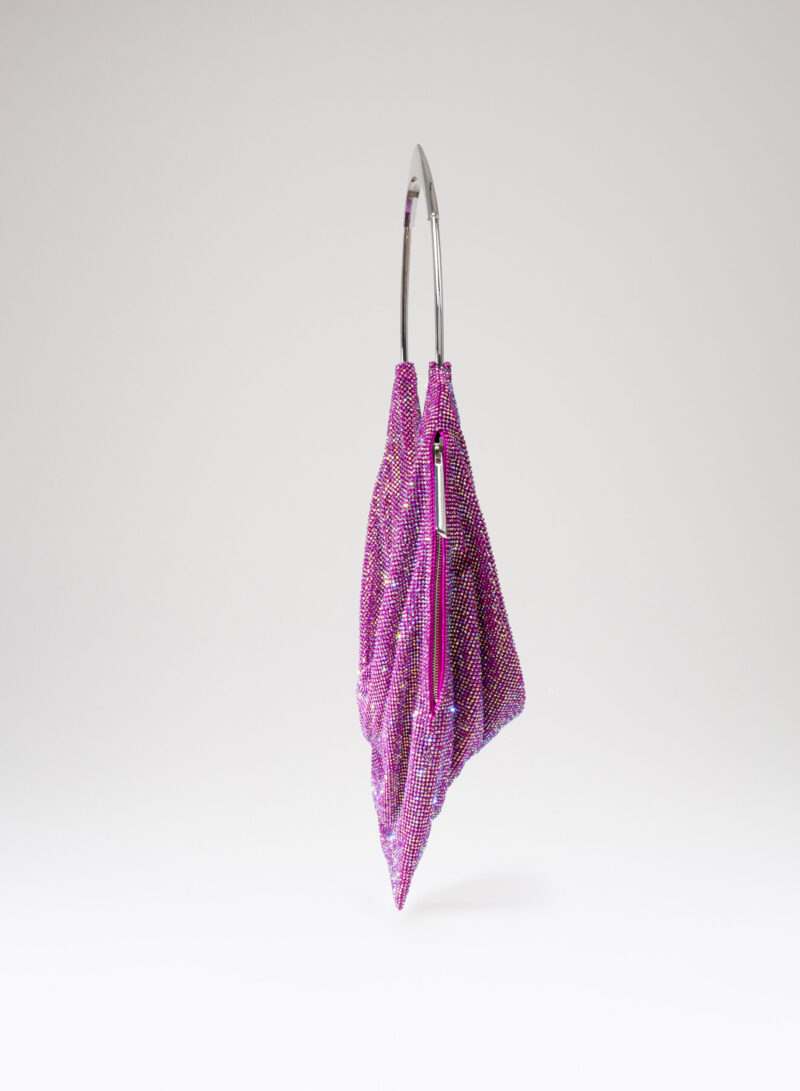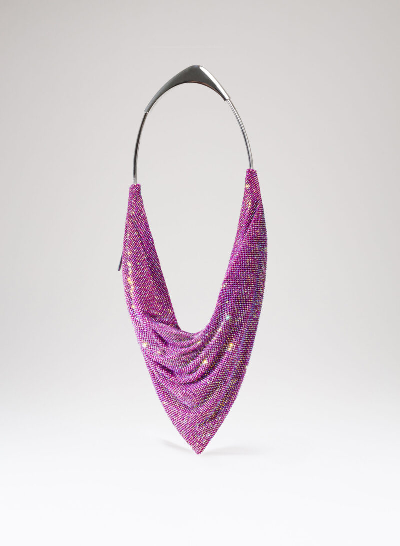 Un foulard di maglia metallica che calza perfettamente attorno a una custodia in denim la cui zip è accessibile su di un lato. Una tasca sospesa dotata di un’esile tracolla in metallo.
