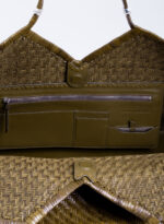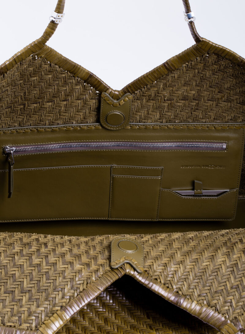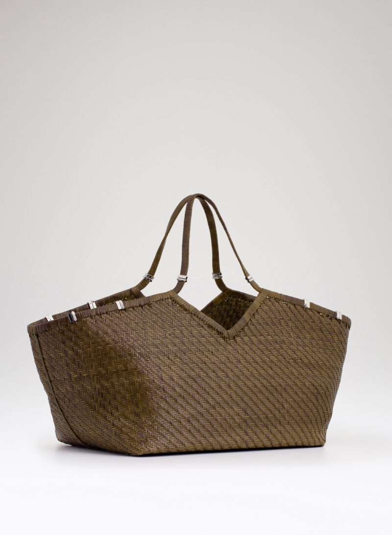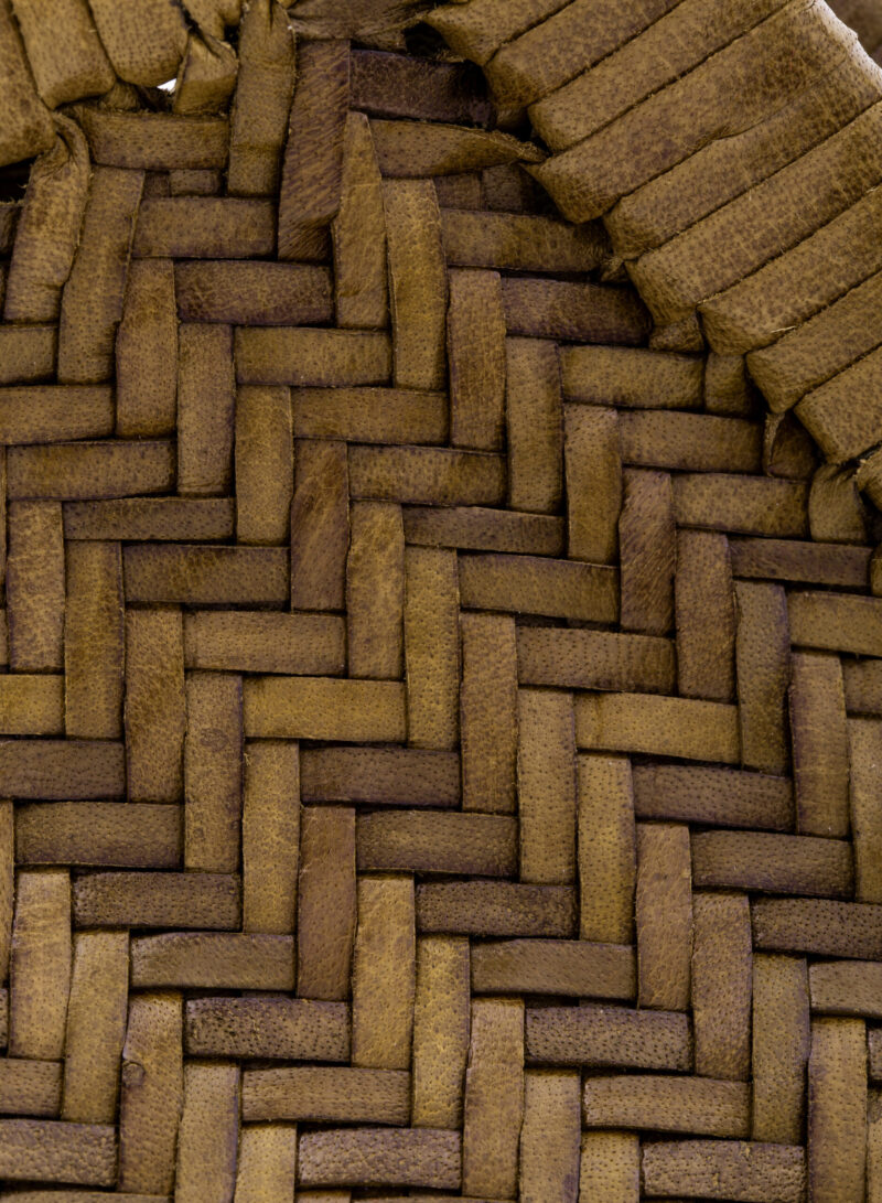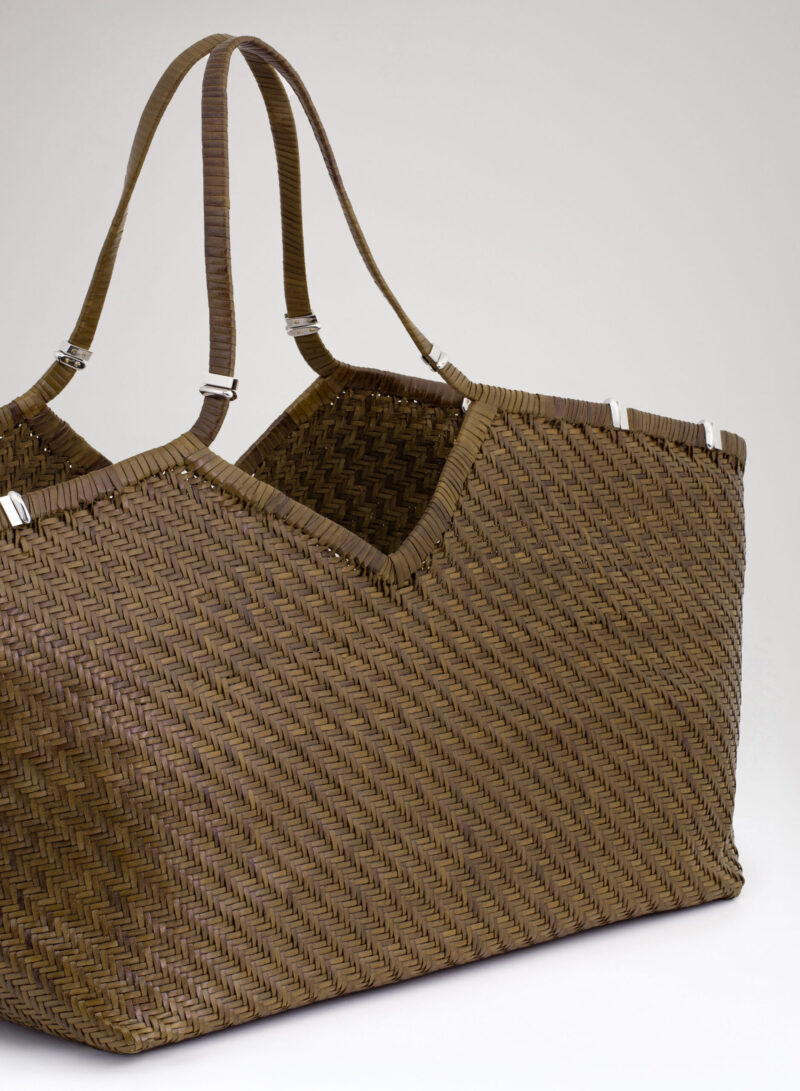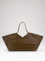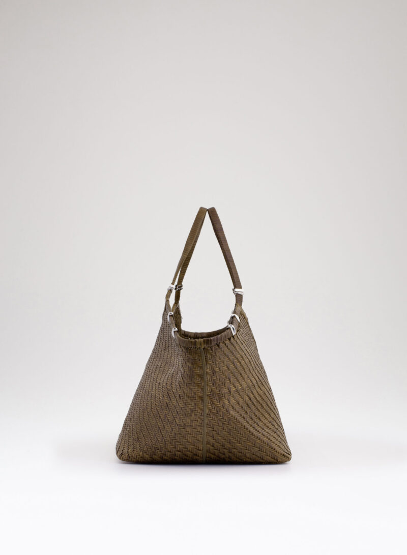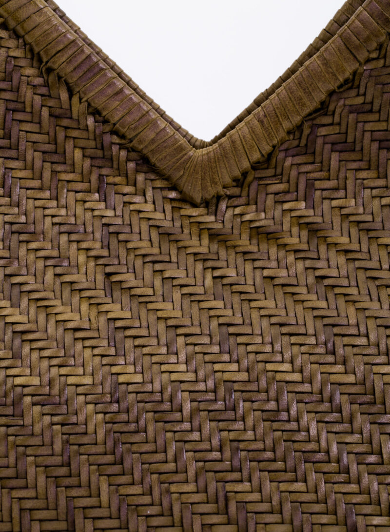 Usha è una shopping bag intrecciata a mano su telaio, realizzata in pelle di bufalo selezionata per la sua resistenza e morbidezza. Il bordo superiore è rifinito con un intreccio raddoppiato, che avvolge tutta la silhouette in un gesto continuo. Il manico, allungato e flessuoso, slancia la forma e permette di portarla a spalla o a mano con naturalezza.