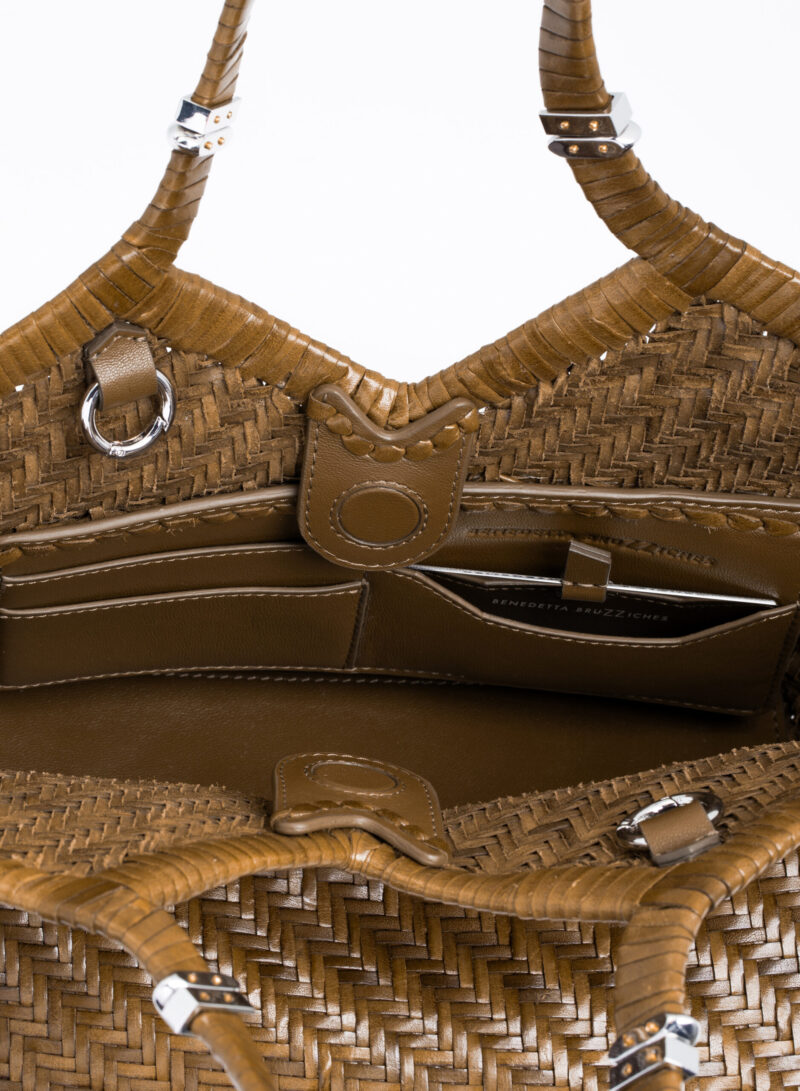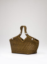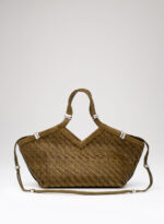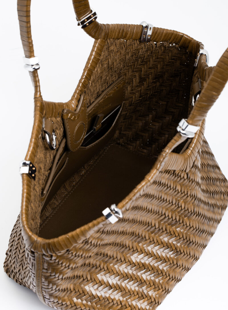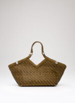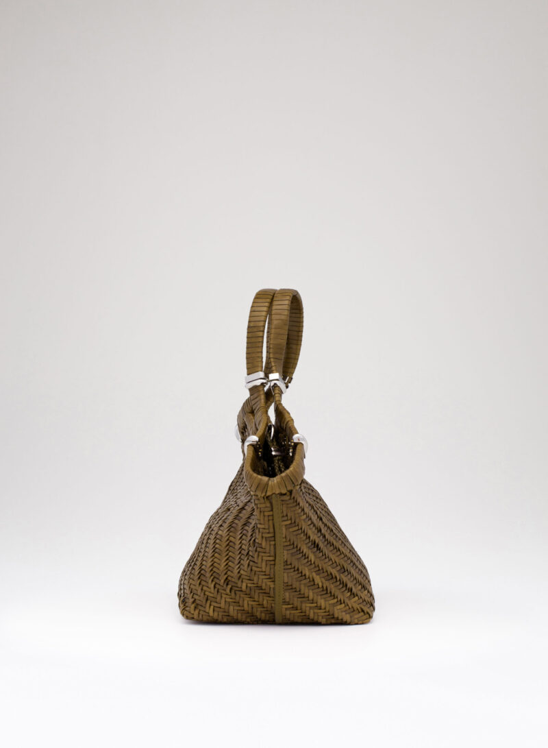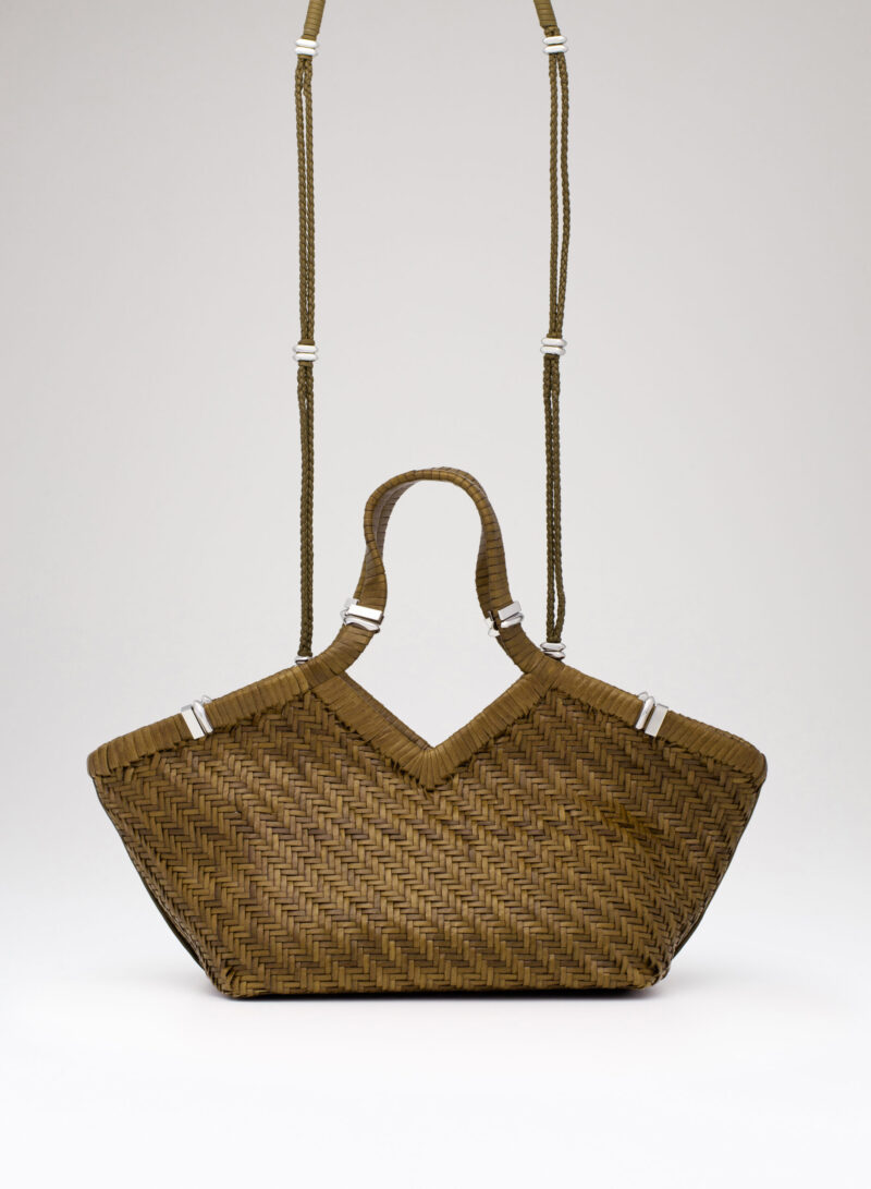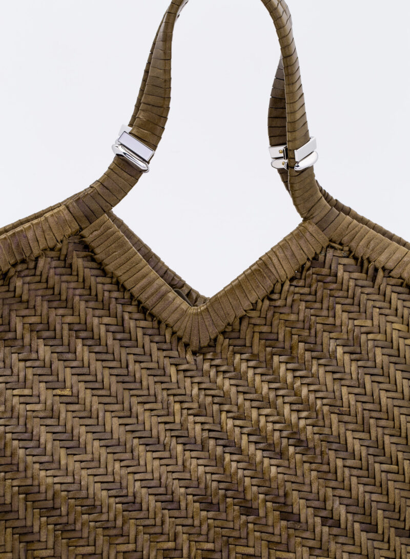 Usha è una shopping bag intrecciata a mano su telaio, realizzata in pelle di bufalo selezionata per la sua resistenza e morbidezza. Il bordo superiore è rifinito con un intreccio raddoppiato, che avvolge tutta la silhouette in un gesto continuo. Il manico, allungato e flessuoso, slancia la forma e permette di portarla a spalla o a mano con naturalezza.