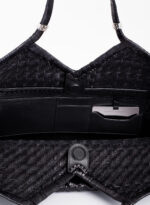 All’interno, la borsa è dotata di una chiusura a calamita invisibile e di un ampio pannello organizzato con tasche per carte di credito, una tasca con zip, e uno specchio da borsa.