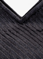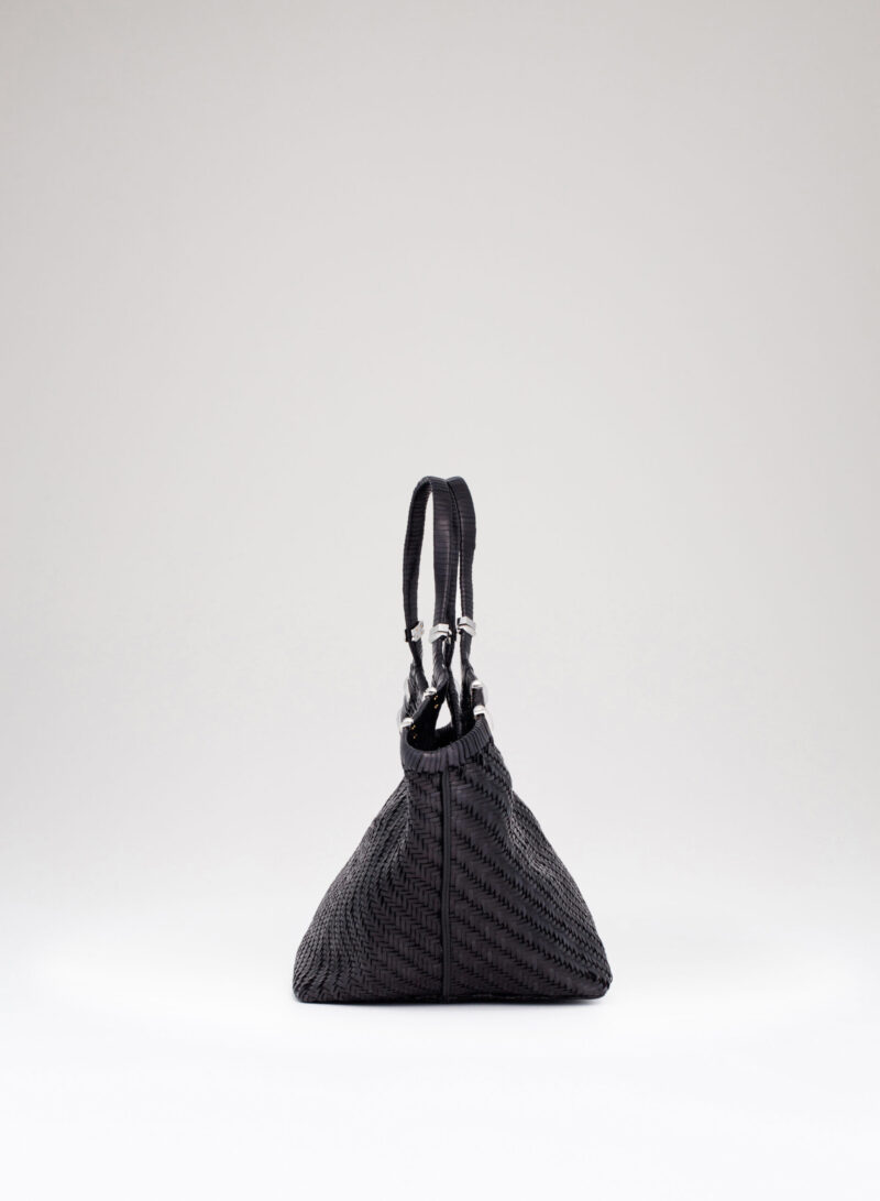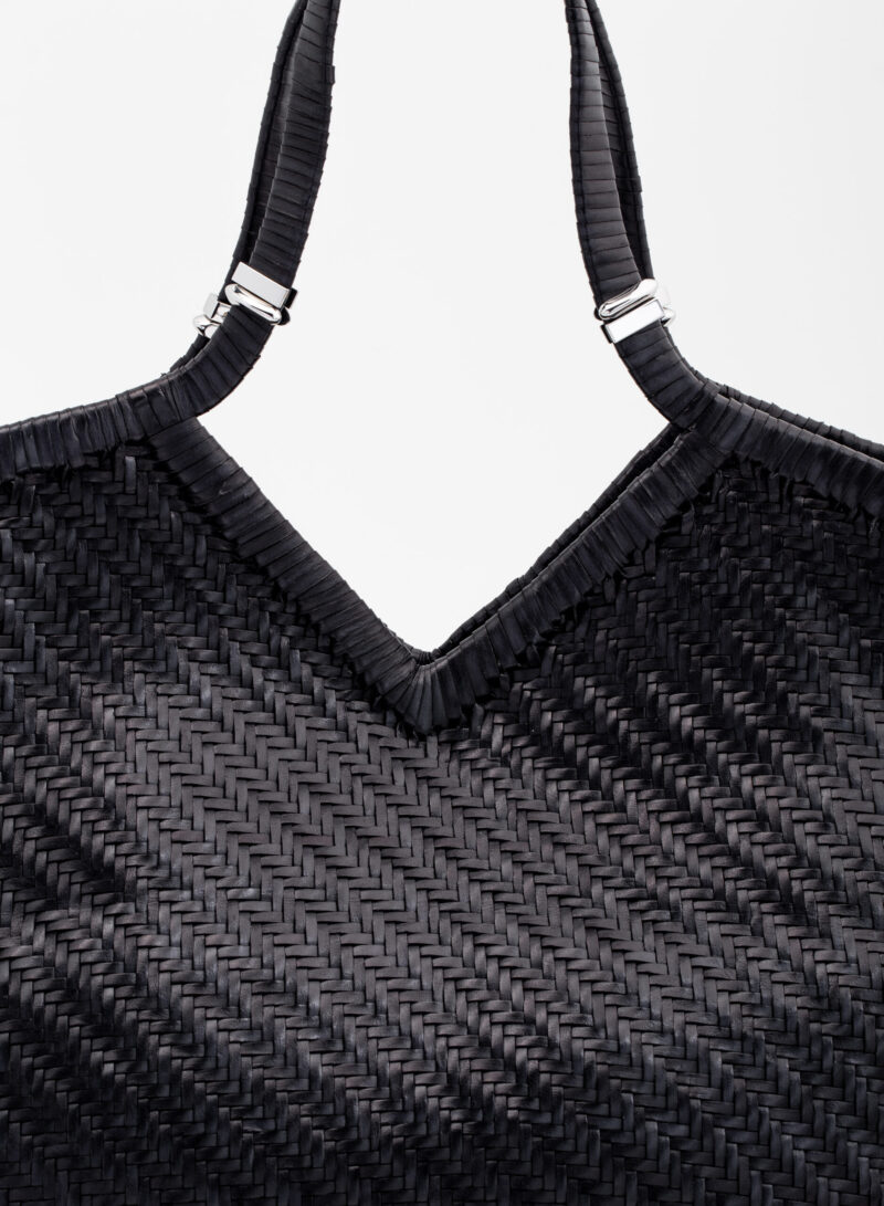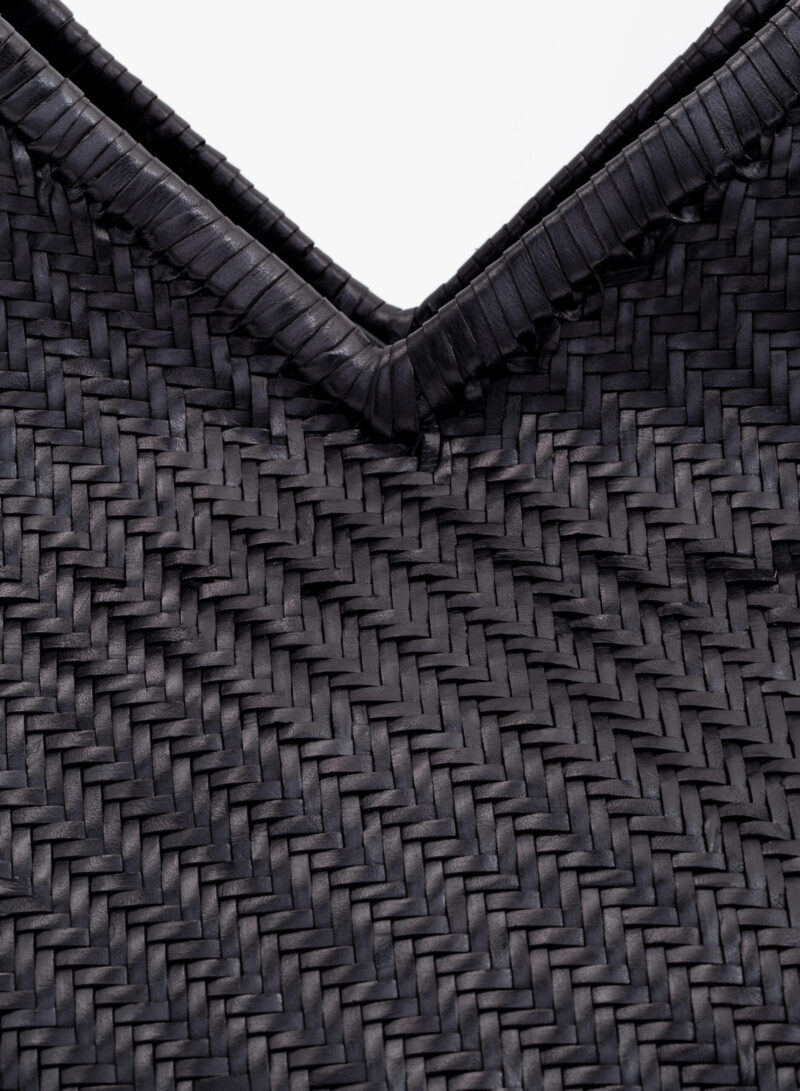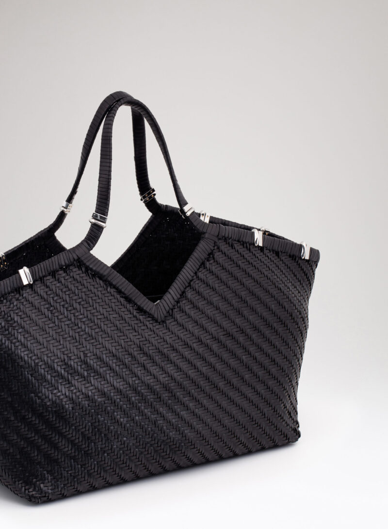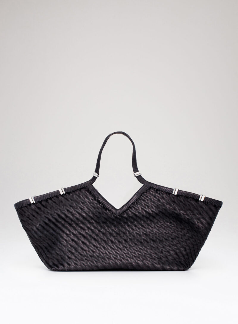 Usha è una shopping bag intrecciata a mano su telaio, realizzata in pelle di bufalo selezionata per la sua resistenza e morbidezza. Il bordo superiore è rifinito con un intreccio raddoppiato, che avvolge tutta la silhouette in un gesto continuo. Il manico, allungato e flessuoso, slancia la forma e permette di portarla a spalla o a mano con naturalezza.