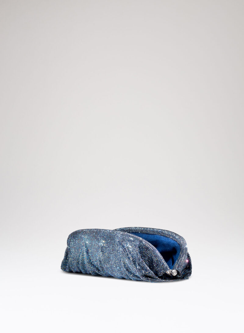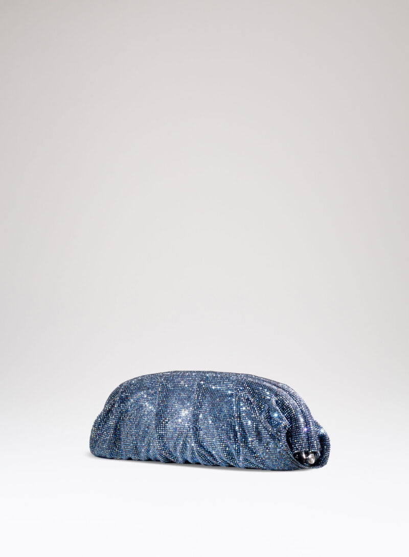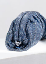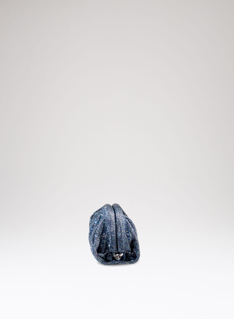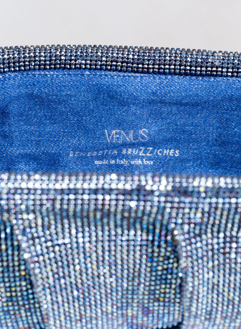 Dalle forme morbide e ondulate, Venus è realizzata con una rete di scintillanti cristalli cucita a mano con la stessa attenzione che si dedicherebbe a un gioiello. Al suo interno, una pochette in denim è pronta ad accogliere il necessario per una serata fuori.