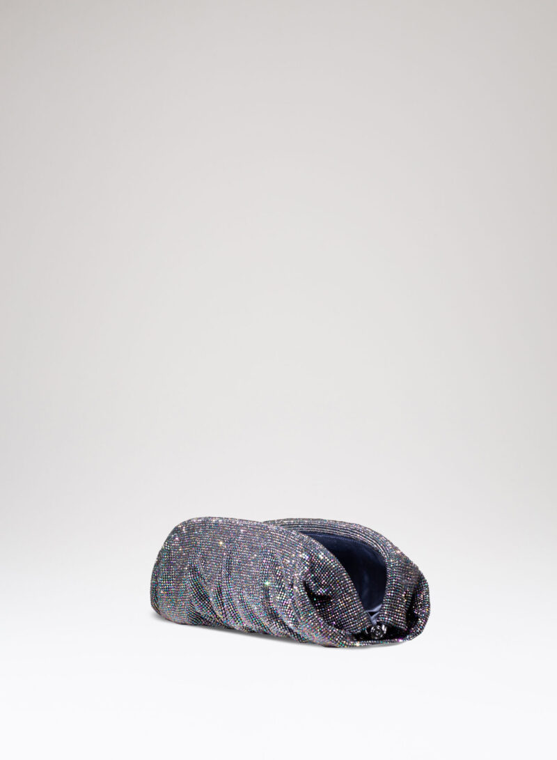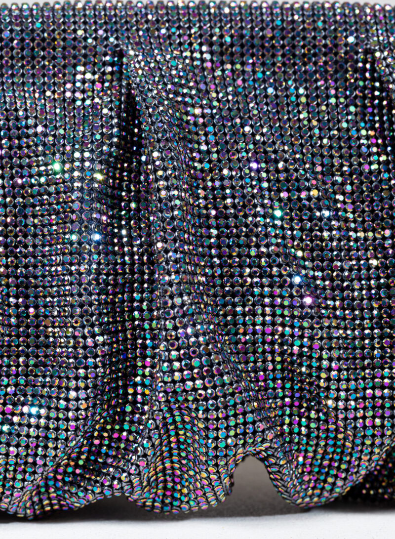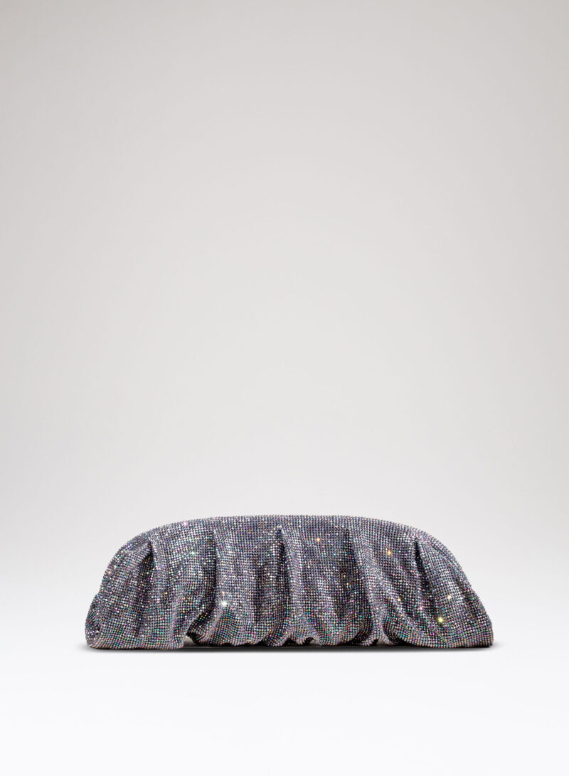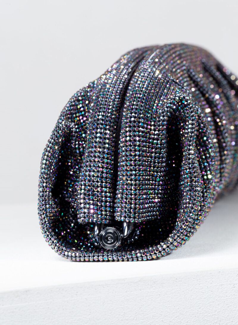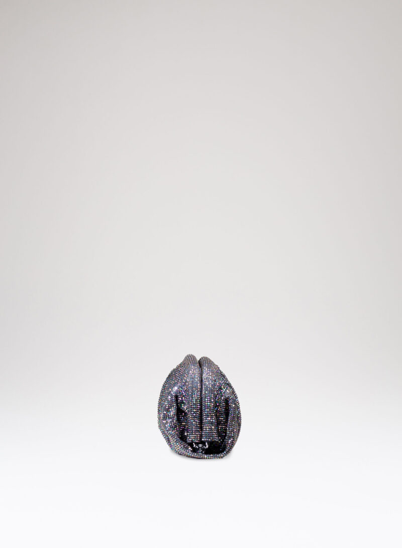 Dalle forme morbide e ondulate, Venus è realizzata con una rete di scintillanti cristalli cucita a mano con la stessa attenzione che si dedicherebbe a un gioiello. Al suo interno, una pochette in raso di seta è pronta ad accogliere il necessario per una serata fuori.