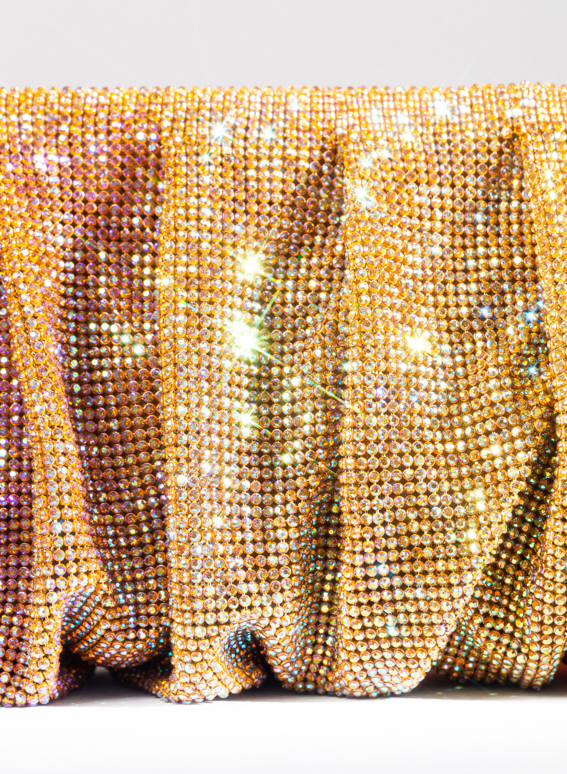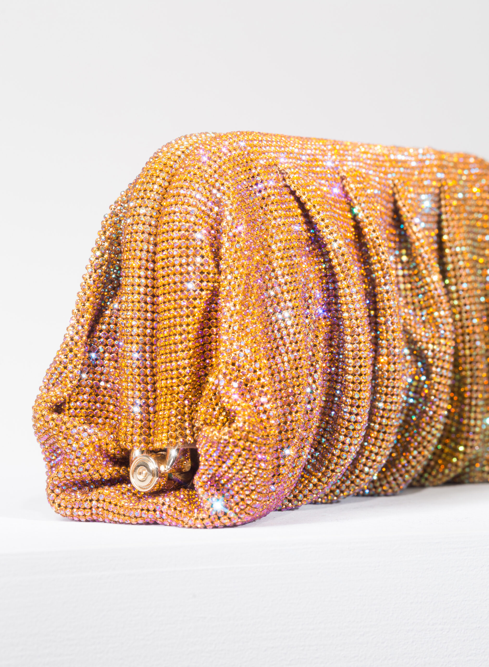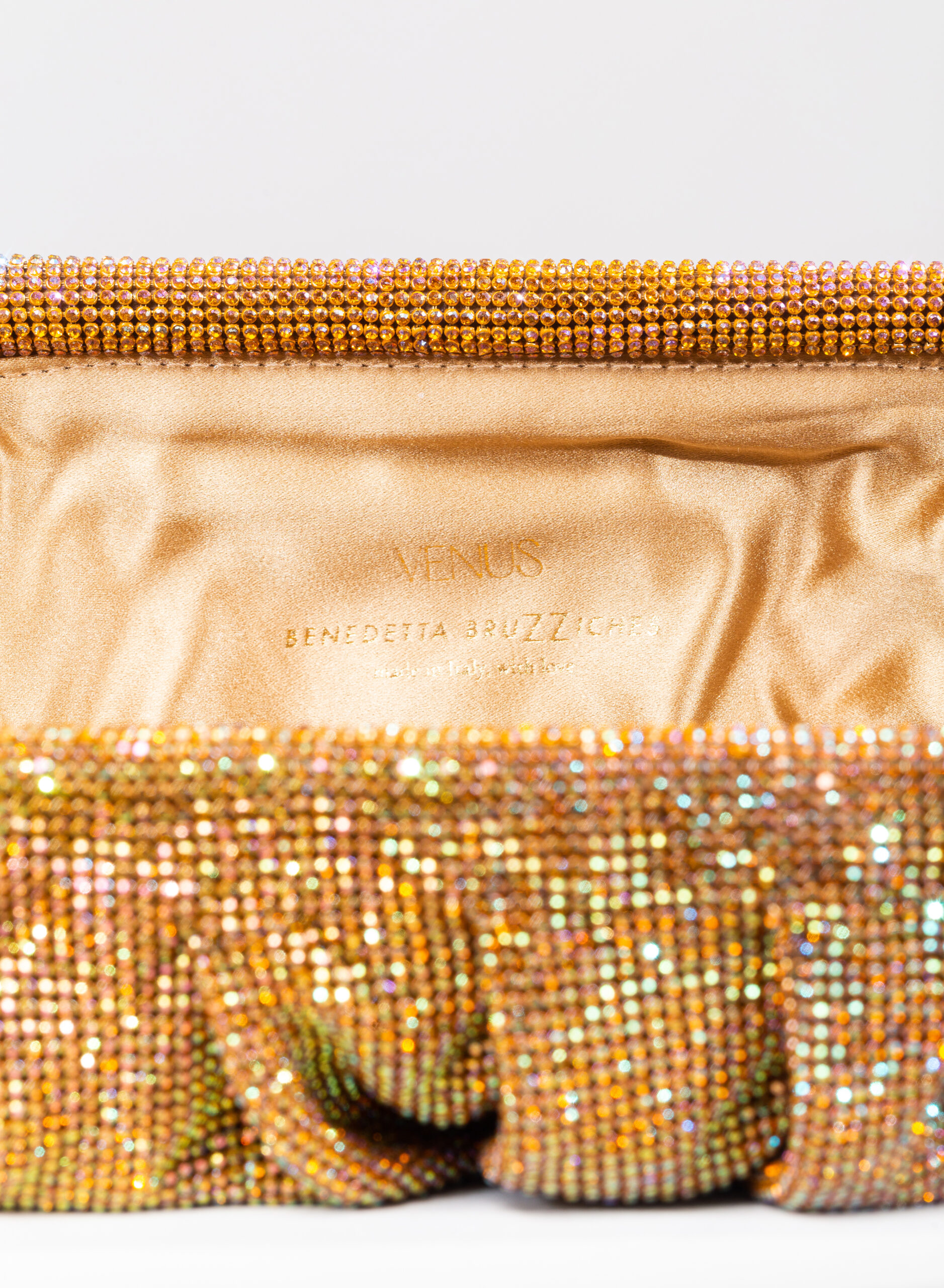 Accolgo l’amore che mi attraversa come un’onda che rotola, si frange sulla roccia e spuma. Come un acquazzone che fuma, ribolle e feconda la terra arsa. Come un profumo che sale dal mare, spande e satura l’aria d’intorno. Così il mio corpo rinasce in Venere. Questa pochette è un omaggio alla dea dell’Amore e della Bellezza e al magico momento in cui ogni donna, che ama ed è riamata, si trasforma. Da mortale diventa dea in una perfetta personificazione di Venere. Dalle forme morbide e ondulate, Venus è realizzata con una rete di scintillanti cristalli cucita a mano con la…