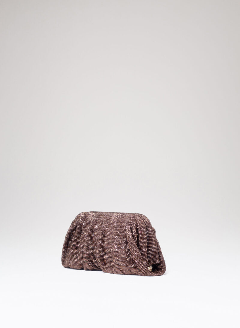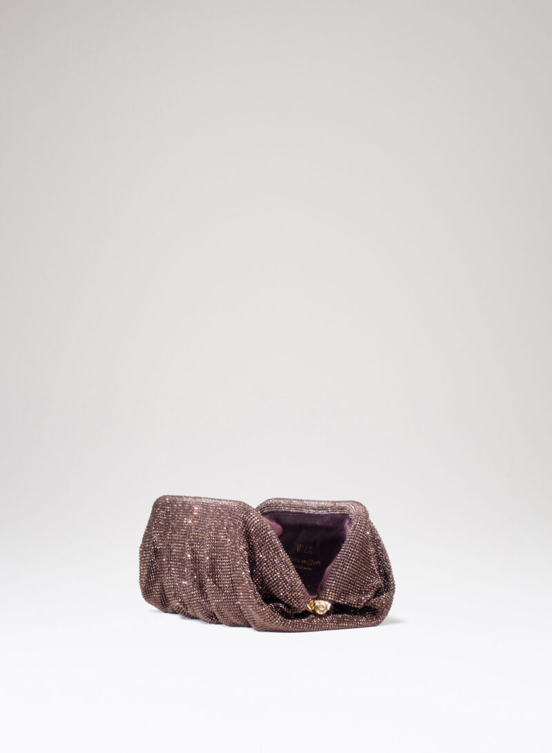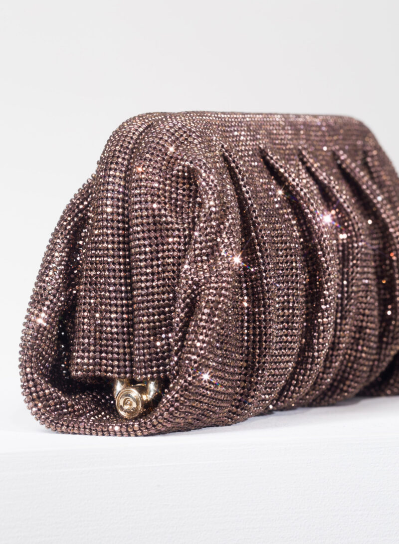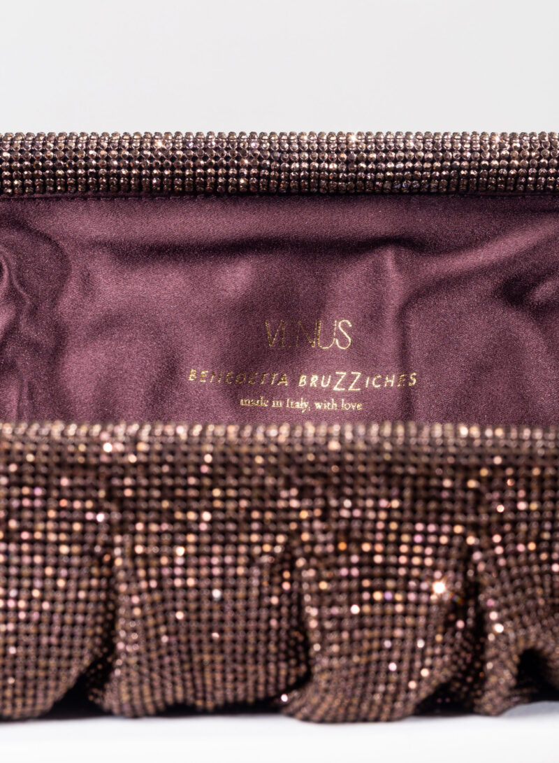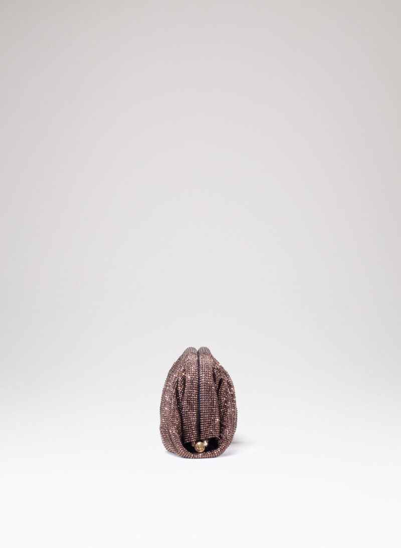 Dalle forme morbide e ondulate, Venus è realizzata con una rete di scintillanti cristalli cucita a mano con la stessa attenzione che si dedicherebbe a un gioiello. Al suo interno, una pochette in raso di seta è pronta ad accogliere il necessario per una serata fuori.