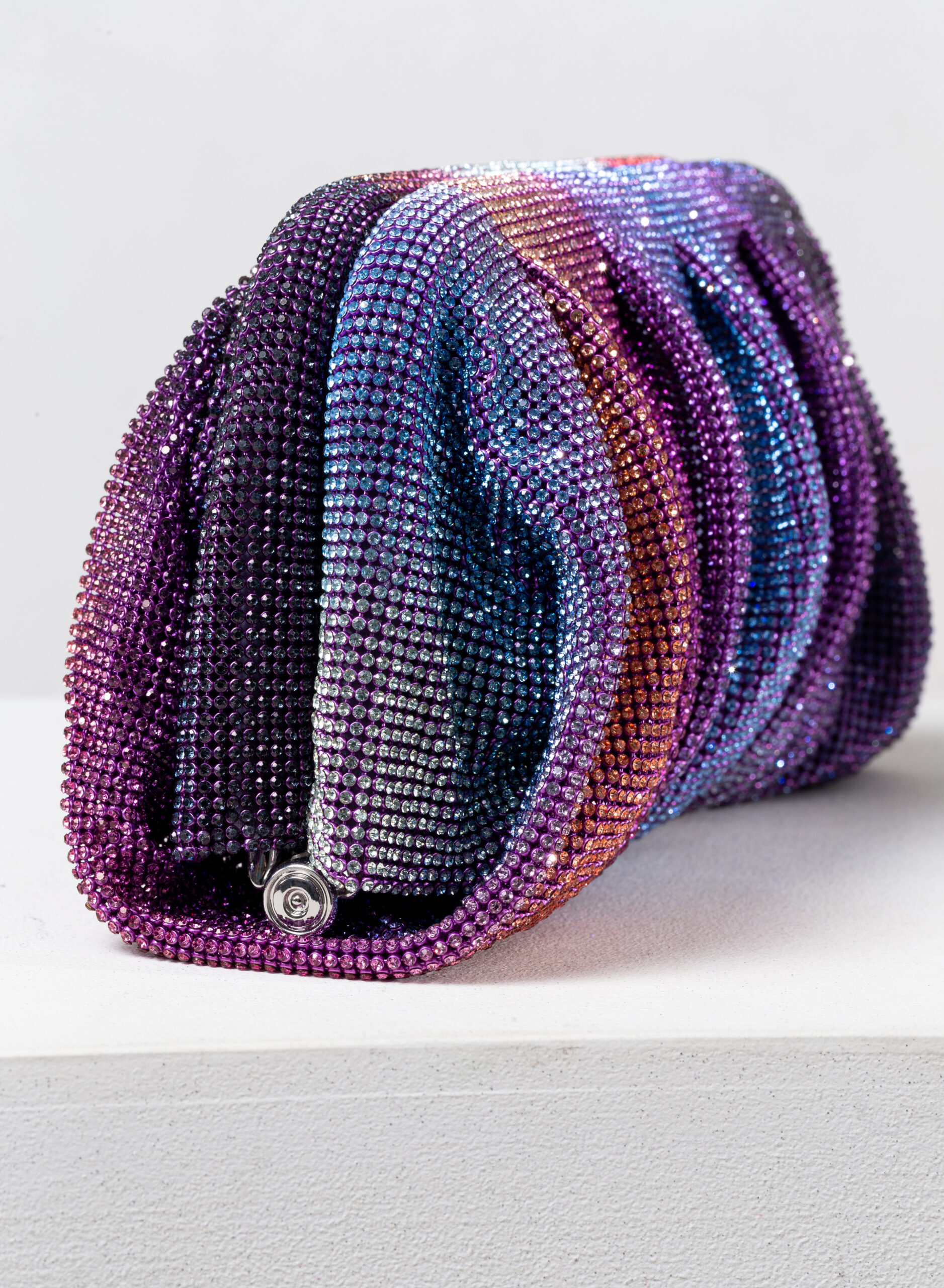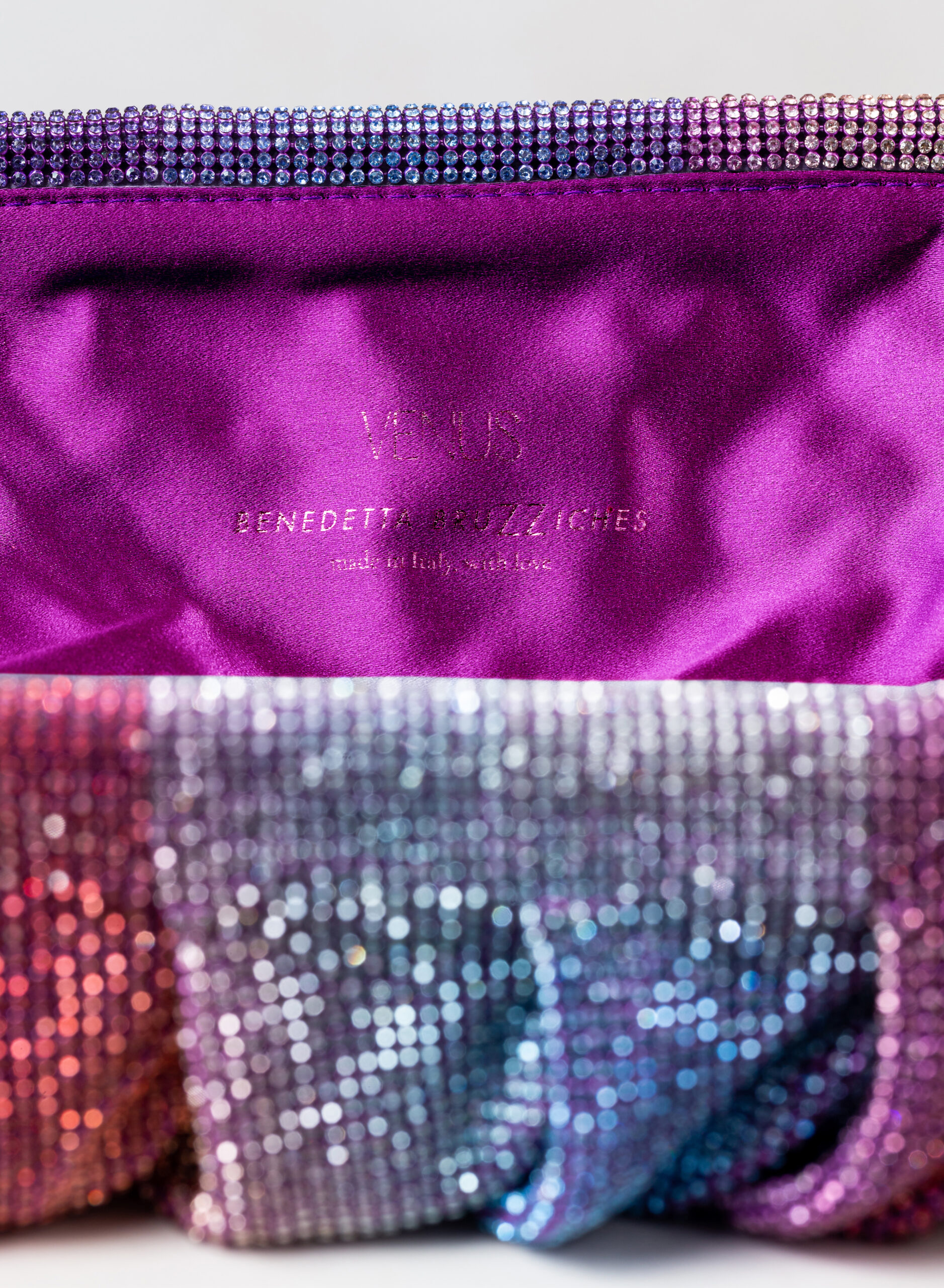 Accolgo l’amore che mi attraversa come un’onda che rotola, si frange sulla roccia e spuma. Come un acquazzone che fuma, ribolle e feconda la terra arsa. Come un profumo che sale dal mare, spande e satura l’aria d’intorno. Così il mio corpo rinasce in Venere. Questa pochette è un omaggio alla dea dell’Amore e della Bellezza e al magico momento in cui ogni donna, che ama ed è riamata, si trasforma. Da mortale diventa dea in una perfetta personificazione di Venere. Dalle forme morbide e ondulate, Venus è realizzata con una rete di scintillanti cristalli cucita a mano con la…