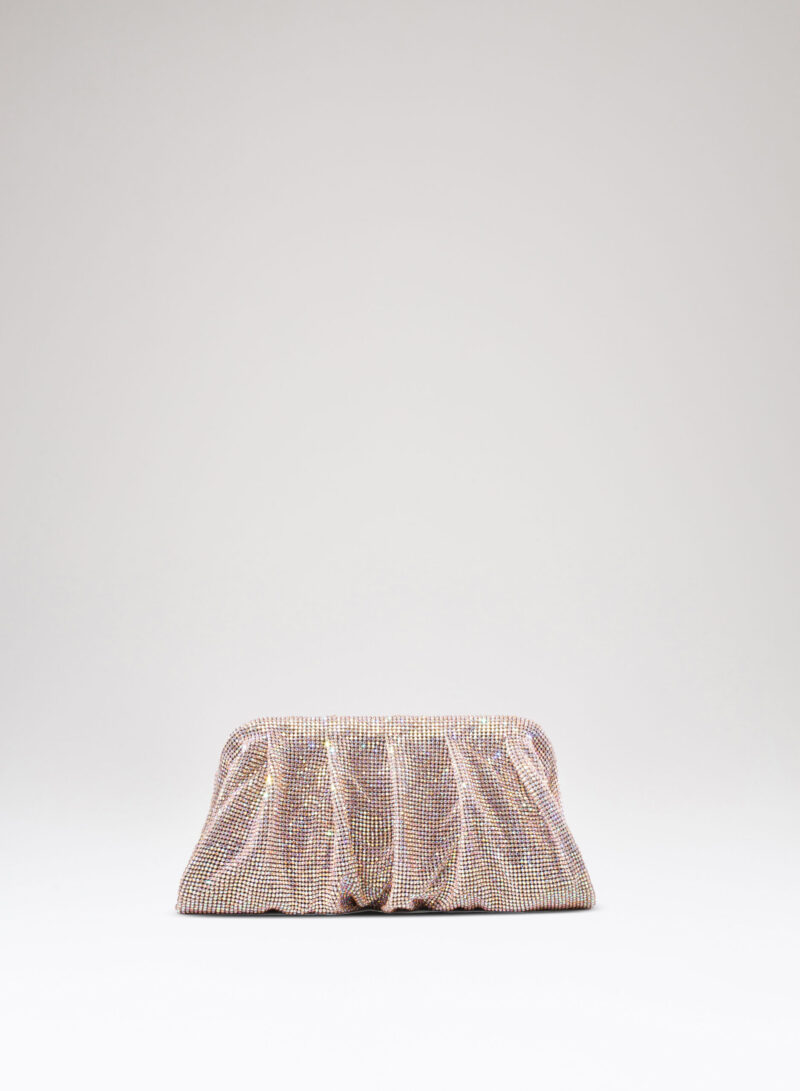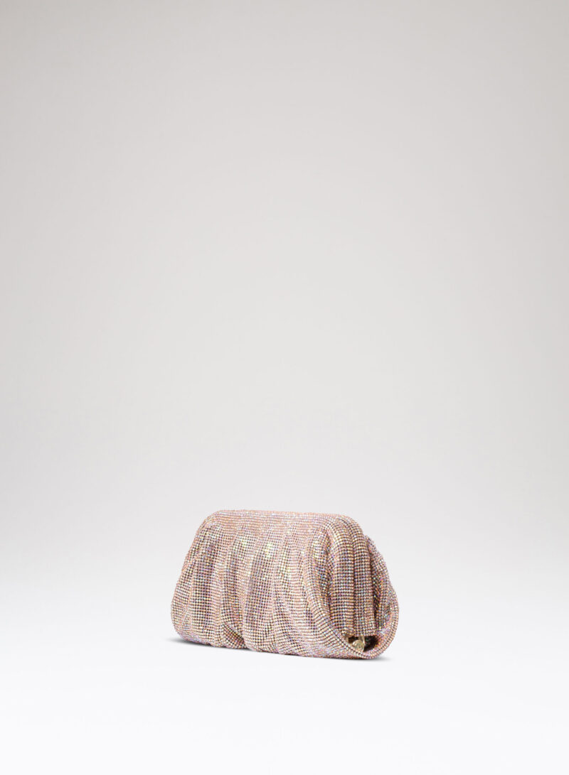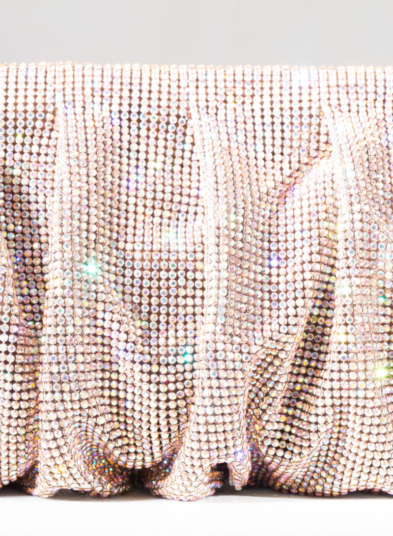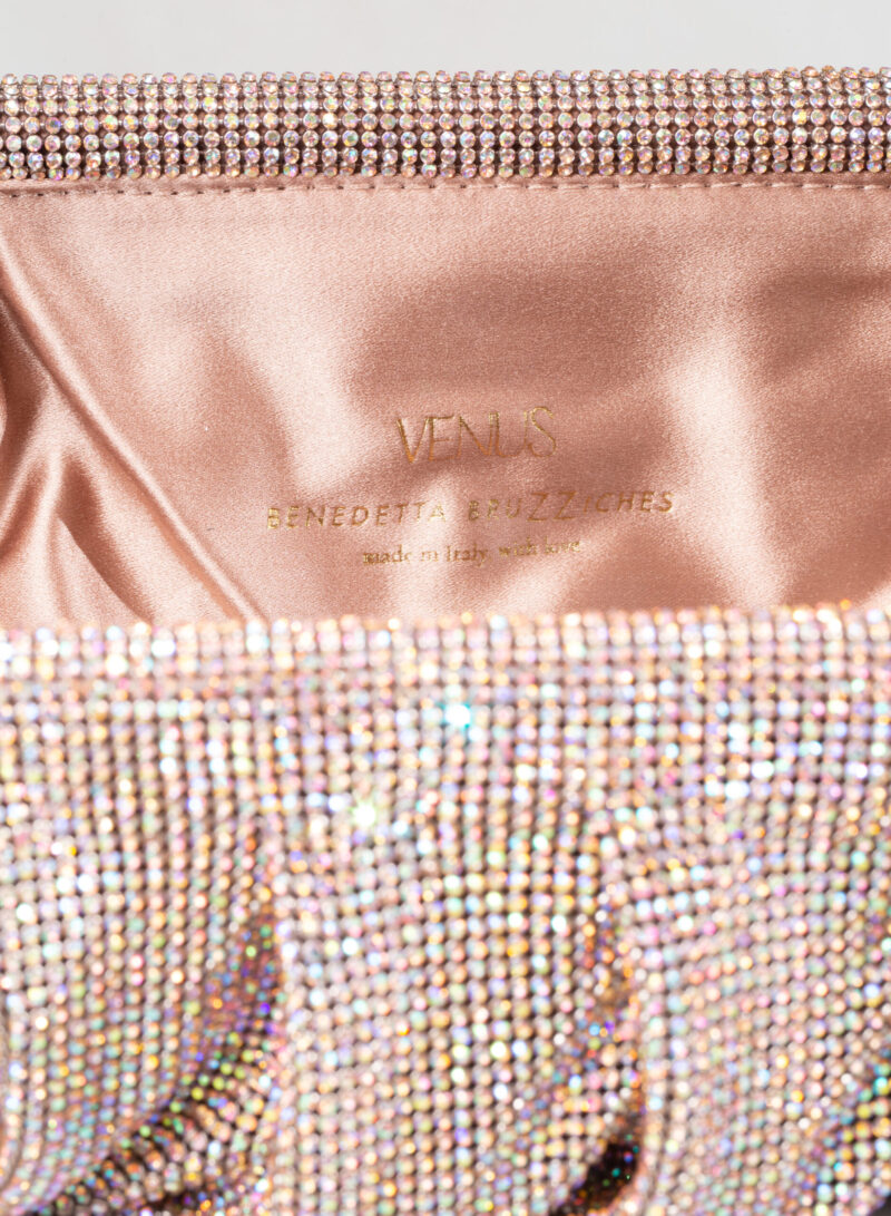 Dalle forme morbide e ondulate, Venus è realizzata con una rete di scintillanti cristalli cucita a mano con la stessa attenzione che si dedicherebbe a un gioiello. Al suo interno, una pochette in raso di seta è pronta ad accogliere il necessario per una serata fuori.