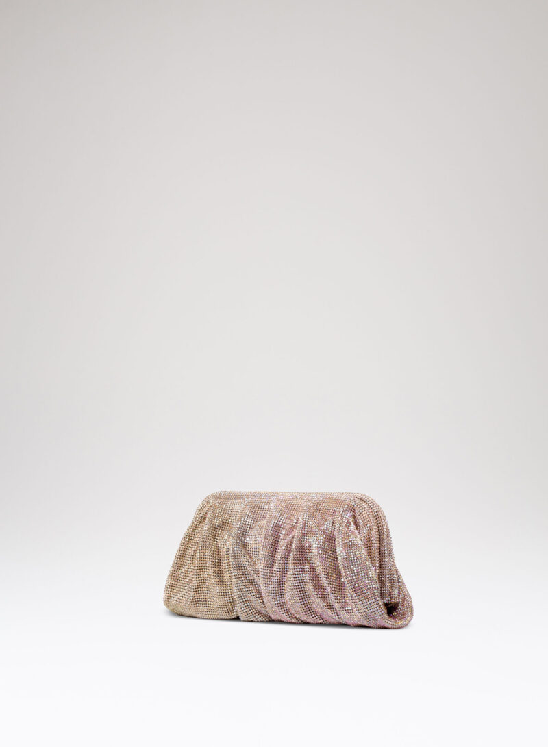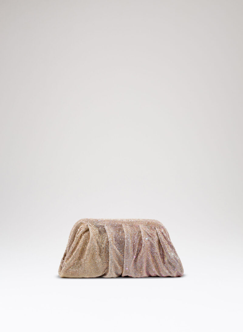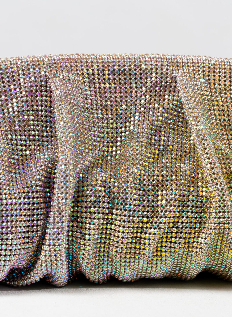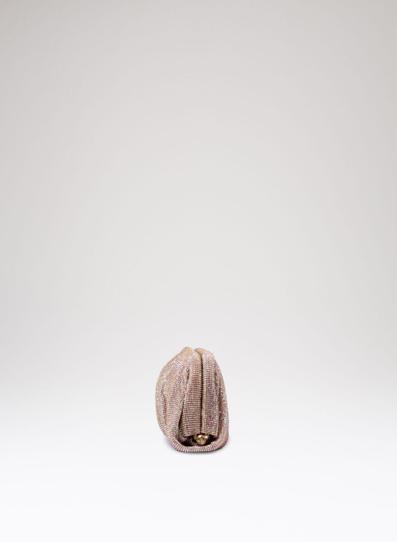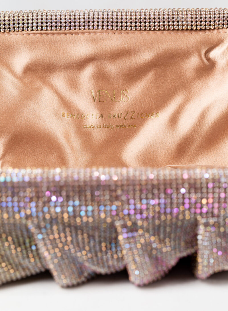Dalle forme morbide e ondulate, Venus è realizzata con una rete di scintillanti cristalli cucita a mano con la stessa attenzione che si dedicherebbe a un gioiello. Al suo interno, una pochette in raso di seta è pronta ad accogliere il necessario per una serata fuori.