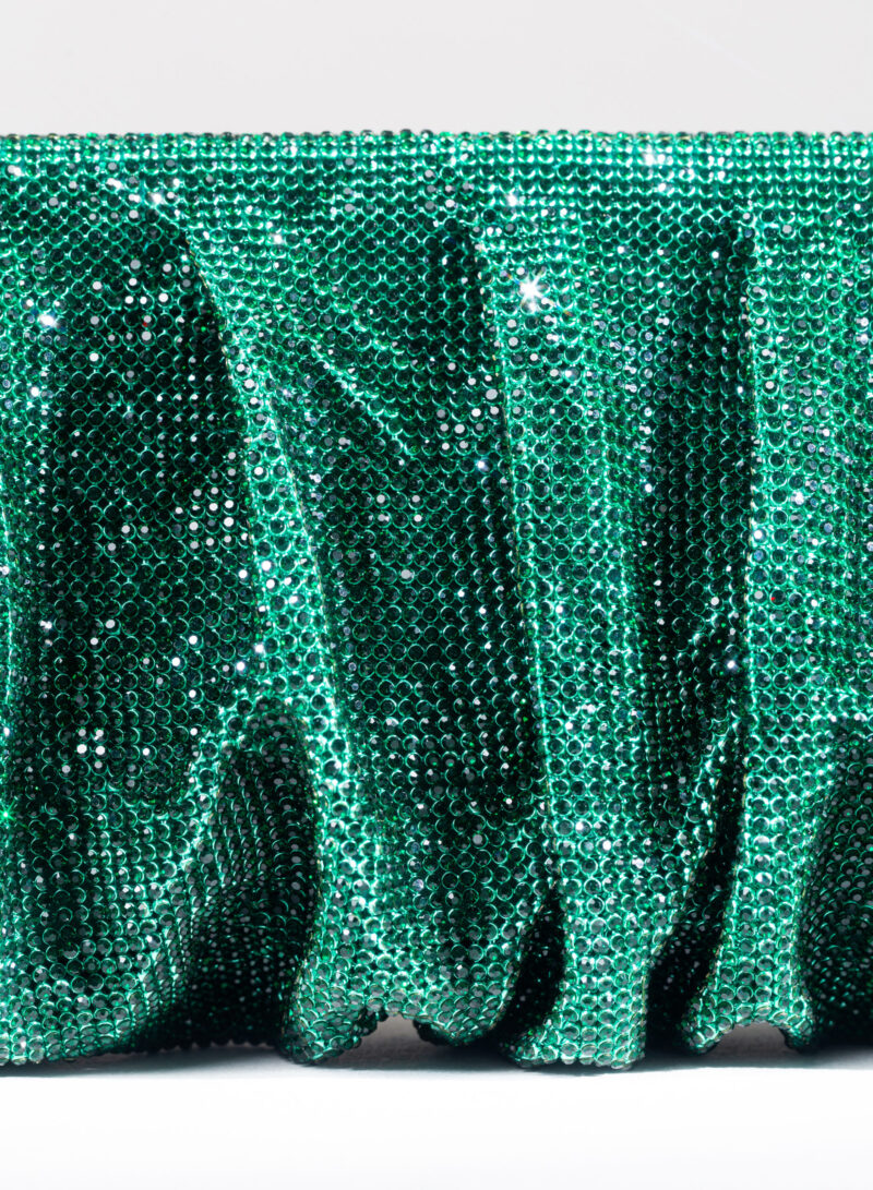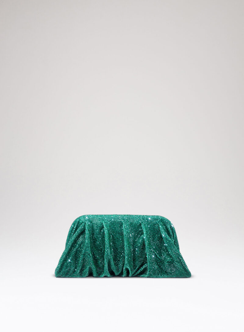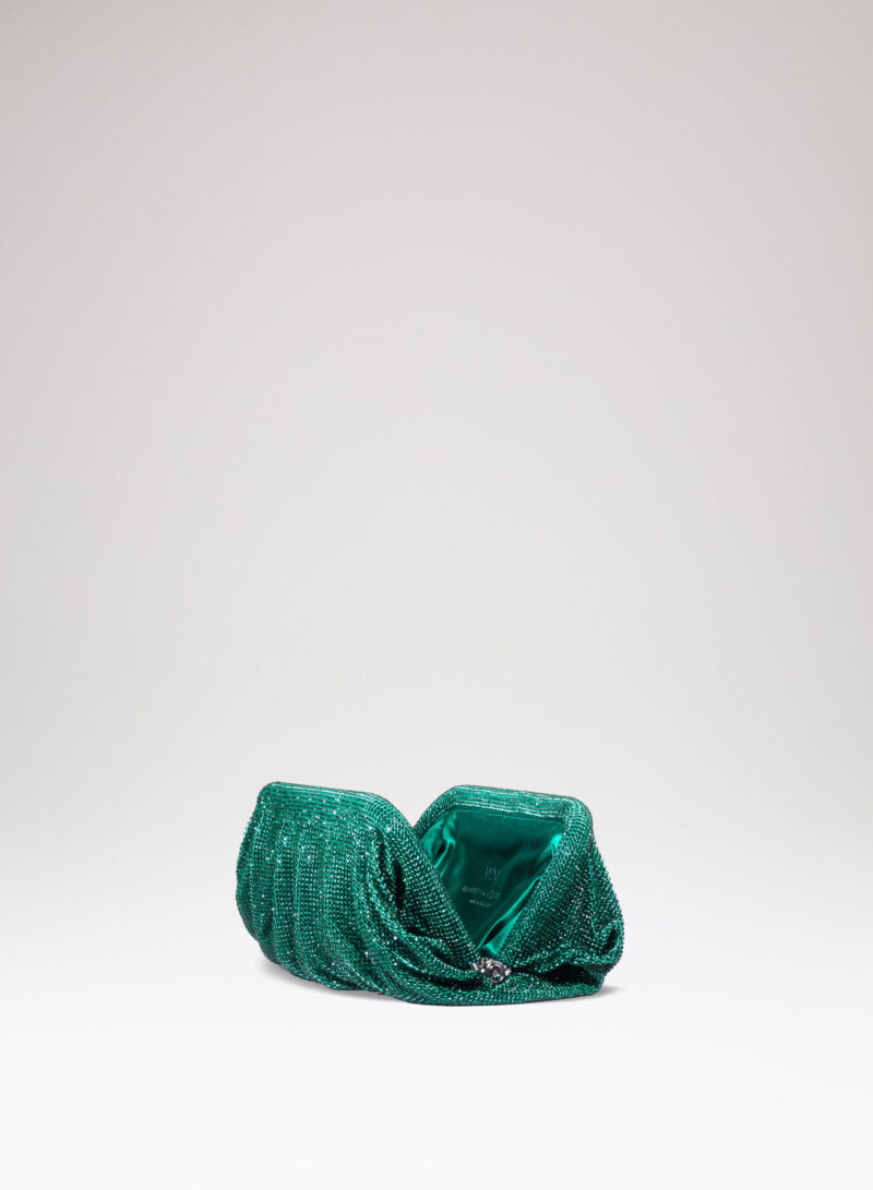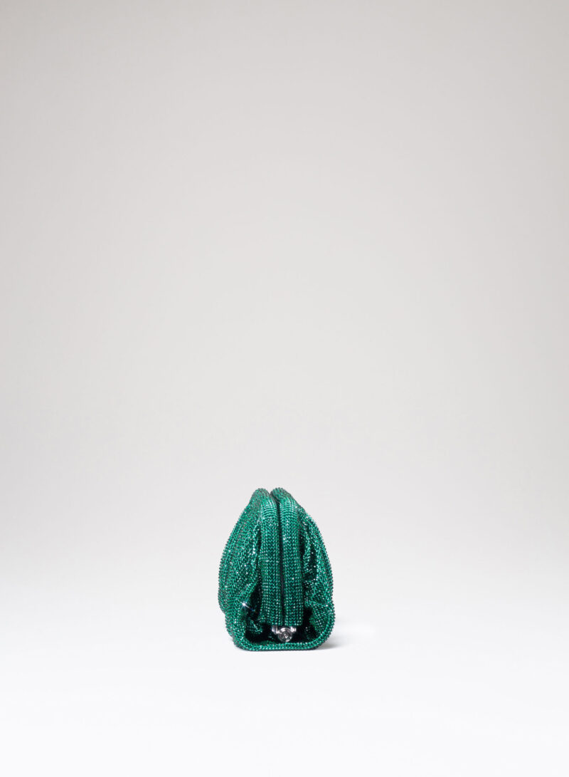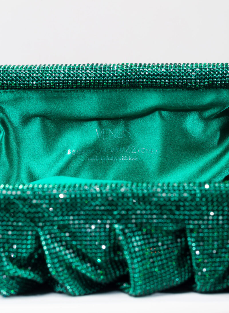 Dalle forme morbide e ondulate, Venus è realizzata con una rete di scintillanti cristalli cucita a mano con la stessa attenzione che si dedicherebbe a un gioiello. Al suo interno, una pochette in raso di seta è pronta ad accogliere il necessario per una serata fuori.
