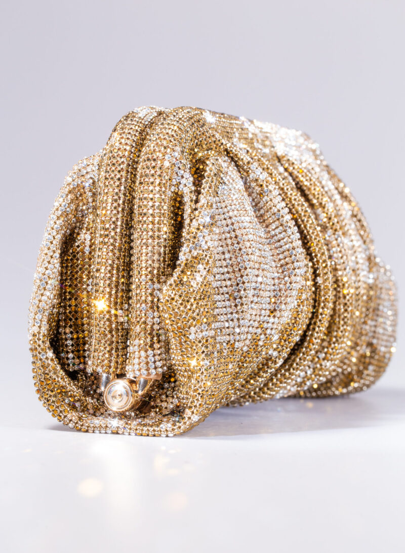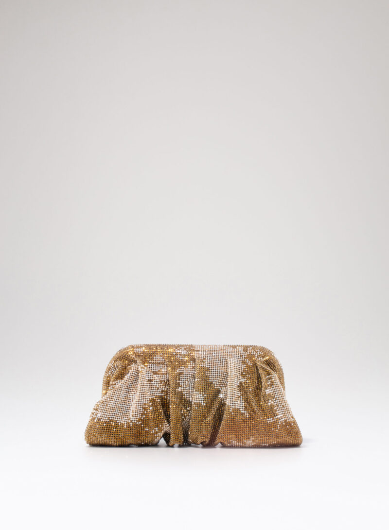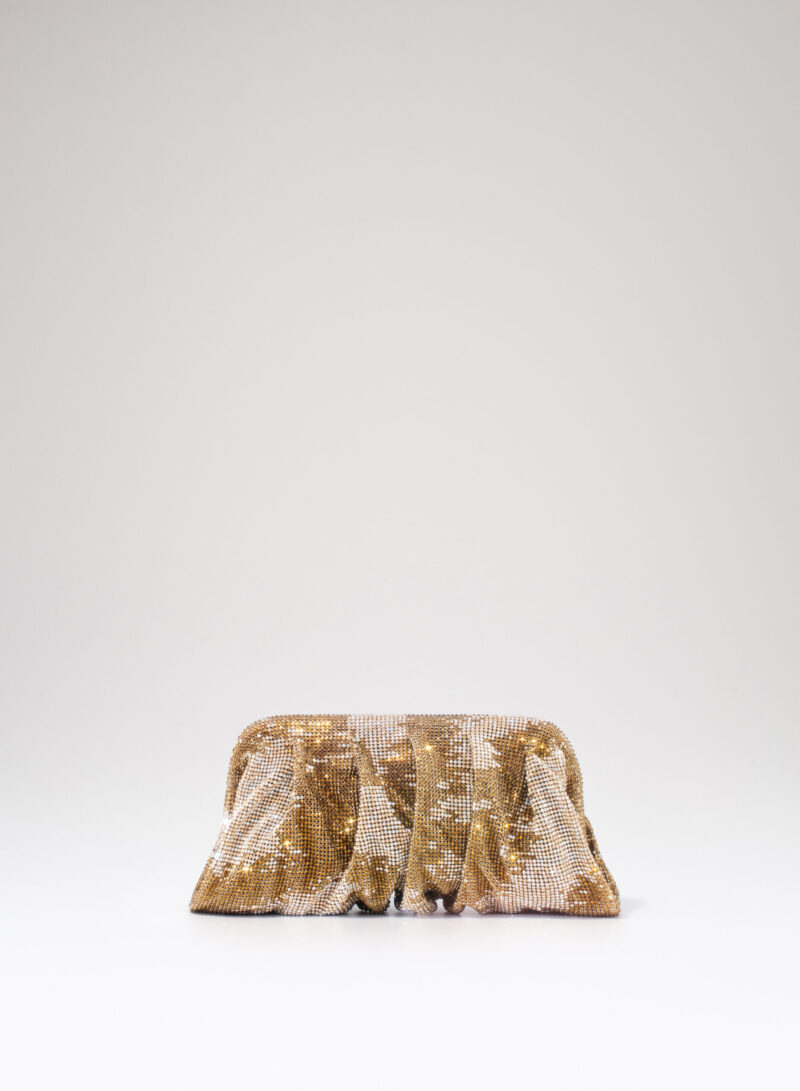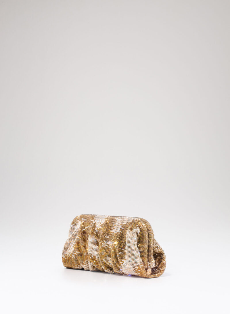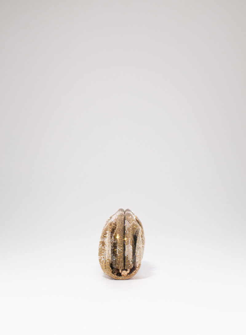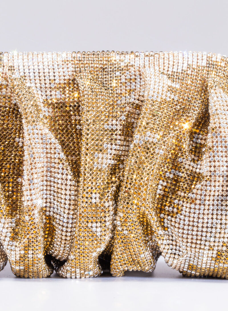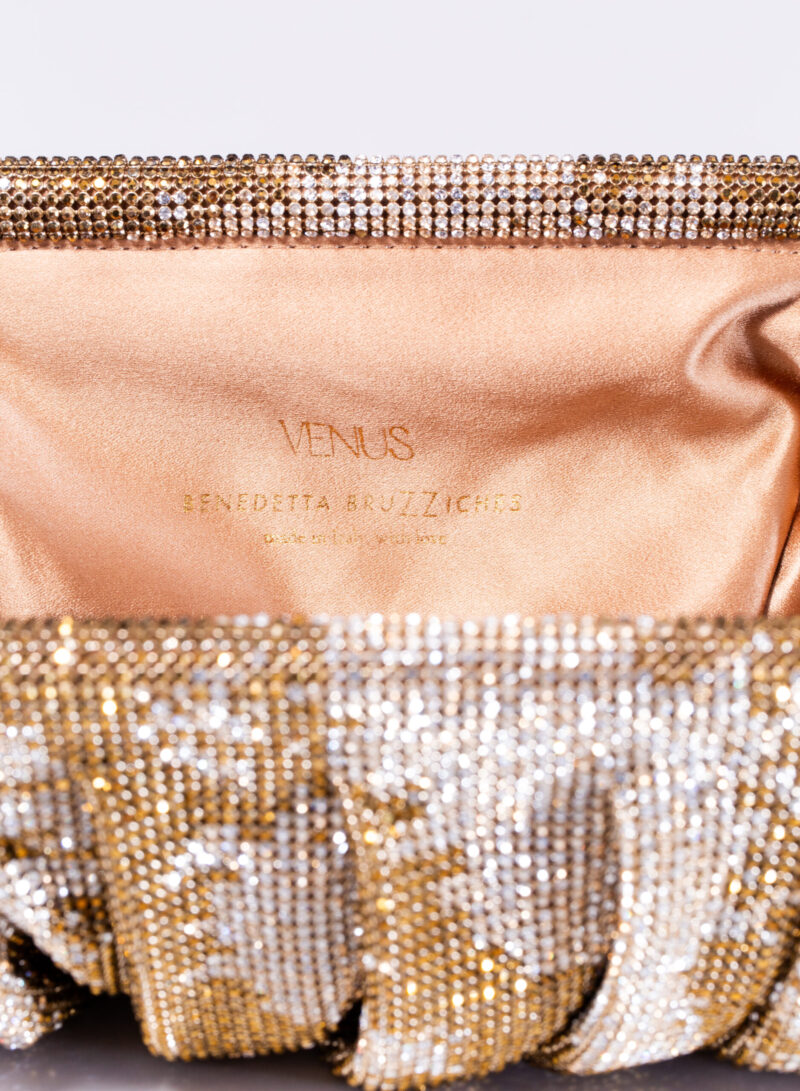 Dalle forme morbide e ondulate, Venus è realizzata con una rete di scintillanti cristalli cucita a mano con la stessa attenzione che si dedicherebbe a un gioiello. Al suo interno, una pochette in raso di seta è pronta ad accogliere il necessario per una serata fuori.
