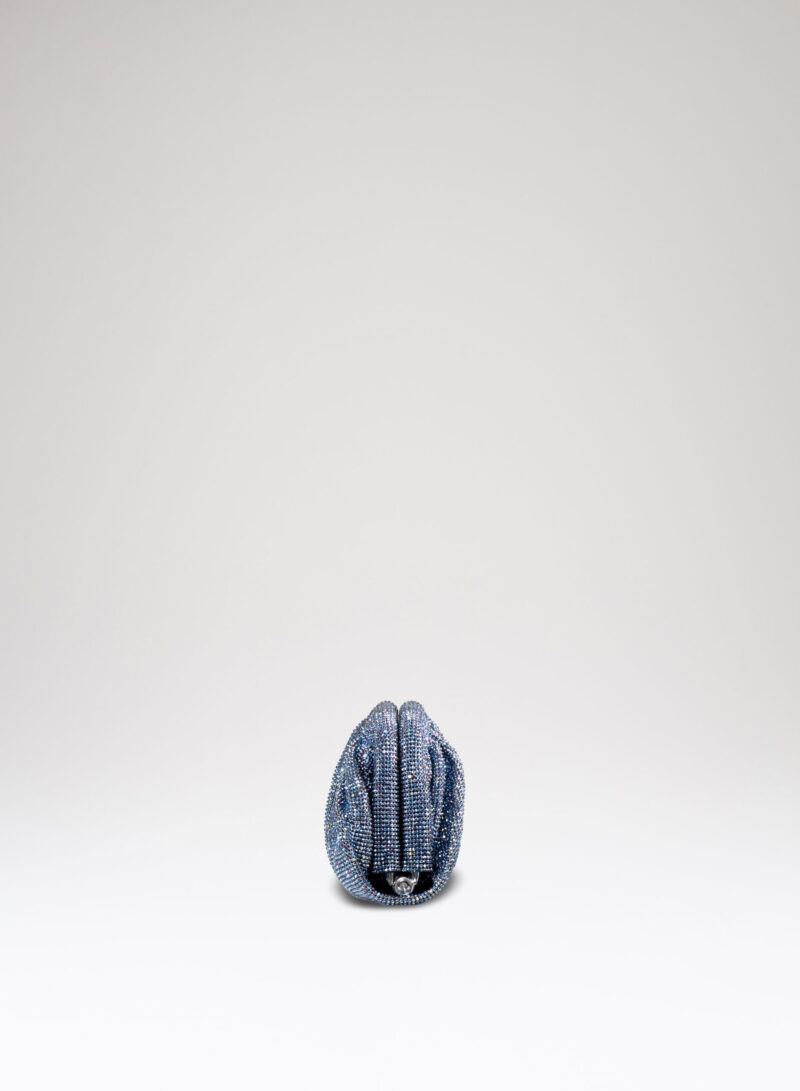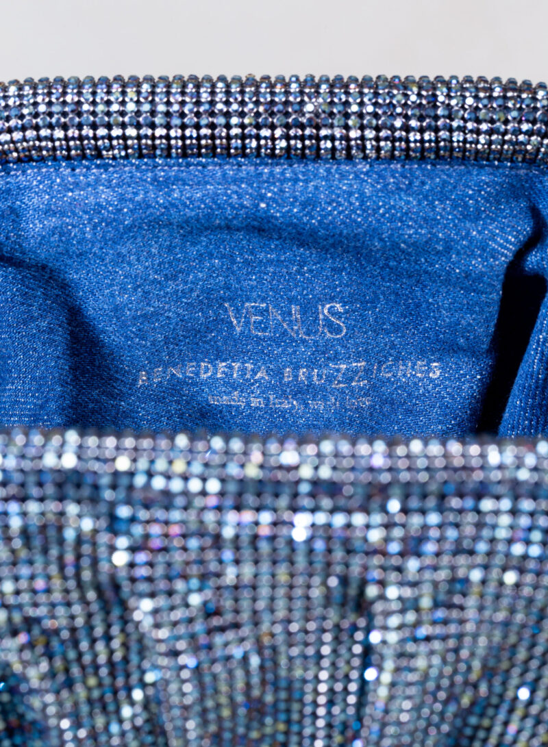 Dalle forme morbide e ondulate, Venus è realizzata con una rete di scintillanti cristalli cucita a mano con la stessa attenzione che si dedicherebbe a un gioiello. Al suo interno, una pochette in denim è pronta ad accogliere il necessario per una serata fuori.