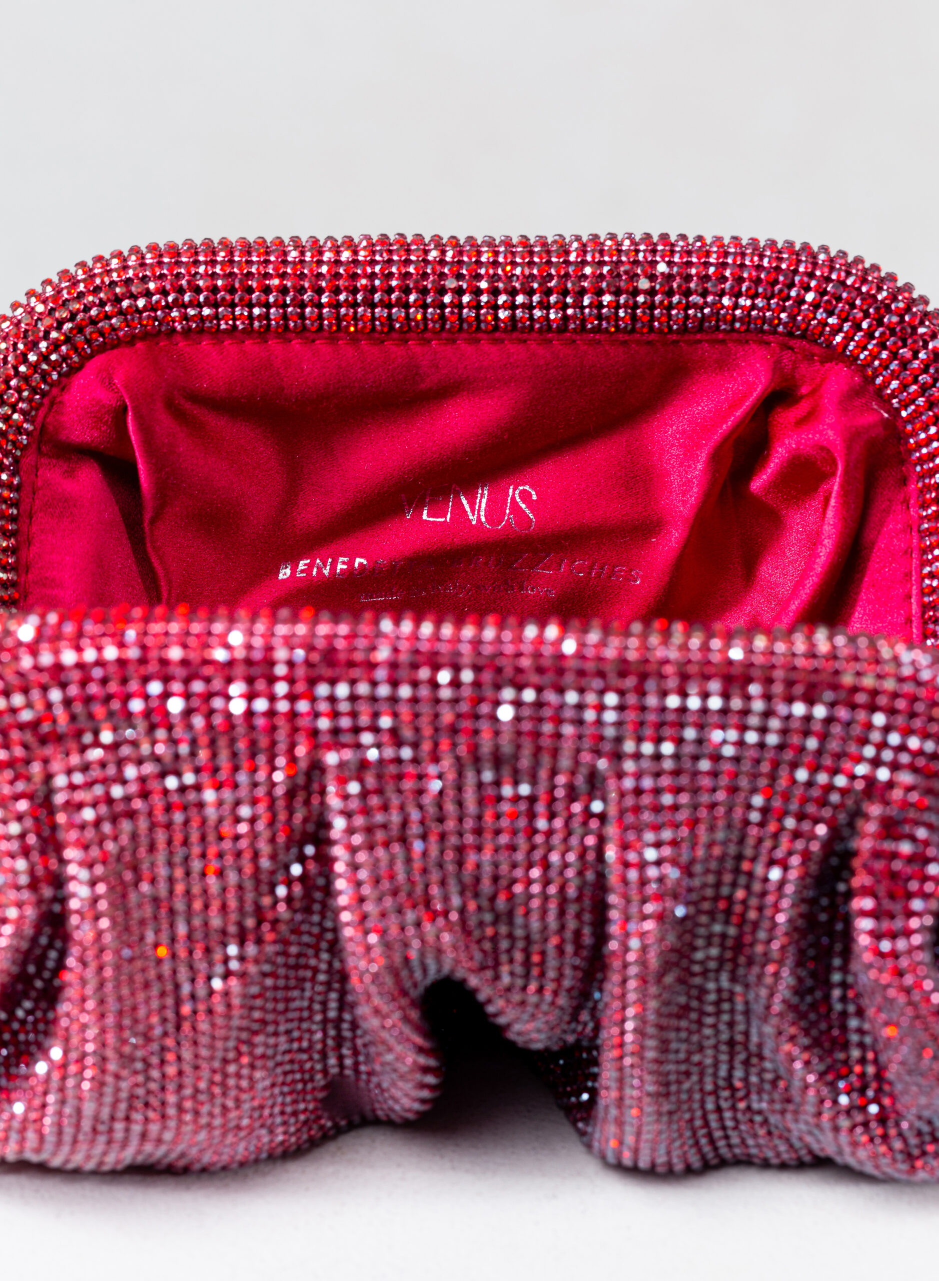 Accolgo l’amore che mi attraversa come un’onda che rotola, si frange sulla roccia e spuma. Come un acquazzone che fuma, ribolle e feconda la terra arsa. Come un profumo che sale dal mare, spande e satura l’aria d’intorno. Così il mio corpo rinasce in Venere. Questa pochette è un omaggio alla dea dell’Amore e della Bellezza e al magico momento in cui ogni donna, che ama ed è riamata, si trasforma. Da mortale diventa dea in una perfetta personificazione di Venere. Dalle forme morbide e ondulate, Venus è realizzata con una rete di scintillanti cristalli cucita a mano con la…