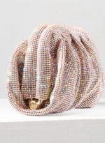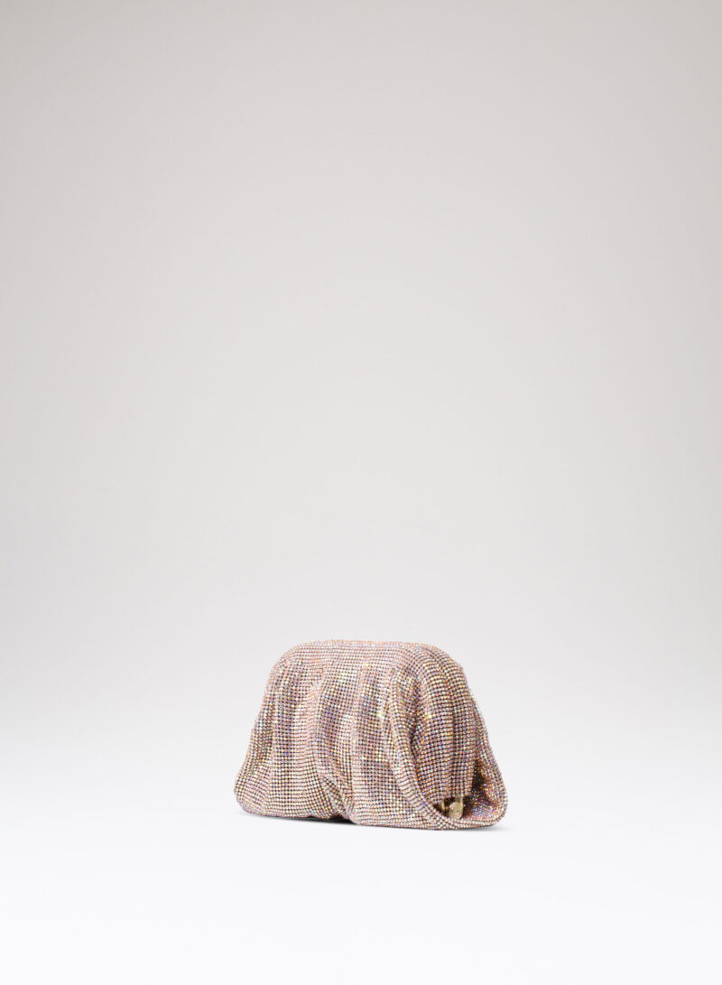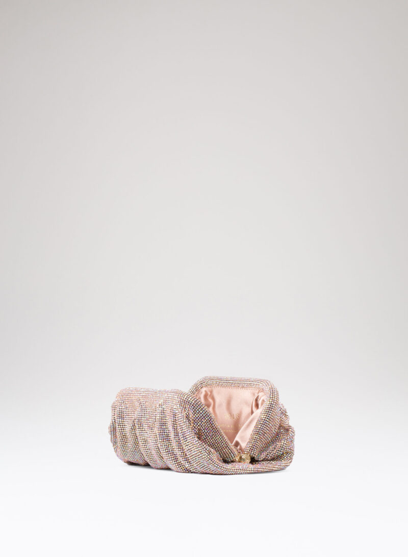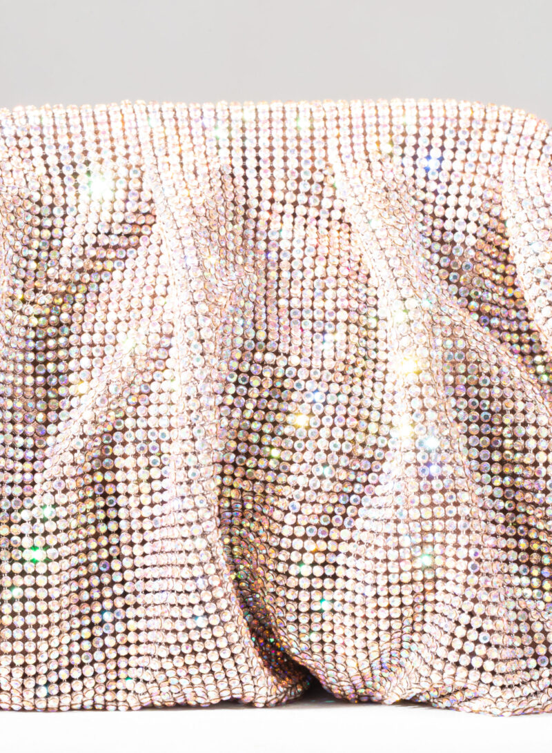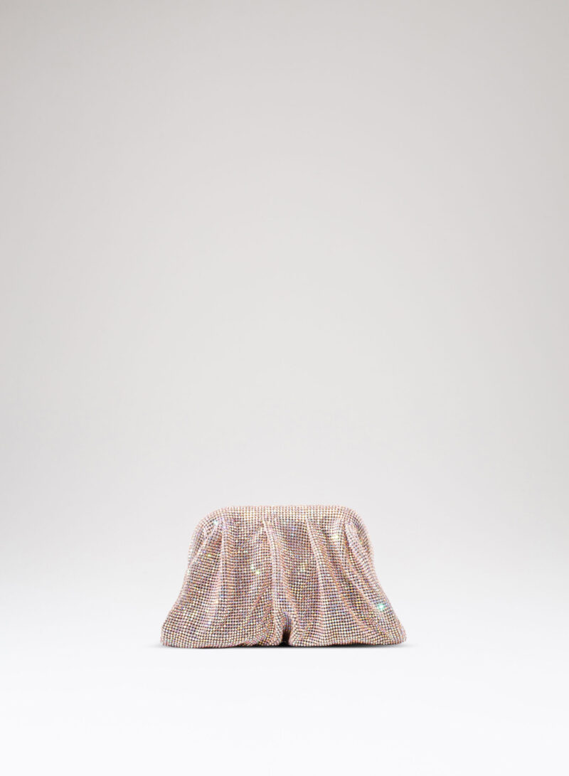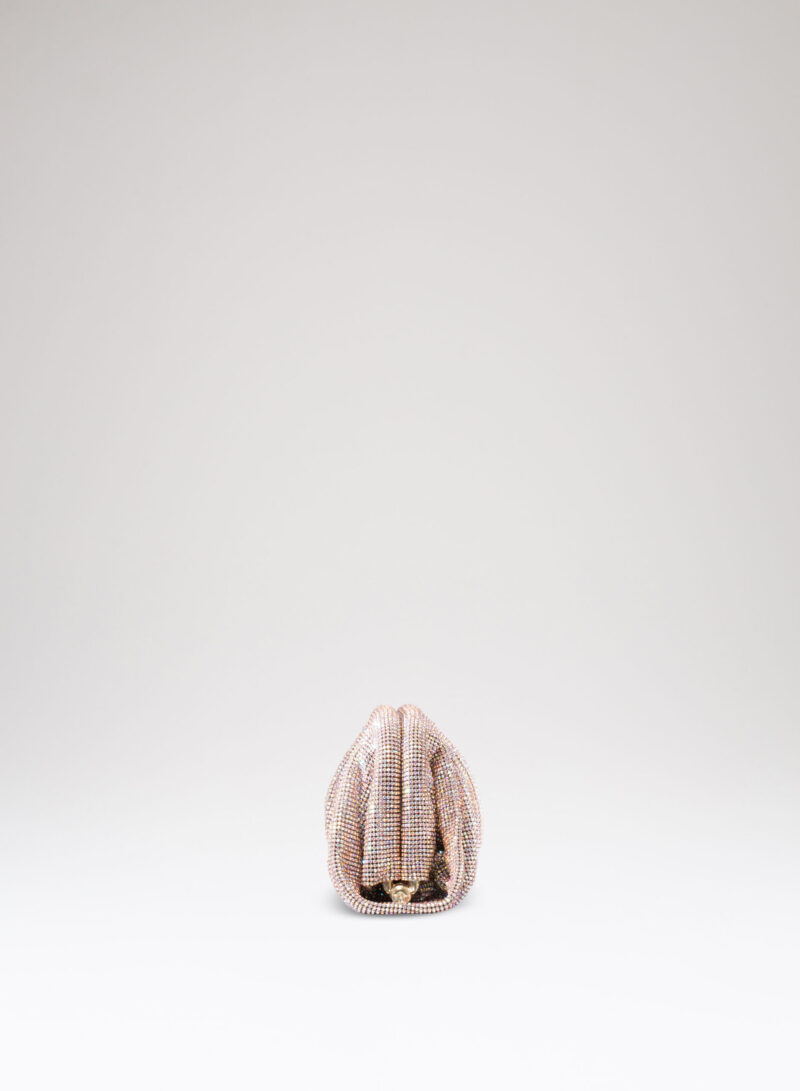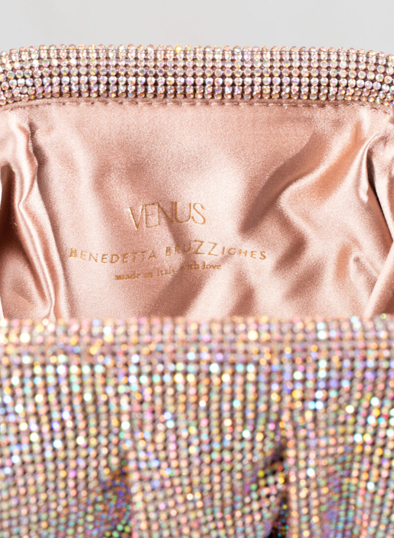 Dalle forme morbide e ondulate, Venus è realizzata con una rete di scintillanti cristalli cucita a mano con la stessa attenzione che si dedicherebbe a un gioiello. Al suo interno, una pochette in raso di seta è pronta ad accogliere il necessario per una serata fuori.