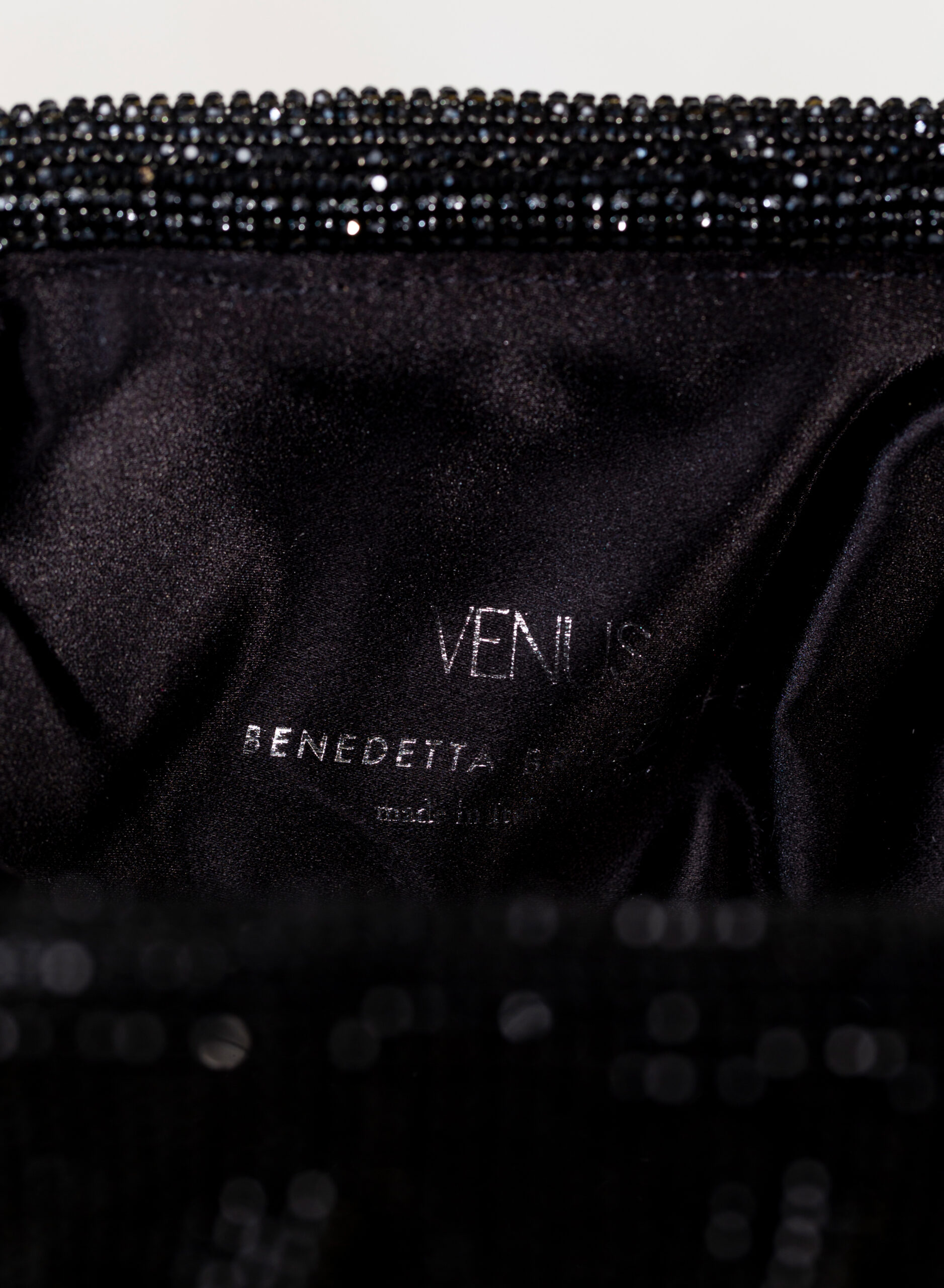 Accolgo l’amore che mi attraversa come un’onda che rotola, si frange sulla roccia e spuma. Come un acquazzone che fuma, ribolle e feconda la terra arsa. Come un profumo che sale dal mare, spande e satura l’aria d’intorno. Così il mio corpo rinasce in Venere. Questa pochette è un omaggio alla dea dell’Amore e della Bellezza e al magico momento in cui ogni donna, che ama ed è riamata, si trasforma. Da mortale diventa dea in una perfetta personificazione di Venere. Dalle forme morbide e ondulate, Venus è realizzata con una rete di scintillanti cristalli cucita a mano con la…